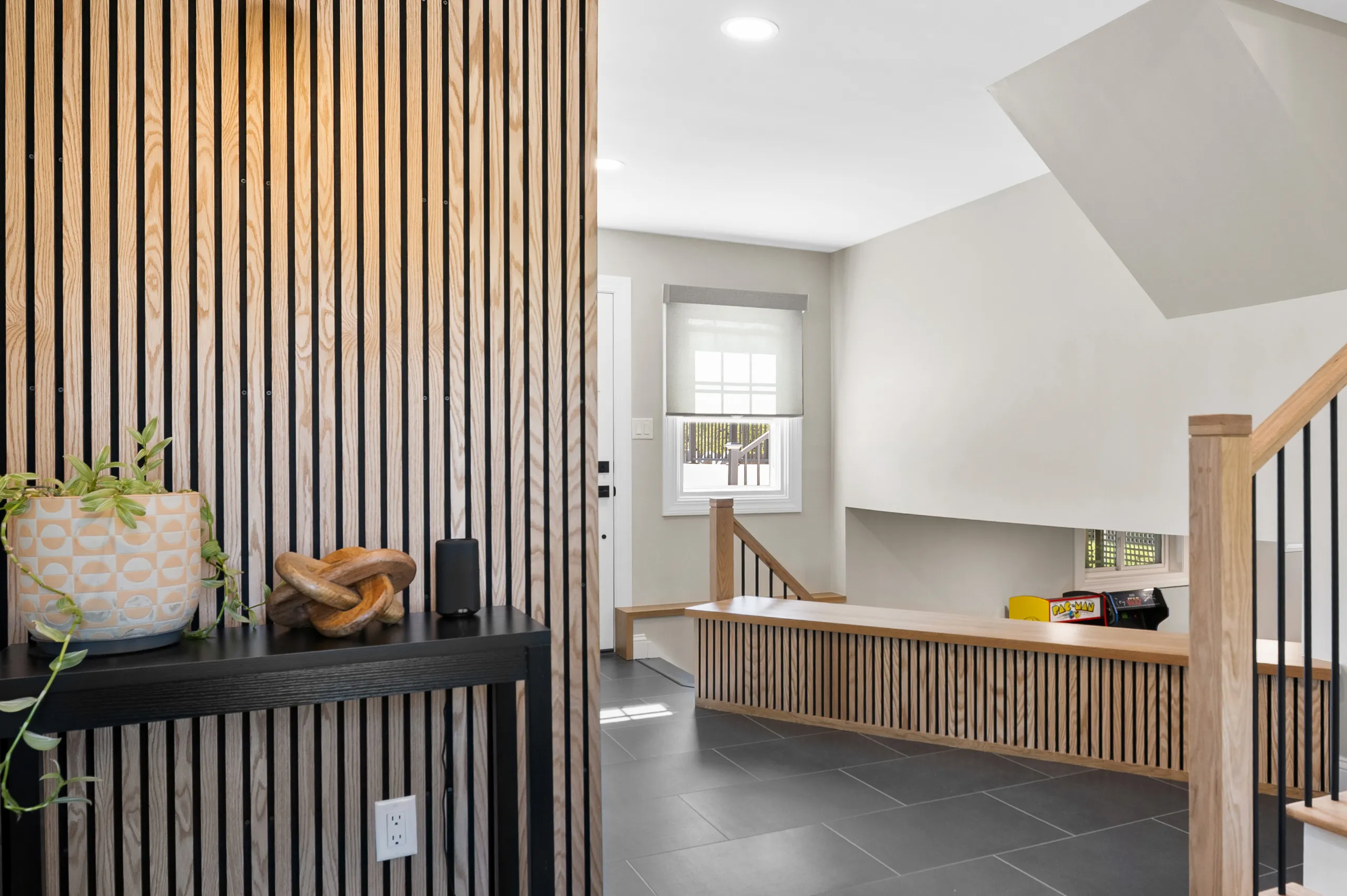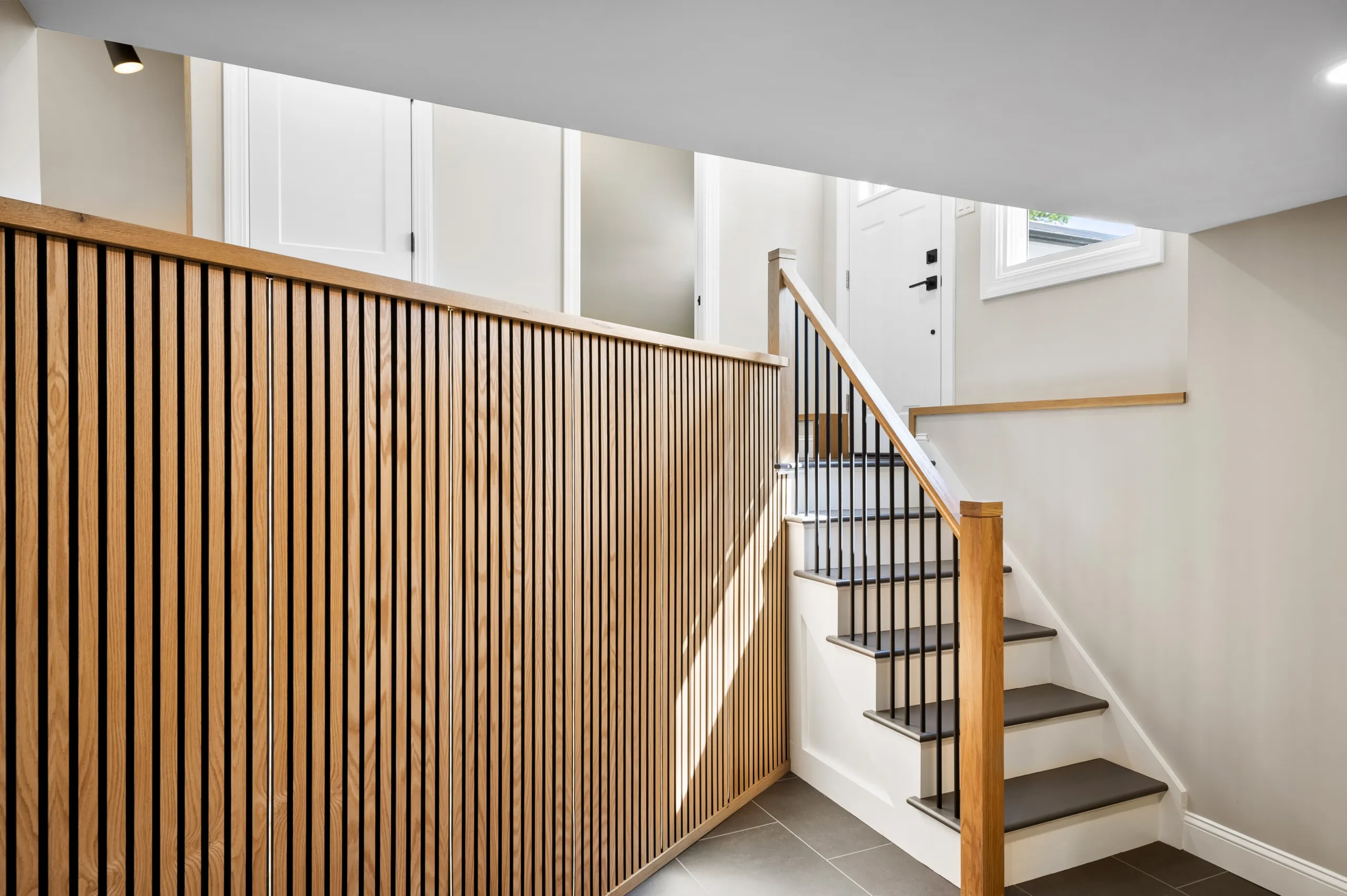 On the ground floor, the foyer was reimagined with LVT flooring, recessed lighting, and a dramatic slatted feature wall accented by modern sconces. An outdated closet was transformed into a contemporary powder room featuring a floating vanity, a stone-look countertop, and a slate-look chevron tile backsplash. And the biggest challenge of this project was converting the once-awkward basement overlook into a bold design element. It is now a slatted LED feature wall that ties the home’s modern aesthetic together across every level.