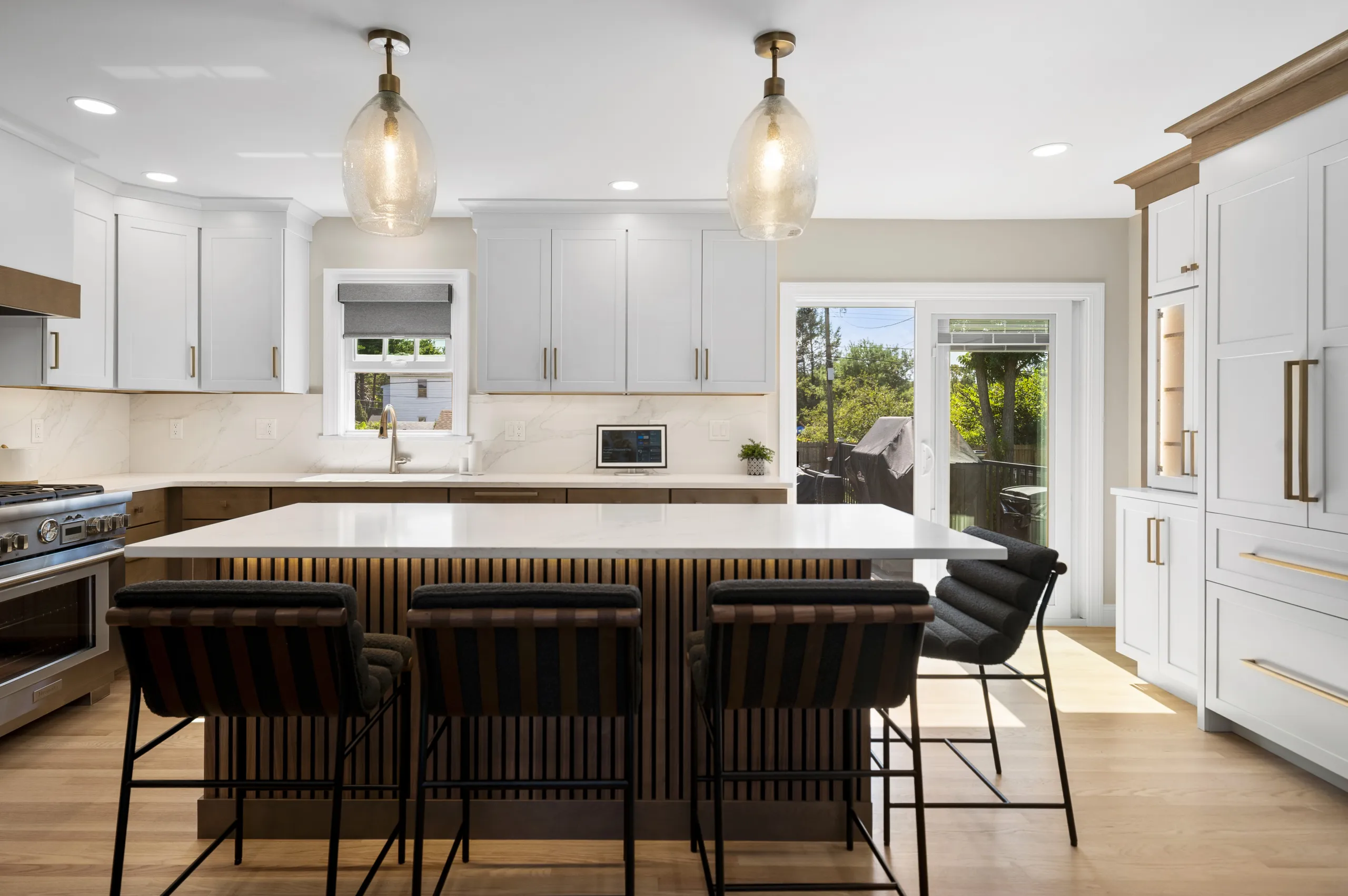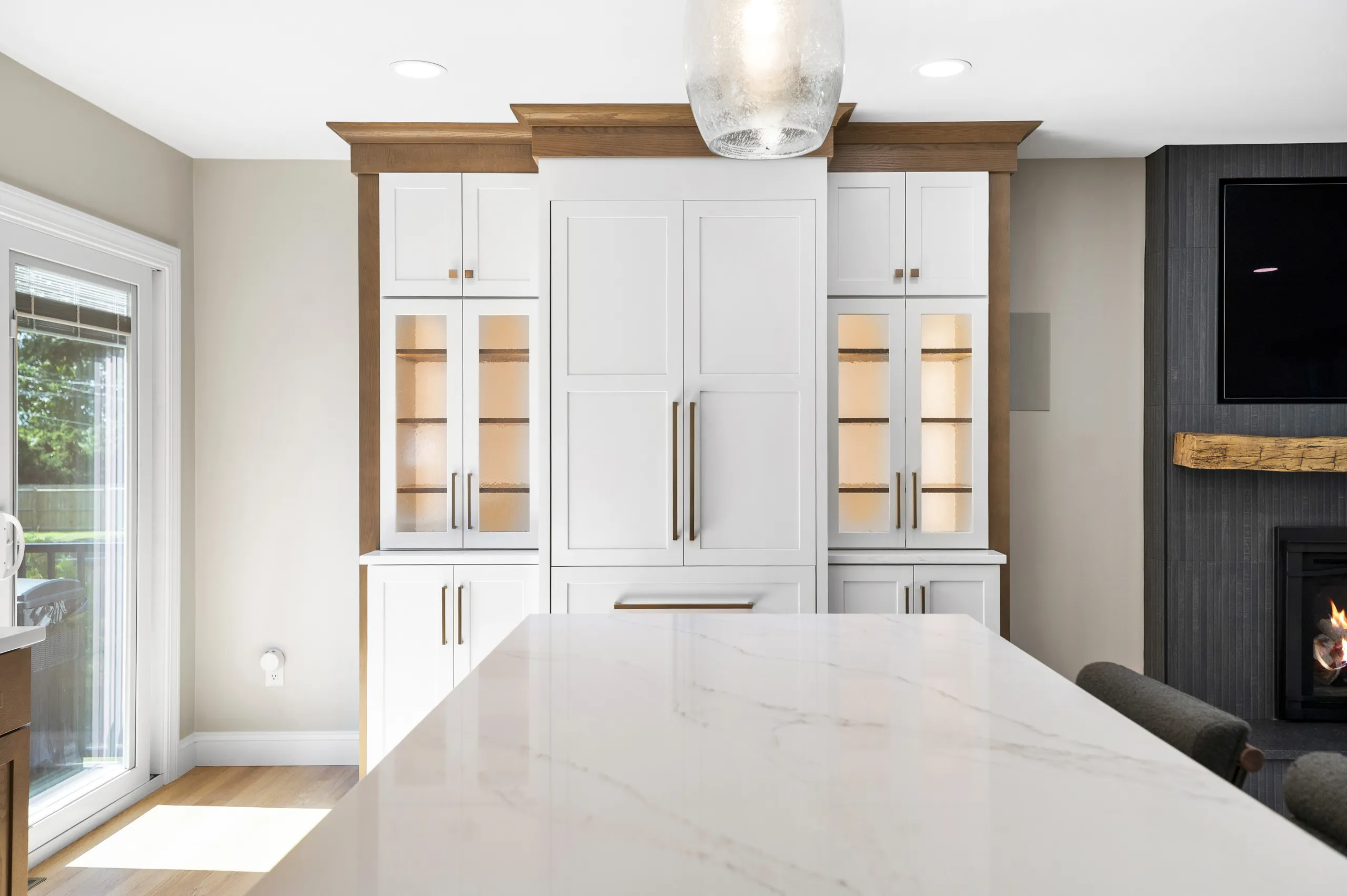 The look and feel of this full home remodel all started with the kitchen. In it, we designed two-tone cabinetry complete with under-cabinet lighting and a custom-built-in surround for the hidden, panelized refrigerator. In-cabinet lighting next to the fridge creates a warm glow that highlights the accent pieces that these homeowners love. We installed quartz countertops throughout, along with a matching quartz backsplash, brushed gold hardware, and all-new appliances, including a concealed dishwasher and a beverage fridge. At the heart of the kitchen sits an island, detailed with a slatted wall and illuminated by LED accent lighting below and oversized pendants above.