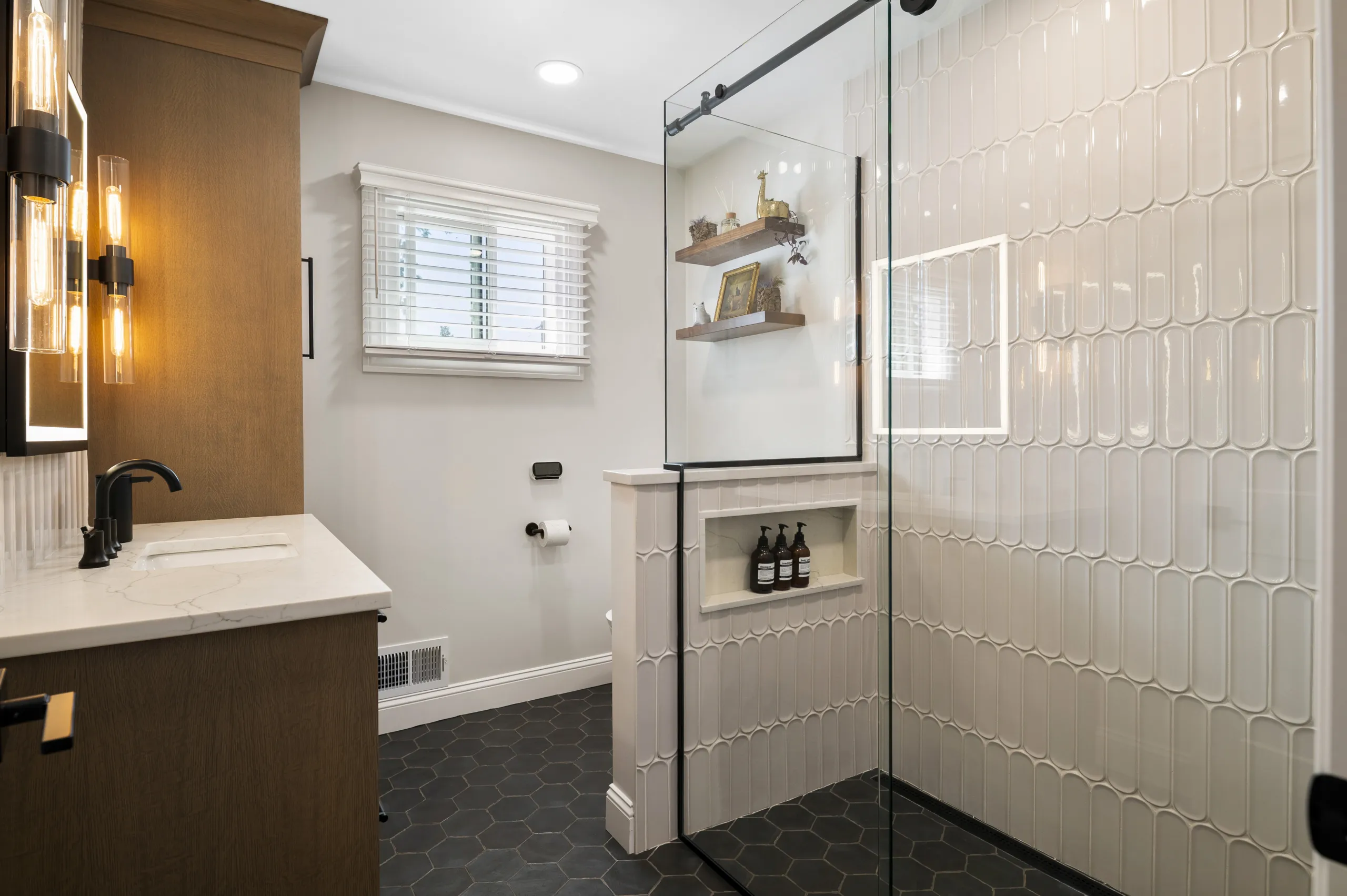 Upstairs, we refreshed each bedroom and the hallway with custom walls. One room features wainscoted walls, another venetian plaster, and another batten walls. The highlight of the upstairs, though, is the luxurious bathroom. It has heated hexagon flooring, a curbless walk-in shower with wraparound glass, and a smart toilet tucked behind a privacy wall . A ribbed vanity, with a finish similar to the kitchen cabinetry, anchors the space. The room is rounded out with matte black fixtures, a floor-to-ceiling storage cabinet, and an LED smart mirror/medicine cabinet flanked by dual-bulb sconces.