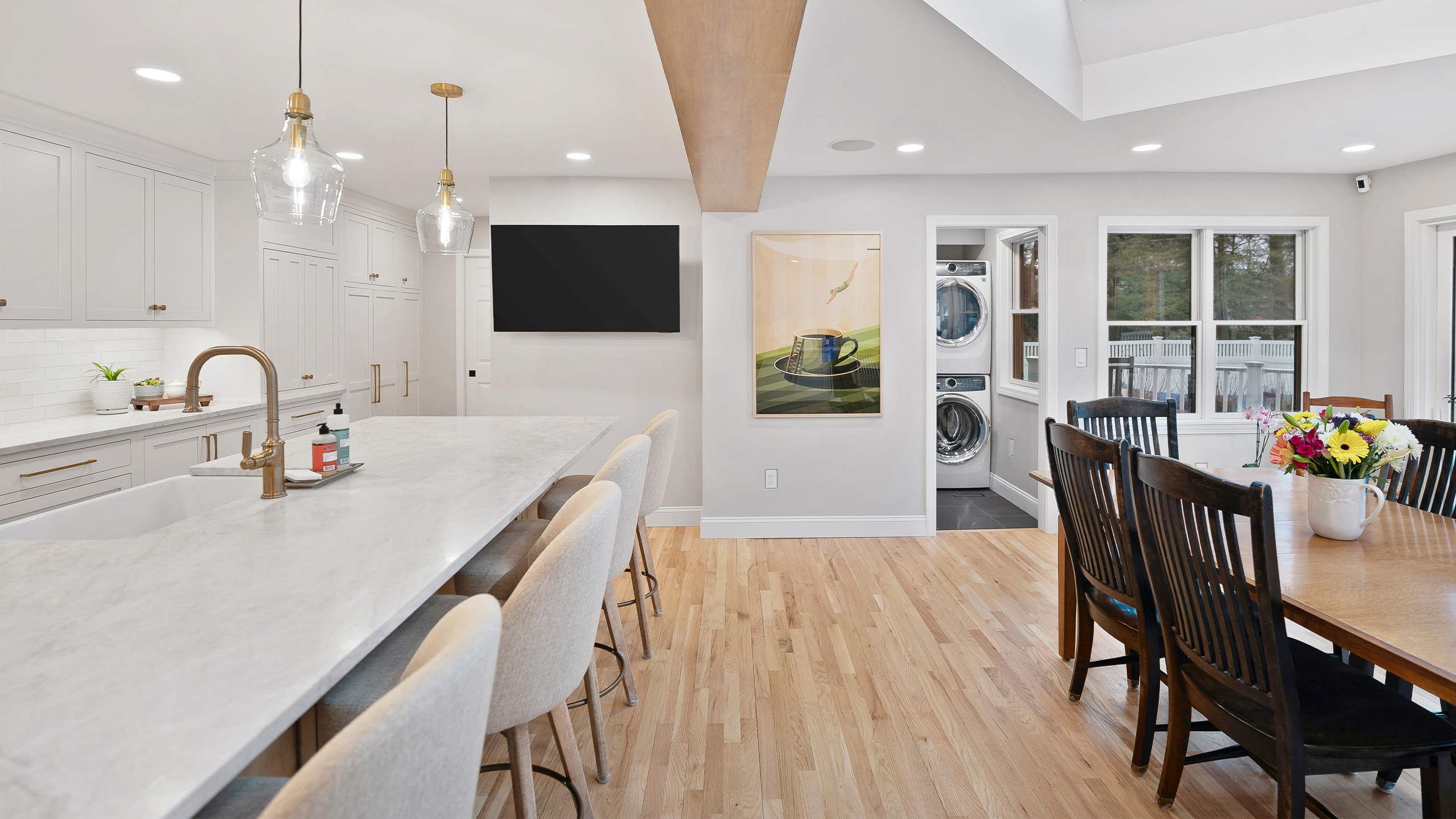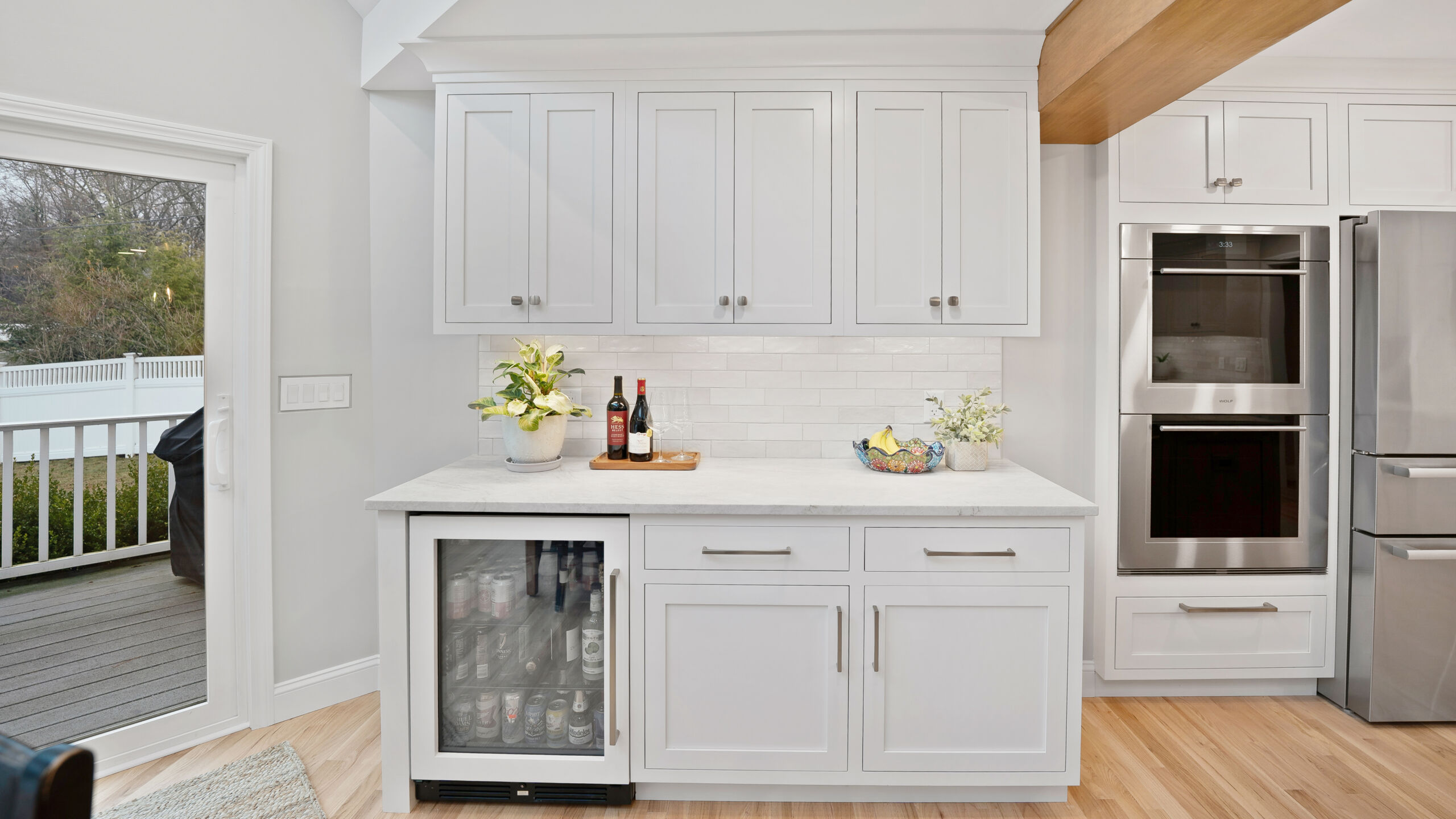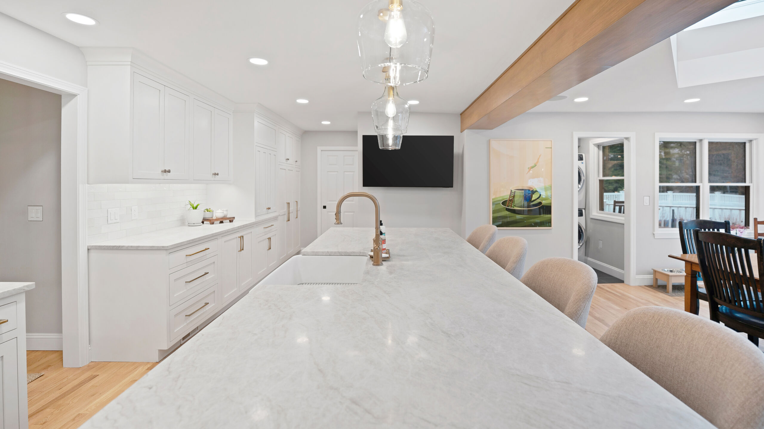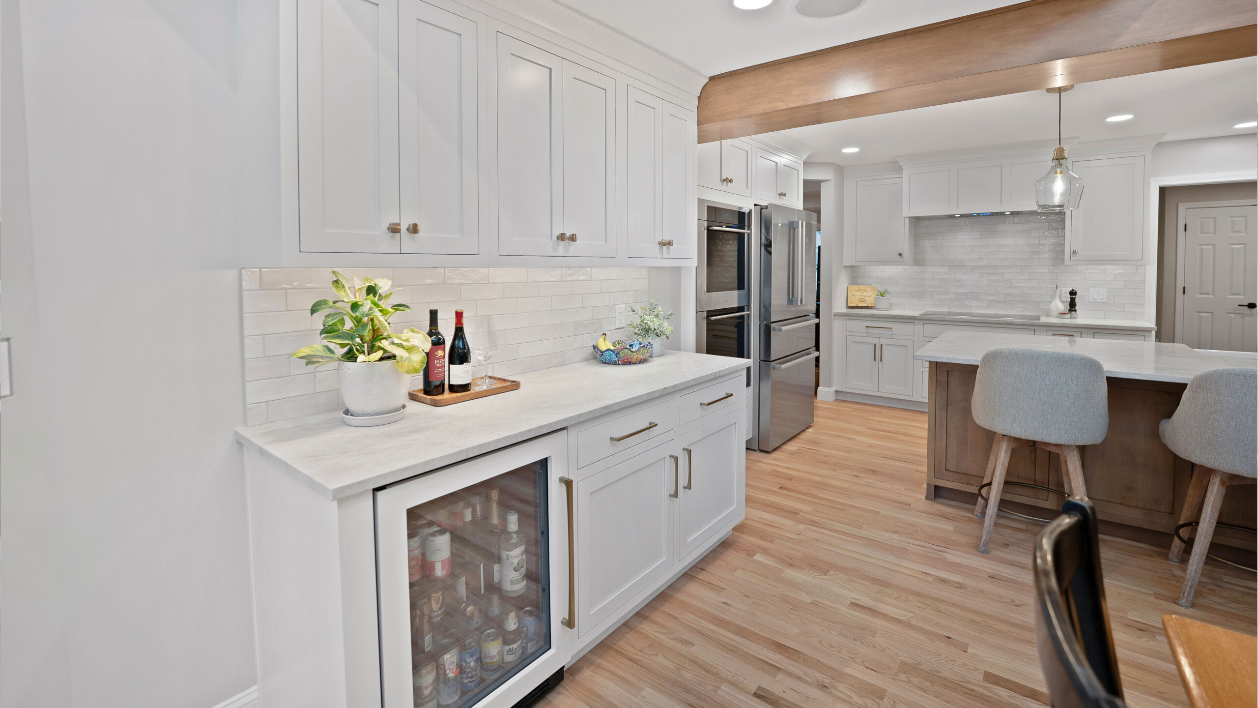 The updated kitchen embraces a lighter, more natural aesthetic, replacing the previous darker cherry finishes with off-white perimeter cabinetry and a select alder island. Taj Mahal quartzite countertops, a must-have for the homeowner, serve as a focal point that ties the entire design together. A reworked pantry near the powder bath improves storage and accessibility, while a built-in hidden desk area adds everyday convenience. The addition of a beverage area near the dining area and back patio makes entertaining effortless. Flooring was refinished to align with the new, lighter palette, while recessed lighting was updated to better suit the redesigned layout.