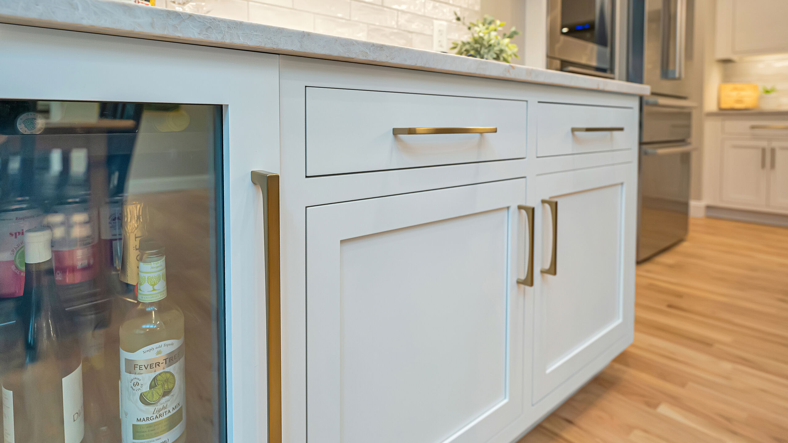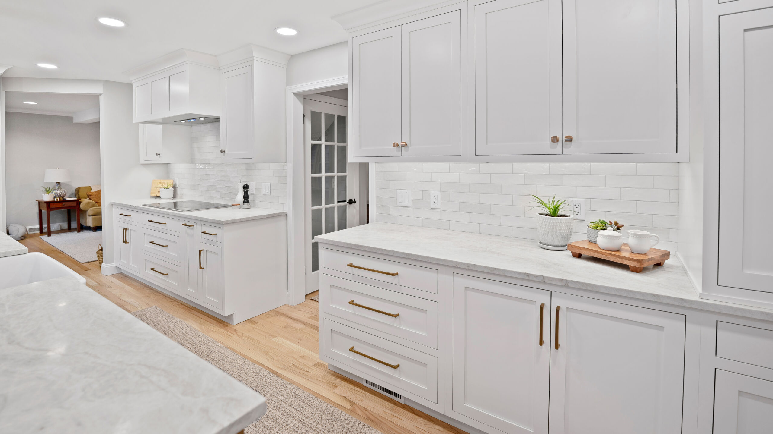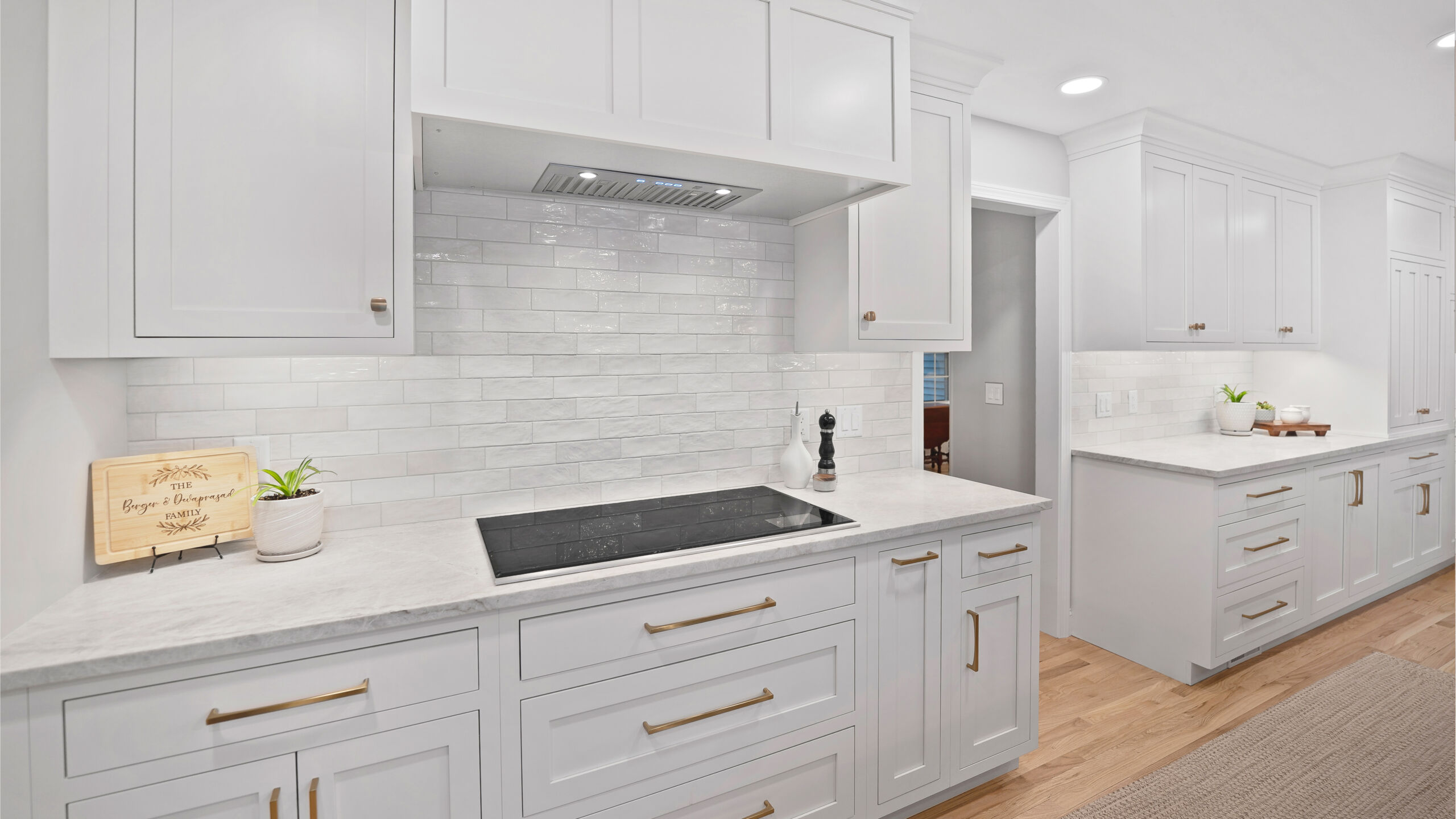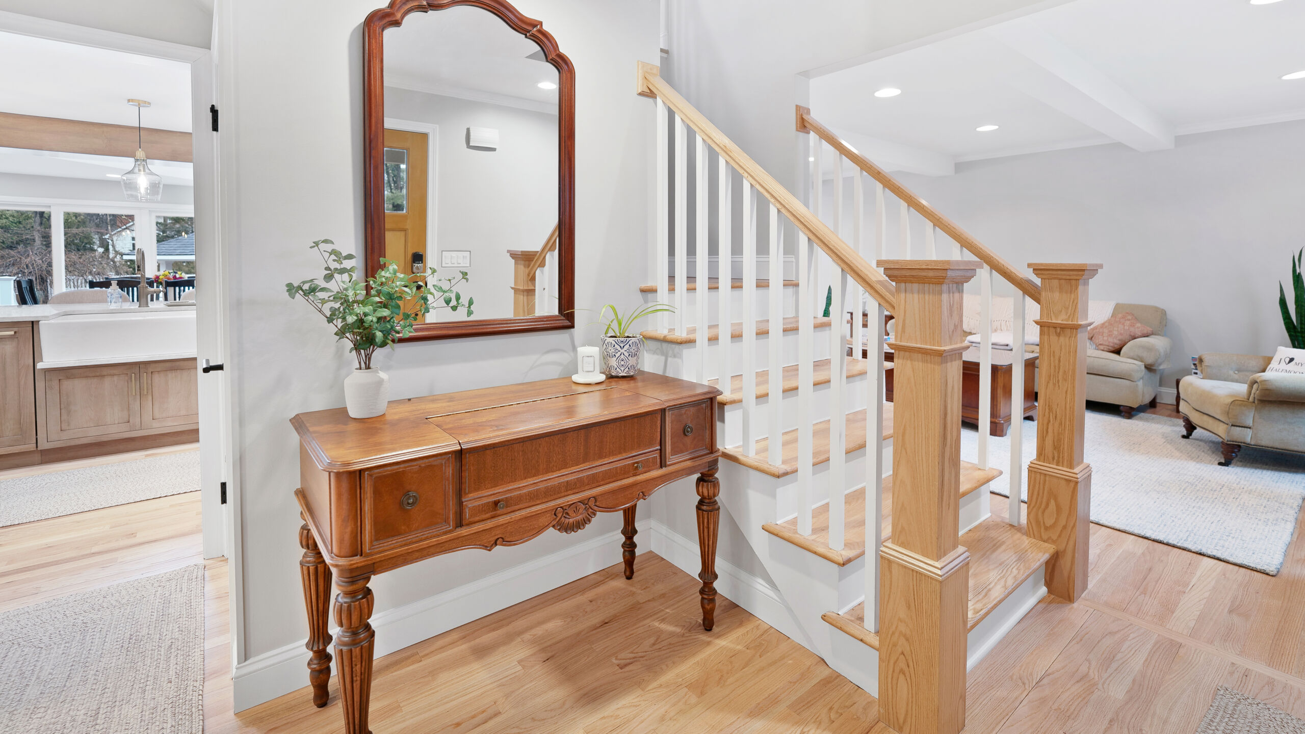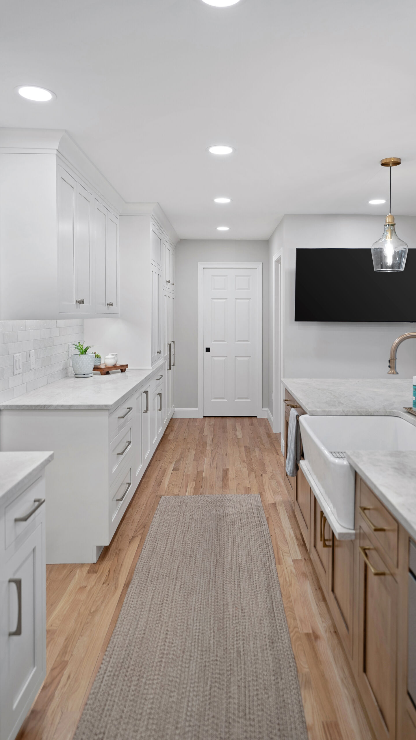 The updated kitchen embraces a lighter, more natural aesthetic, replacing the previous darker cherry finishes with off-white perimeter cabinetry and a select alder island. Taj Mahal quartzite countertops, a must-have for the homeowner, serve as a focal point that ties the entire design together. A reworked pantry near the powder bath improves storage and accessibility, while a built-in hidden desk area adds everyday convenience. The addition of a beverage area near the dining area and back patio makes entertaining effortless. Flooring was refinished to align with the new, lighter palette, while recessed lighting was updated to better suit the redesigned layout.
