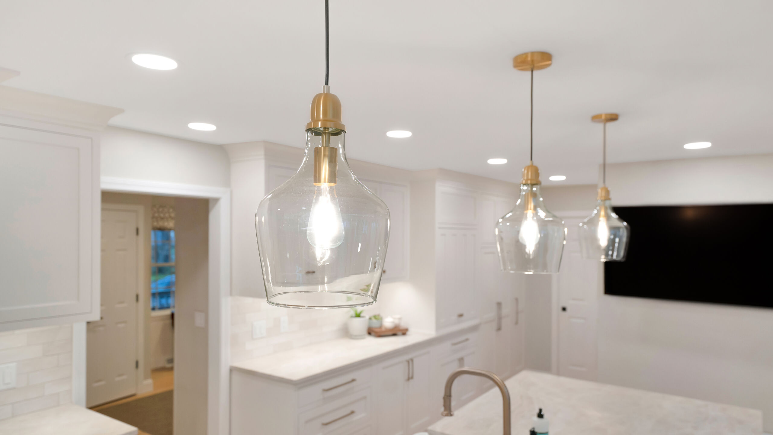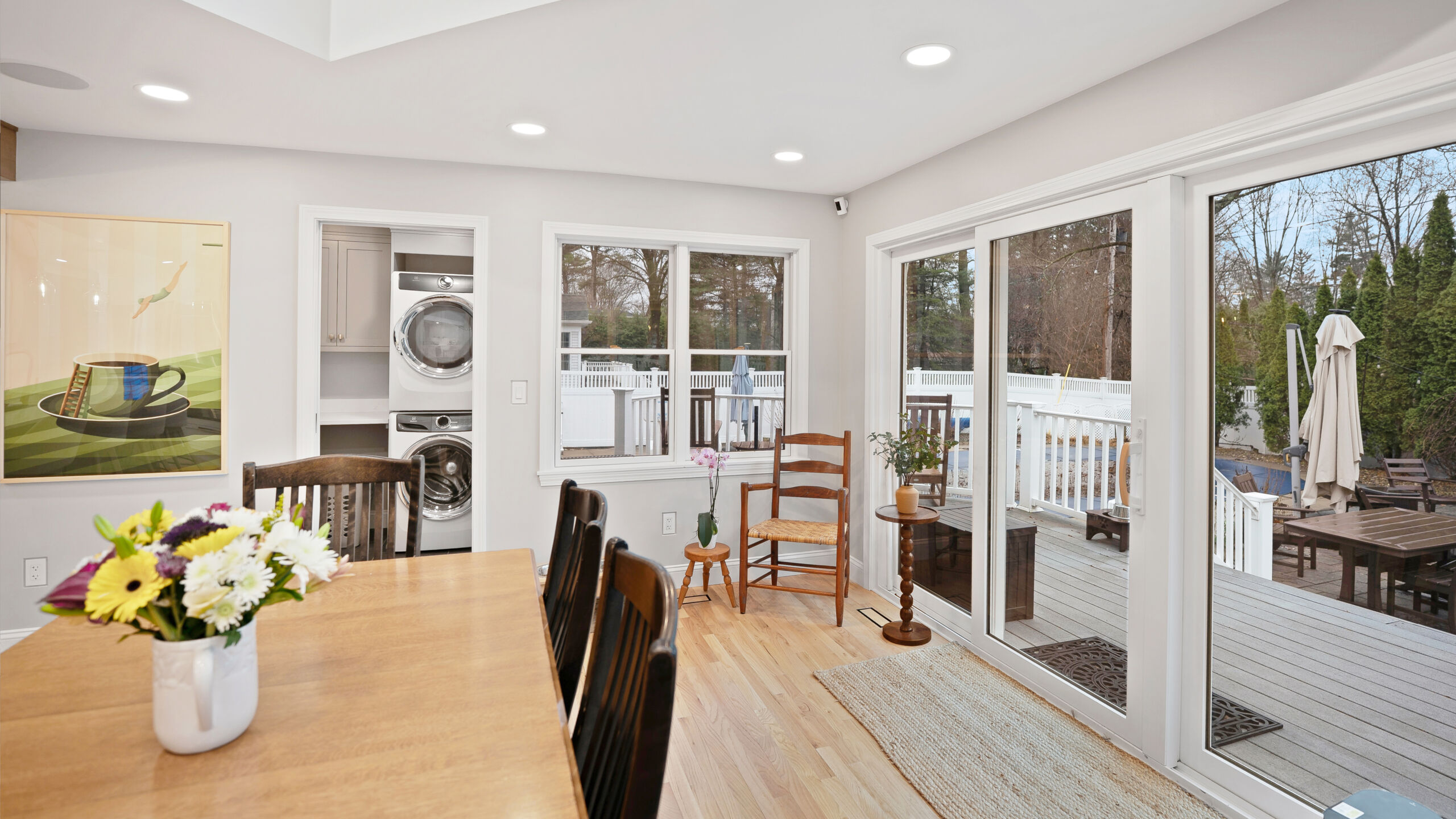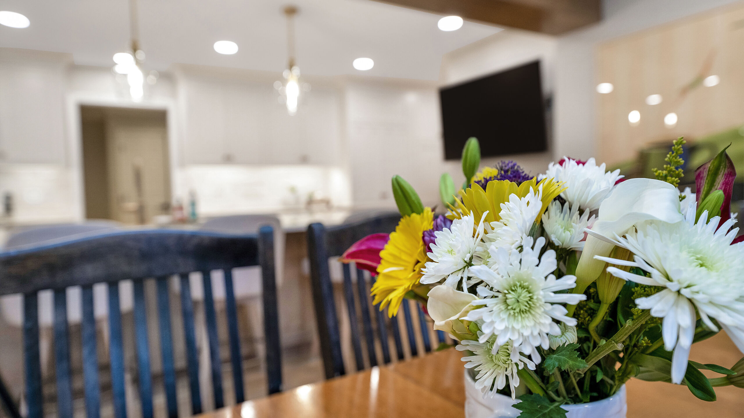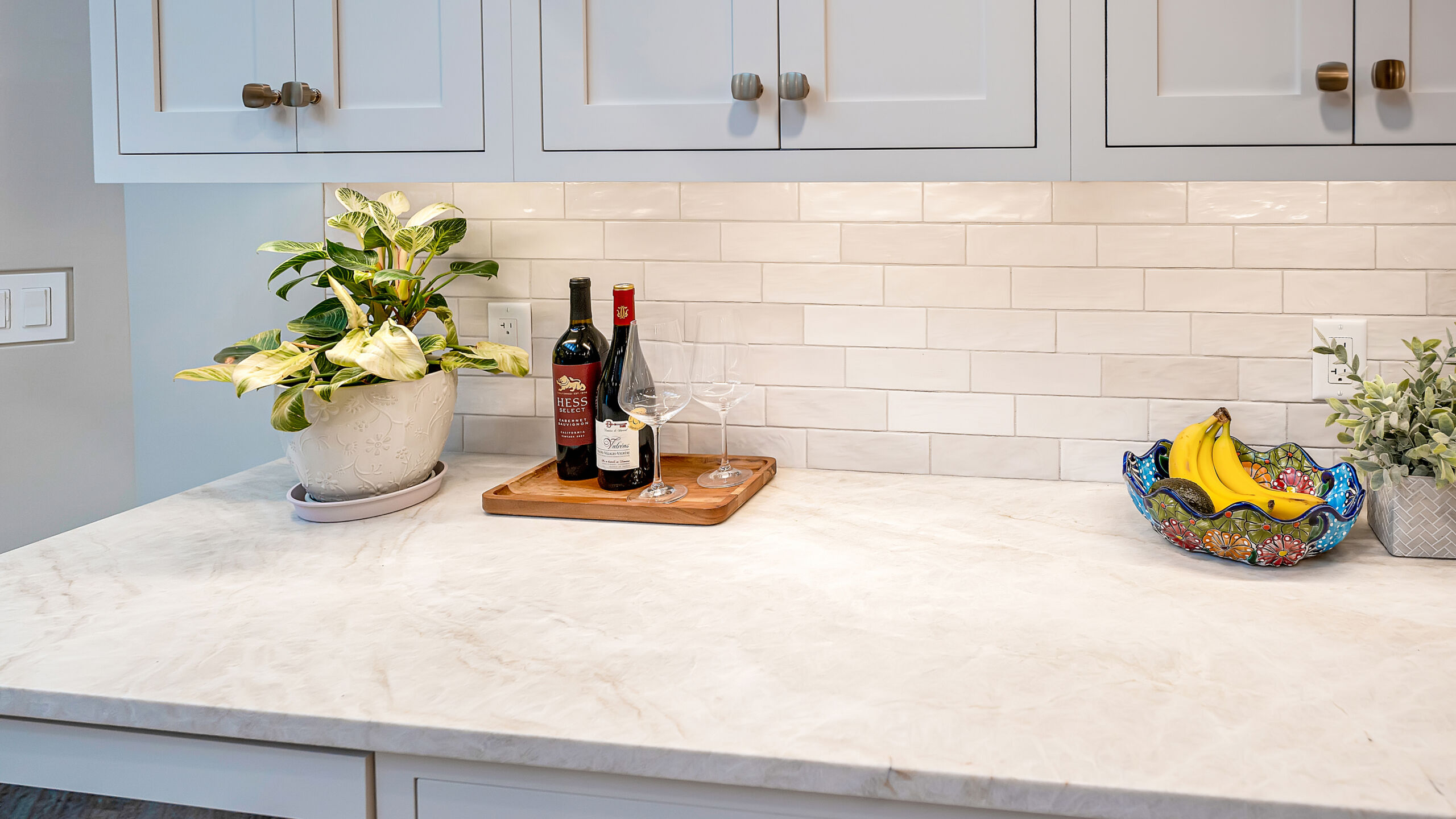 The updated kitchen embraces a lighter, more natural aesthetic, replacing the previous darker cherry finishes with off-white perimeter cabinetry and a select alder island. Taj Mahal quartzite countertops, a must-have for the homeowner, serve as a focal point that ties the entire design together. A reworked pantry near the powder bath improves storage and accessibility, while a built-in hidden desk area adds everyday convenience. The addition of a beverage area near the dining area and back patio makes entertaining effortless. Flooring was refinished to align with the new, lighter palette, while recessed lighting was updated to better suit the redesigned layout.