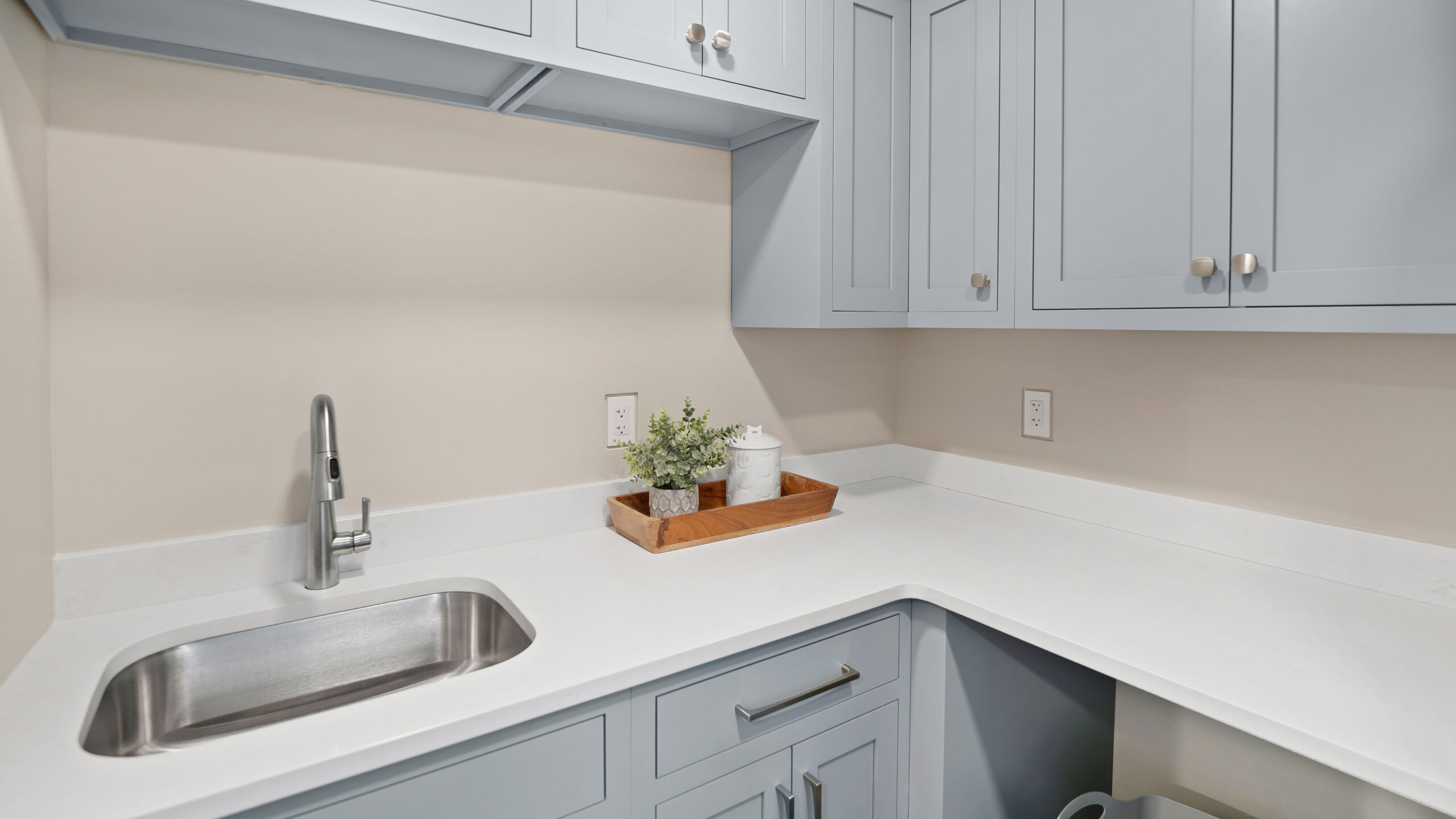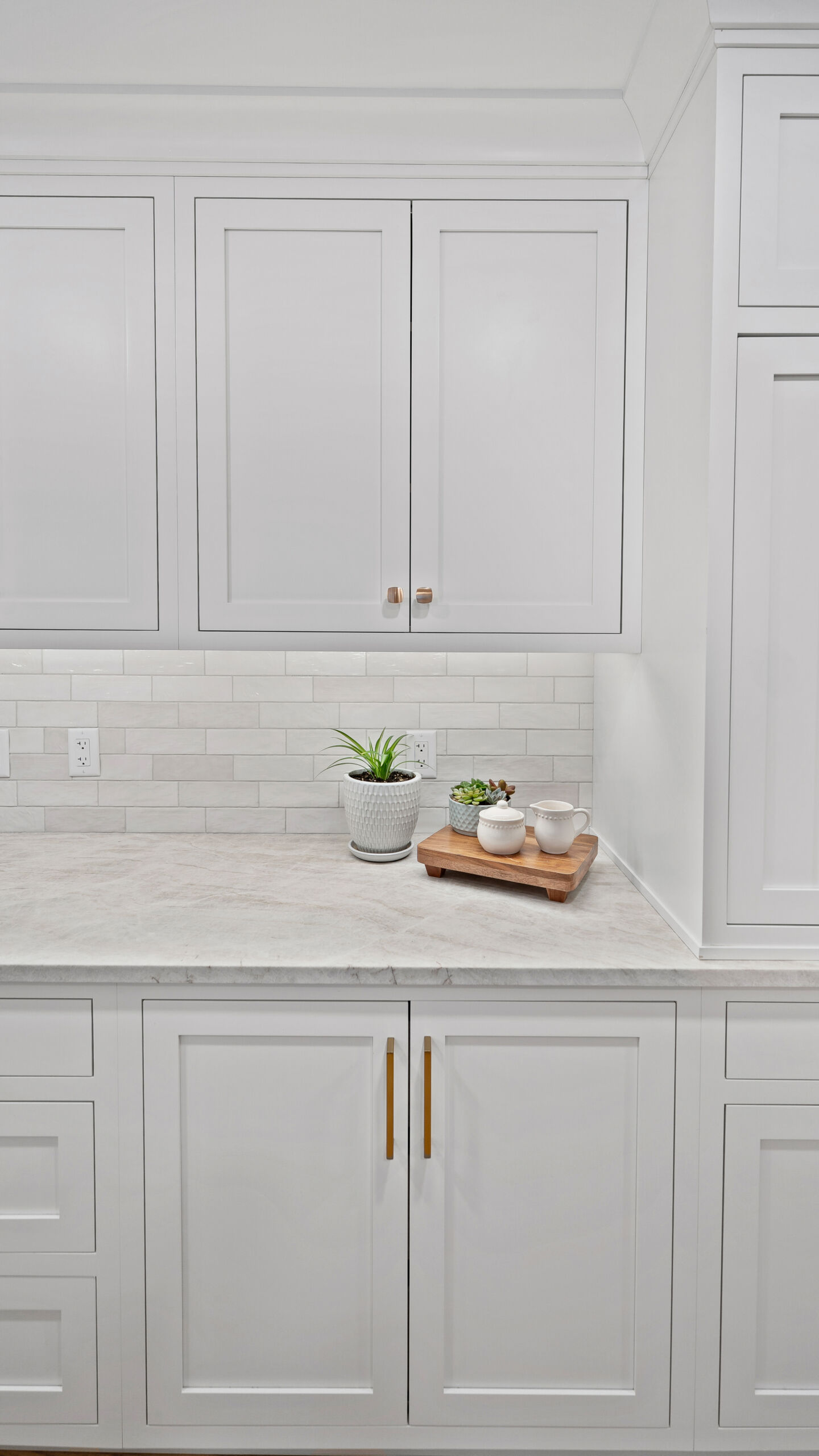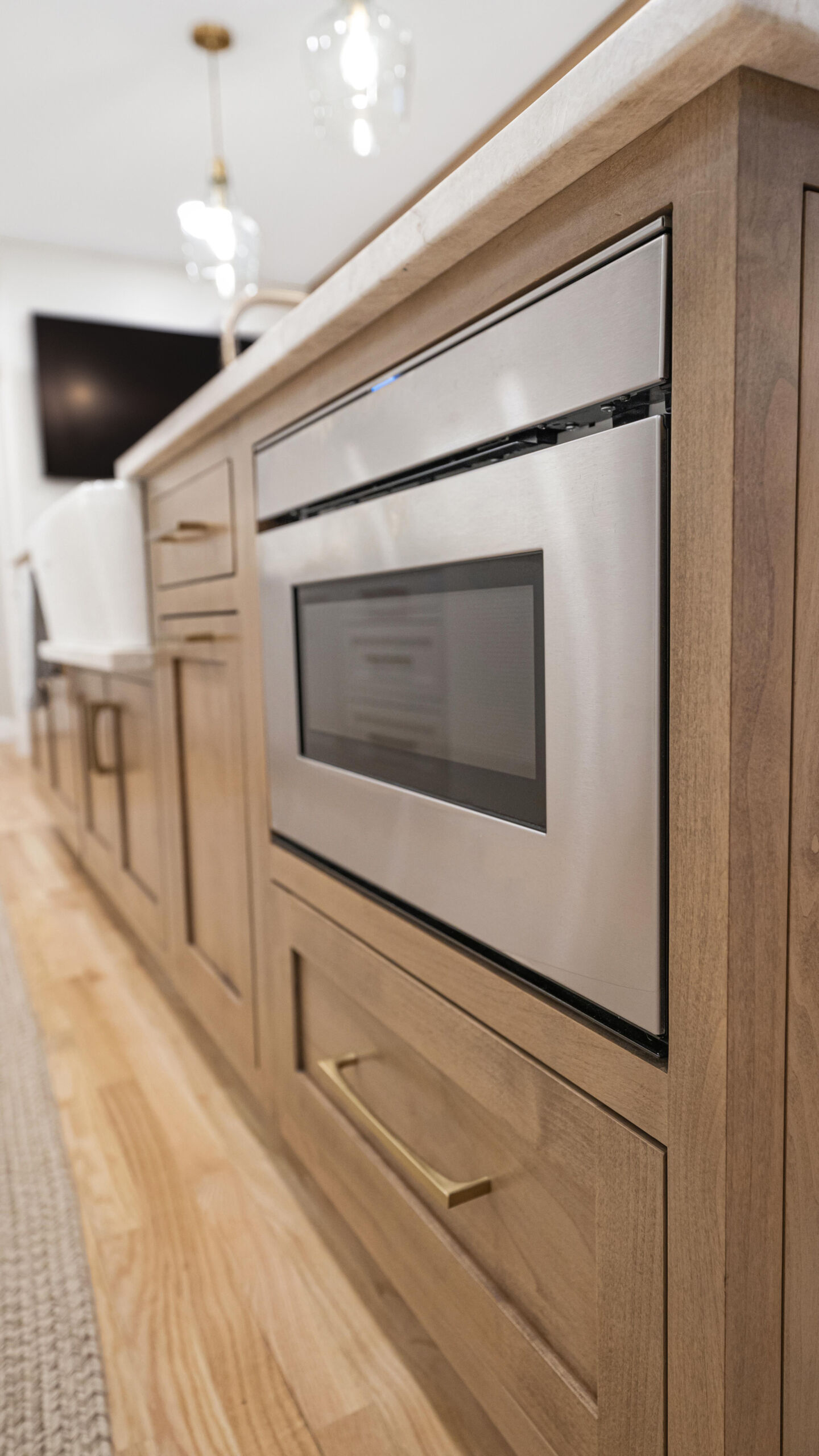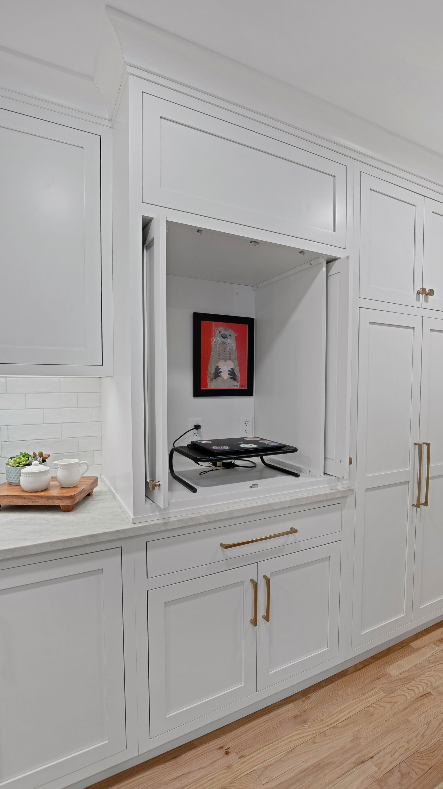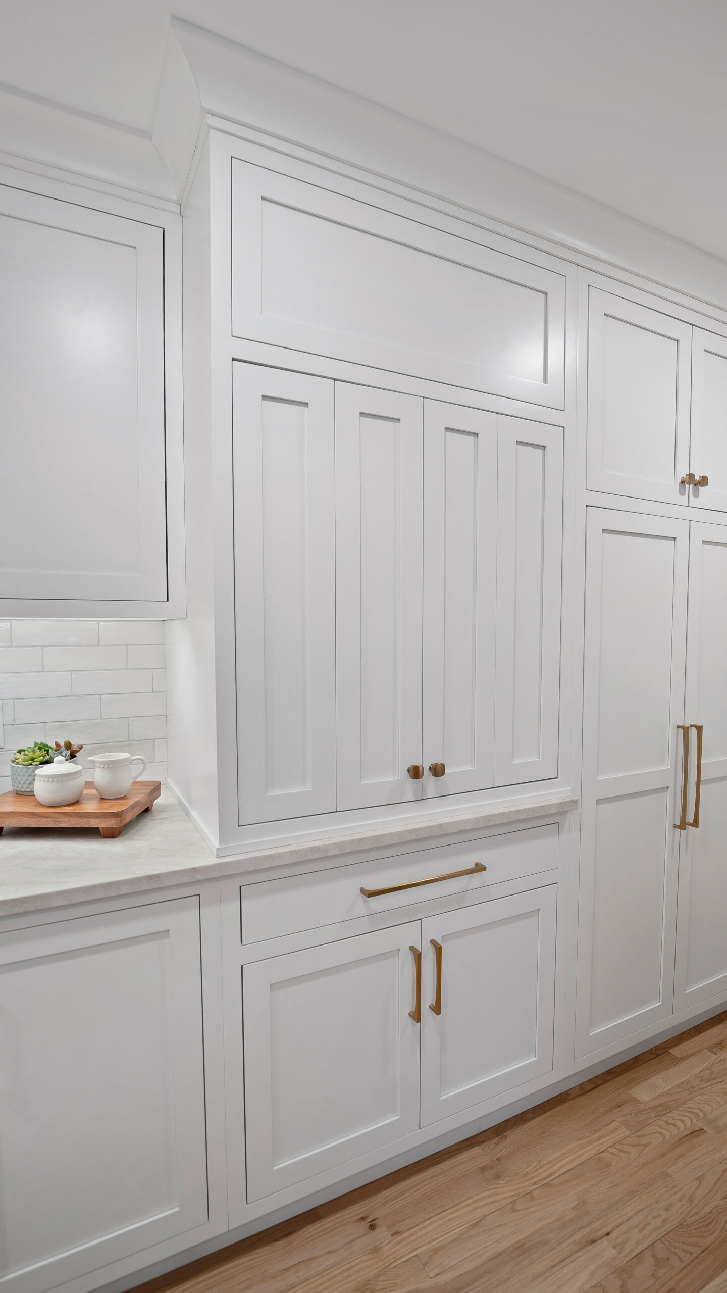The updated kitchen embraces a lighter, more natural aesthetic, replacing the previous darker cherry finishes with off-white perimeter cabinetry and a select alder island. Taj Mahal quartzite countertops, a must-have for the homeowner, serve as a focal point that ties the entire design together. A reworked pantry near the powder bath improves storage and accessibility, while a built-in hidden desk area adds everyday convenience. The addition of a beverage area near the dining area and back patio makes entertaining effortless. Flooring was refinished to align with the new, lighter palette, while recessed lighting was updated to better suit the redesigned layout.