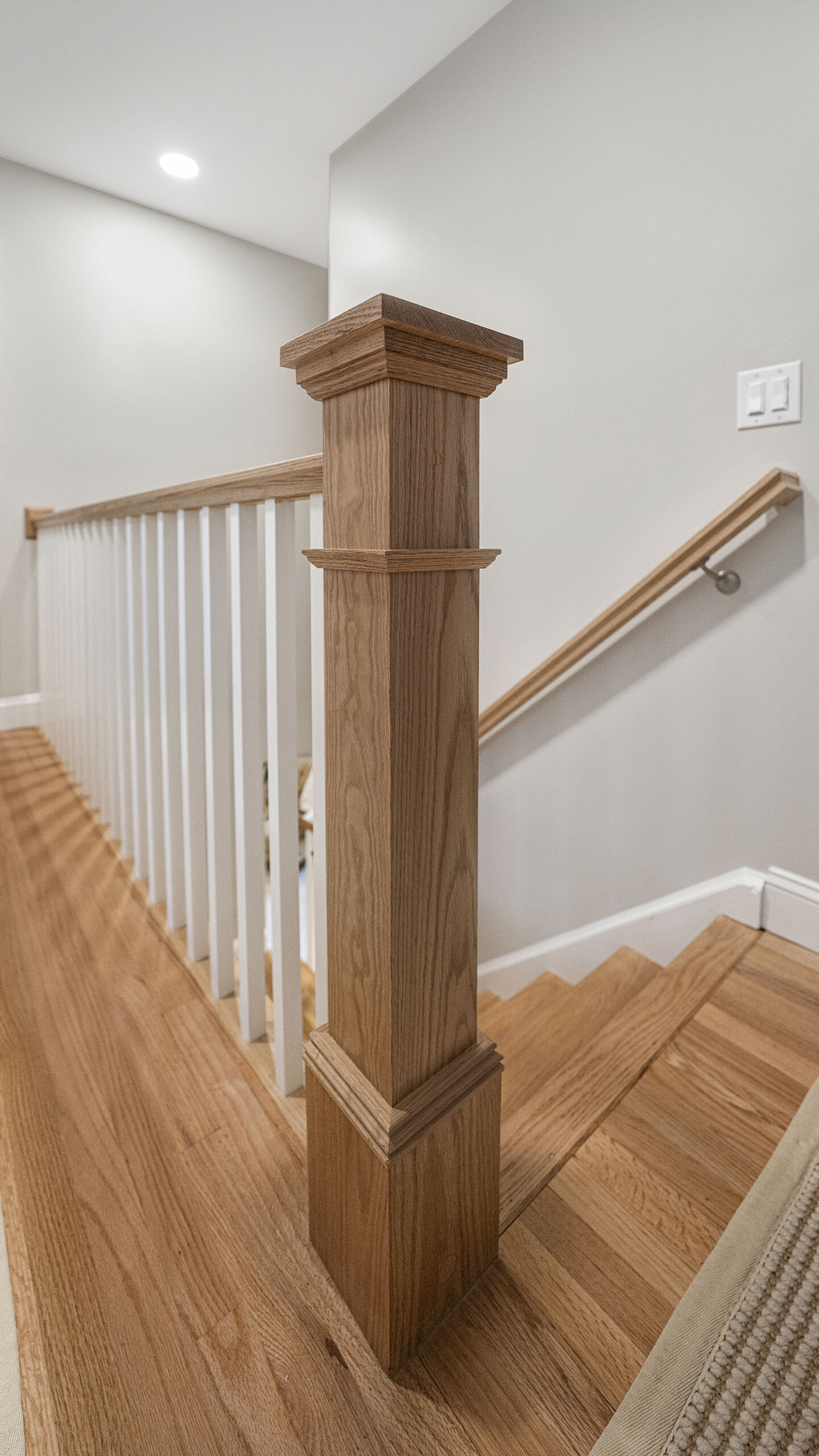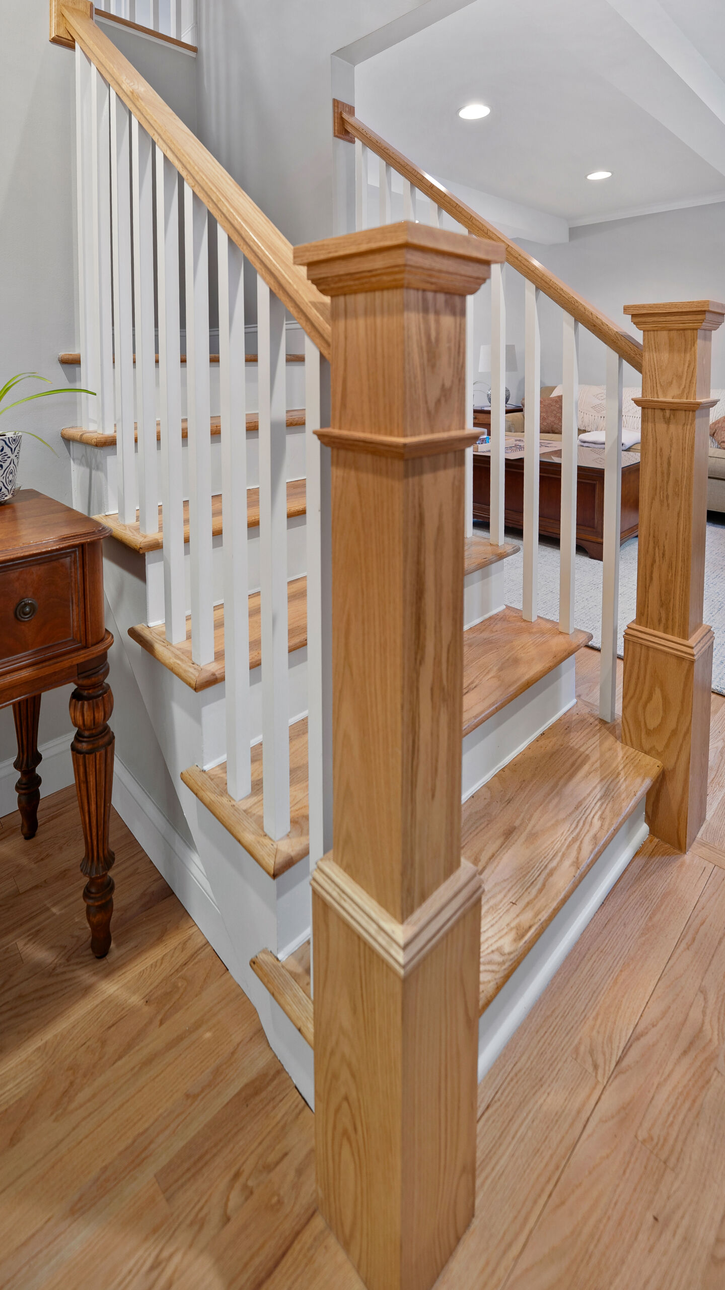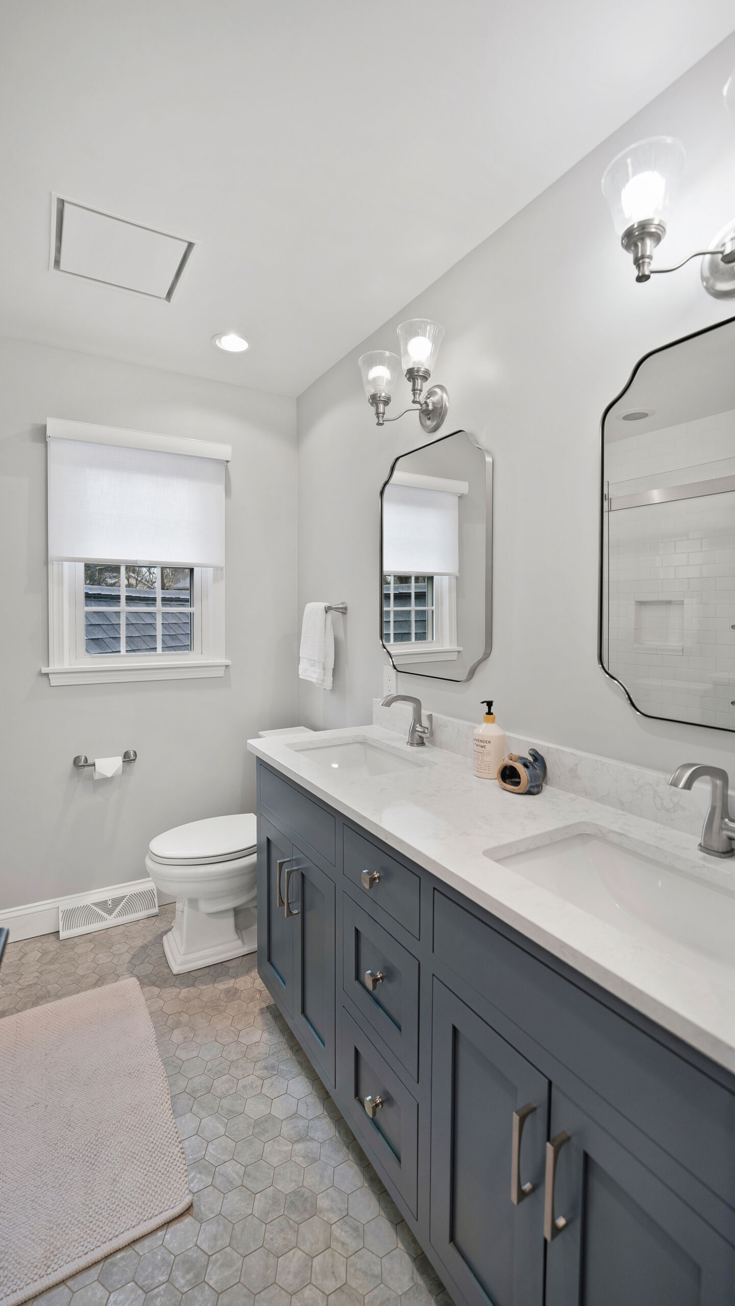With the major layout improvements done around the kitchen, we also updated a few other spots in their home. The staircase got the same treatment as the old cabinets in the kitchen. We replace the outdated, darker style railings with a modern, lighter wood. And going up the beautiful new stairs will lead you to the guest bathroom, where we installed some new hex floor tile, a custom Mouser vanity, and brilliant stainless steel fixtures.