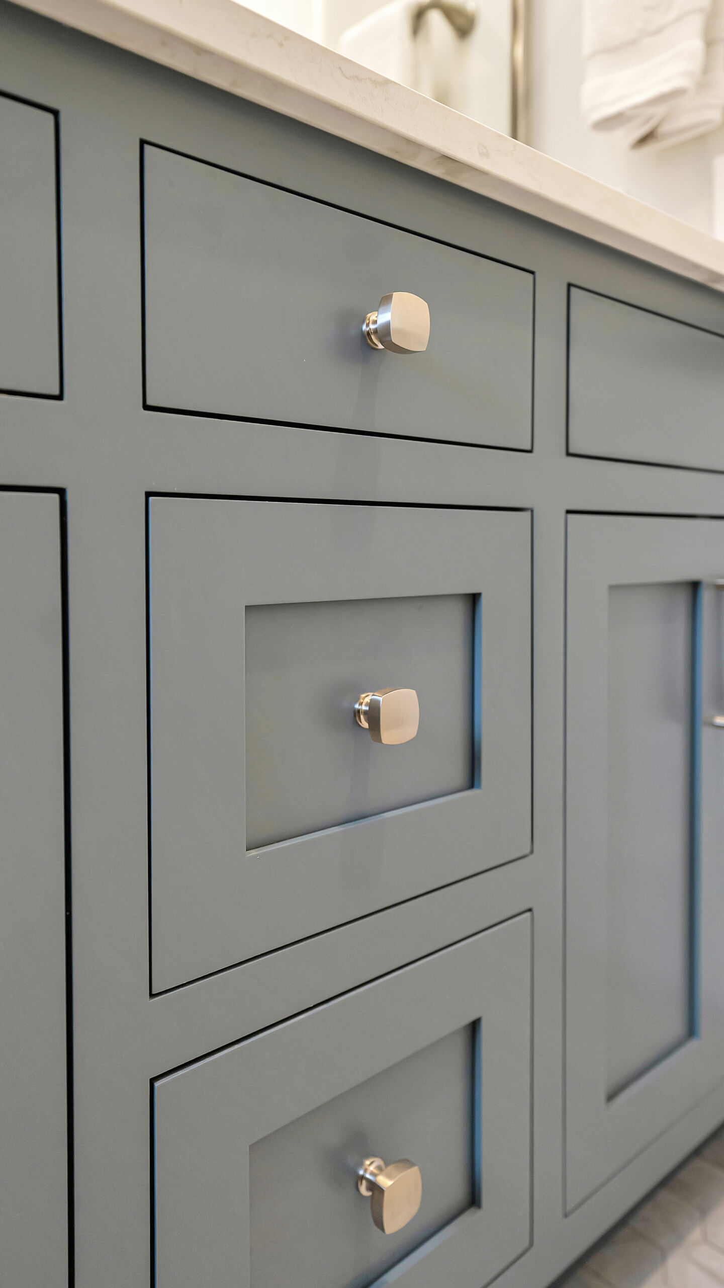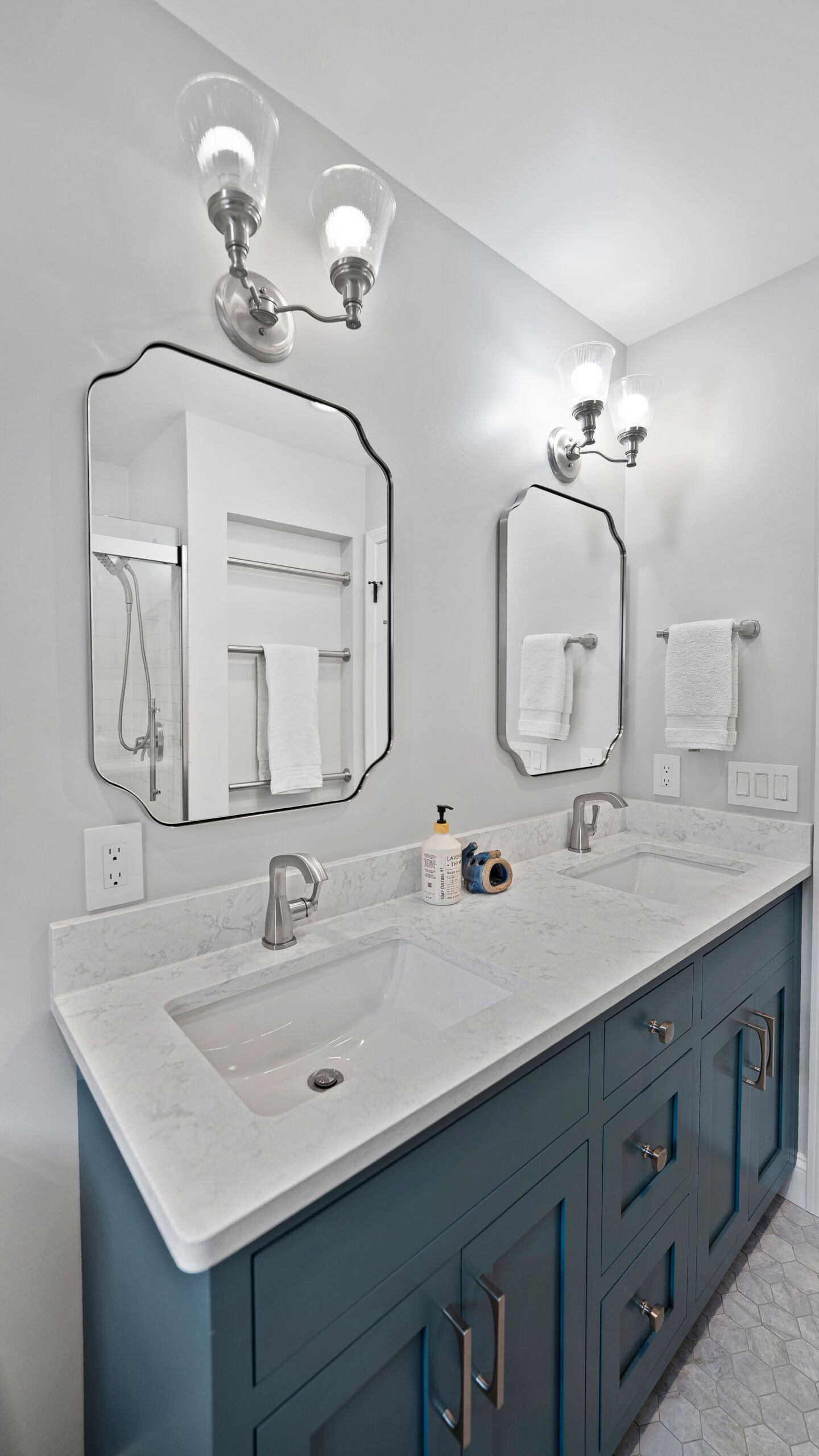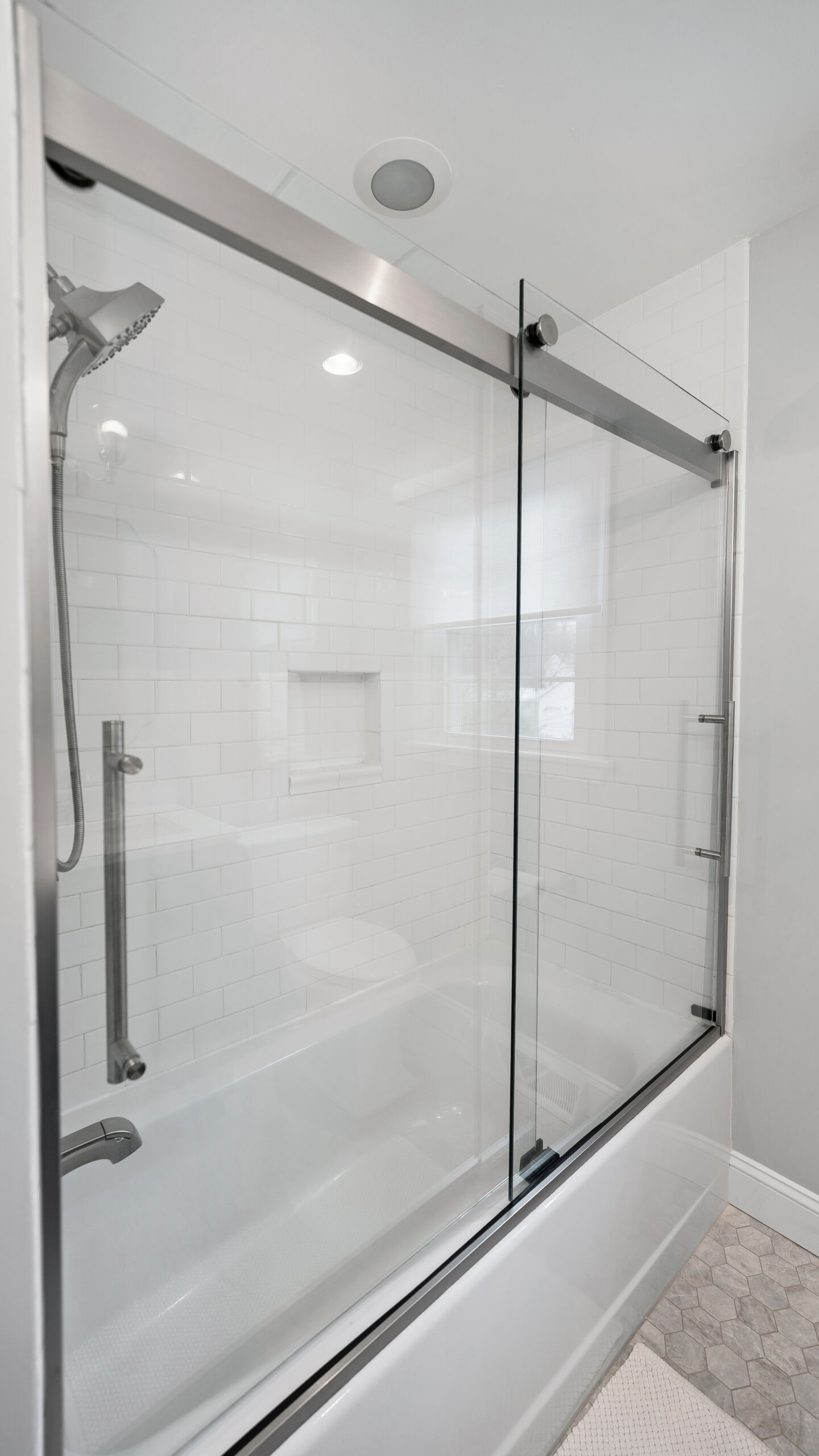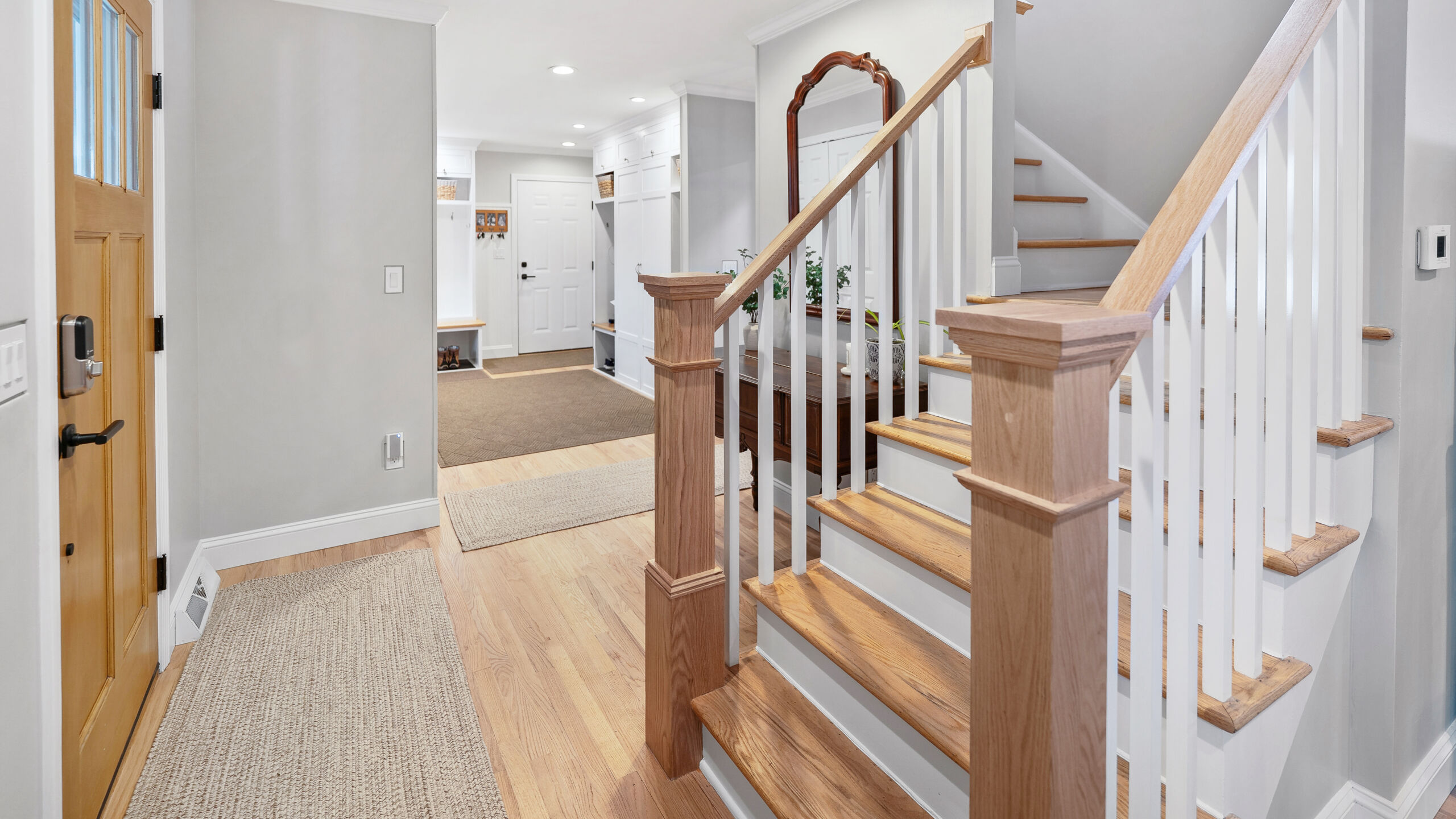With the major layout improvements done around the kitchen, we also updated a few other spots in their home. The staircase got the same treatment as the old cabinets in the kitchen. We replace the outdated, darker style railings with a modern, lighter wood. And going up the beautiful new stairs will lead you to the guest bathroom, where we installed some new hex floor tile, a custom Mouser vanity, and brilliant stainless steel fixtures.
