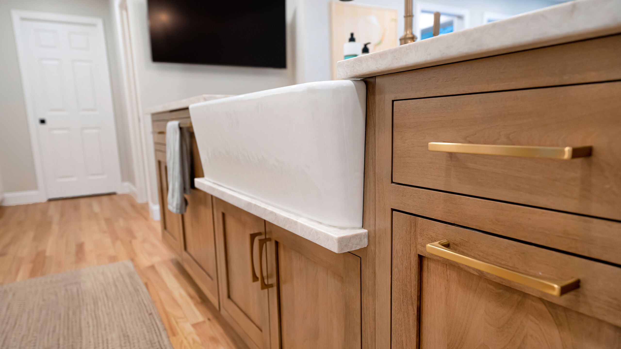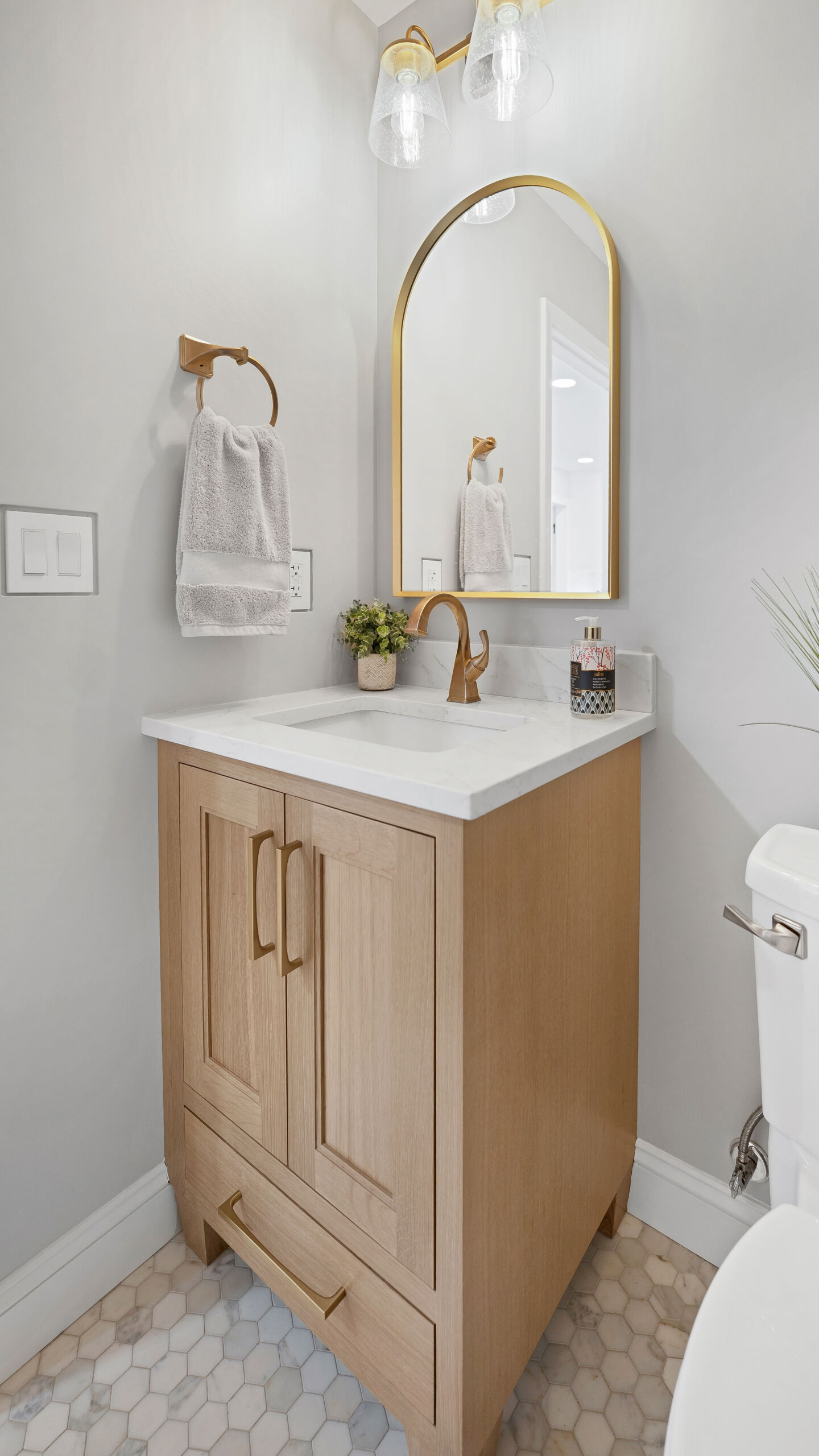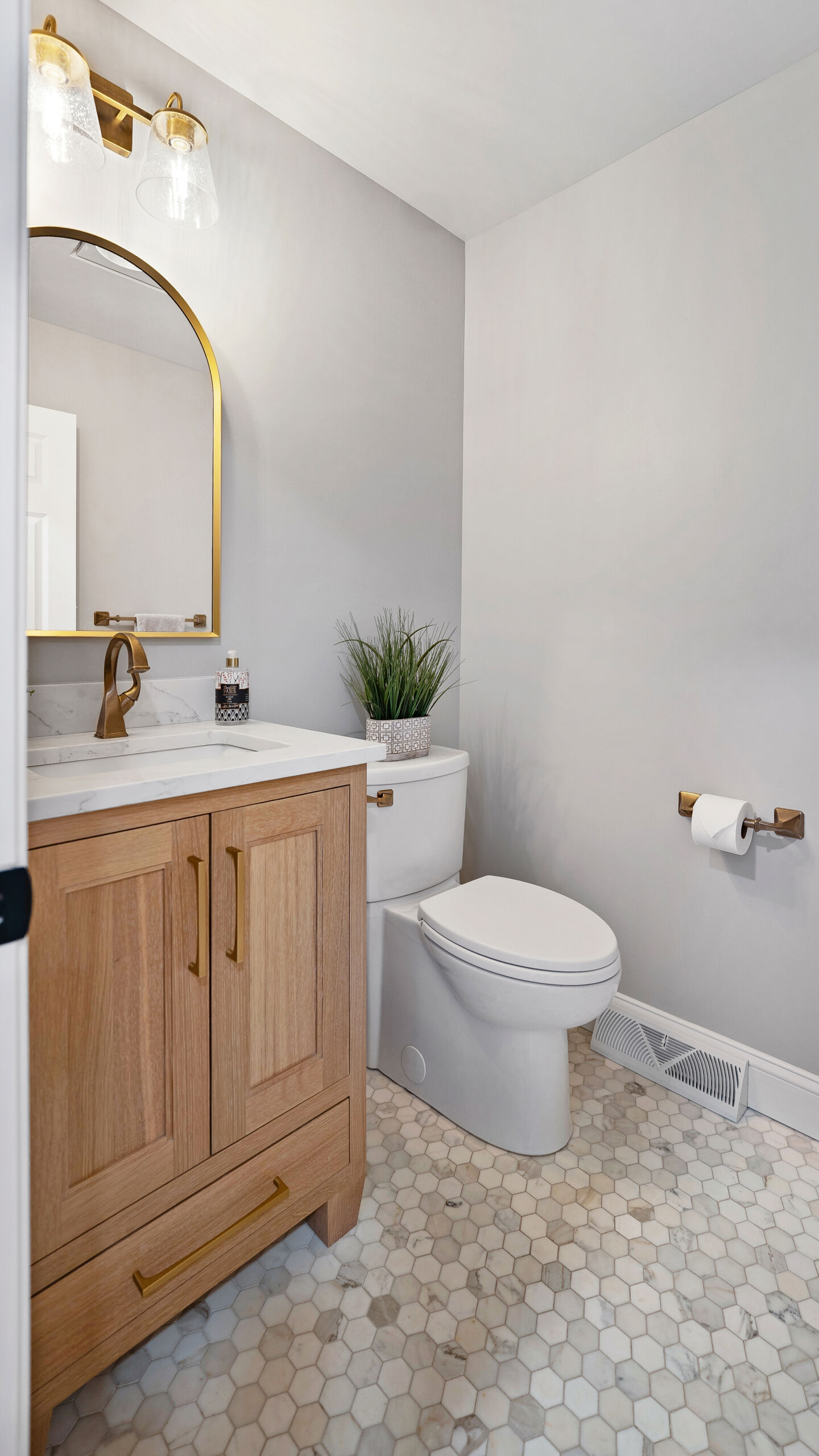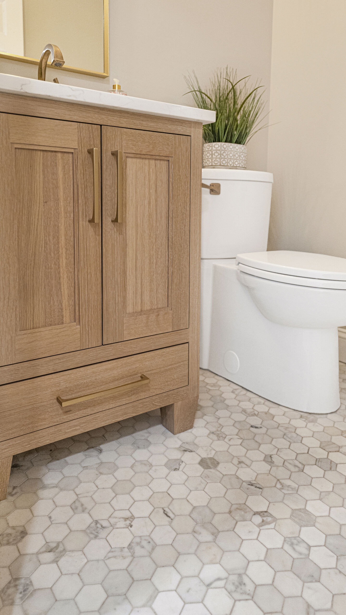 Next to the kitchen, there was previously a space that served as a bathroom/laundry room/mudroom. That’s too many “rooms” for one room so we split it down the middle and separated it to create two distinct, purposeful rooms. A dedicated powder bath and a more efficient laundry space. In the new laundry room, we replaced the old mud room’s exterior door with a window and put a sink where the old privacy door to the bathroom was. In the powder bath, the design is meant to complement the kitchen, so you’ll see coordinated finishes (Taj Mahal Counter, Gold Finishes, and Select Alder Vanity) and a marble hex tile floor that adds subtle texture and visual interest.