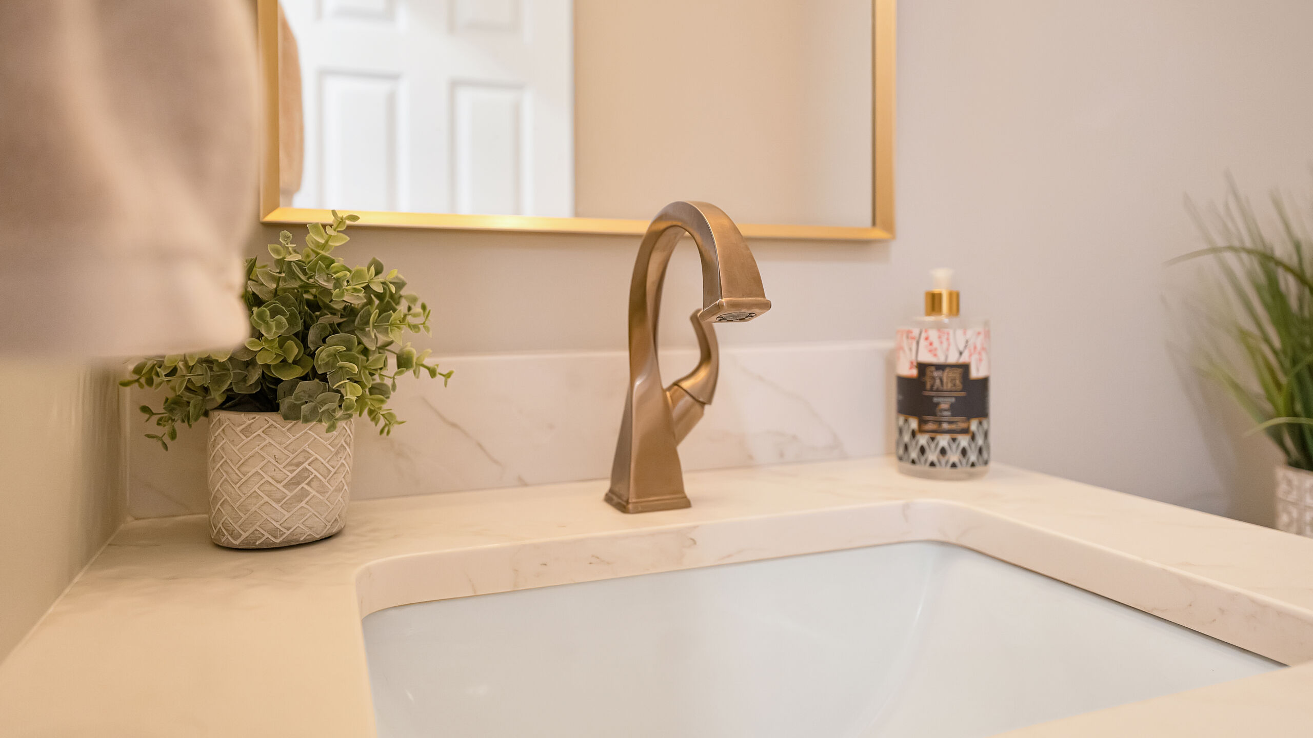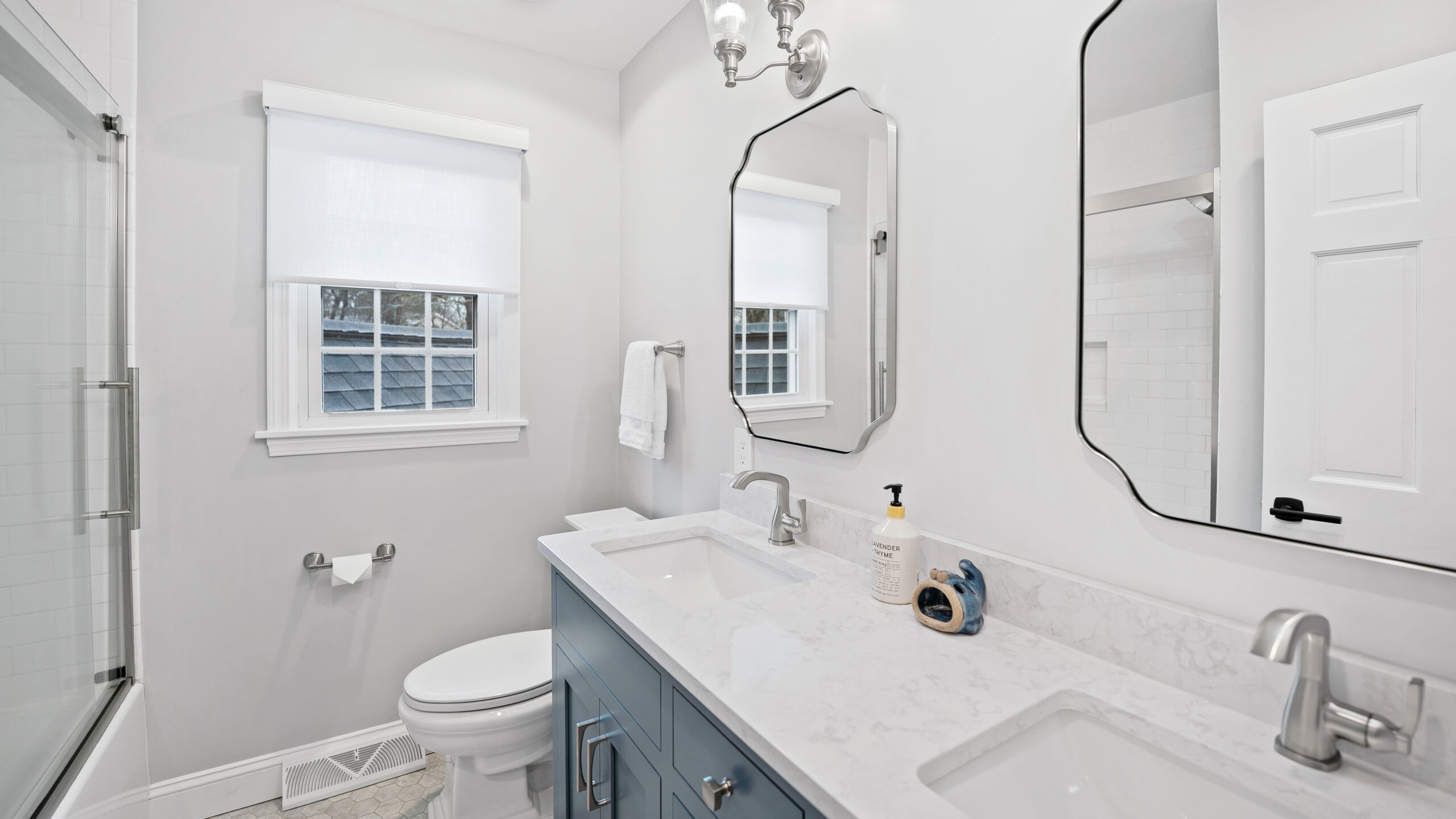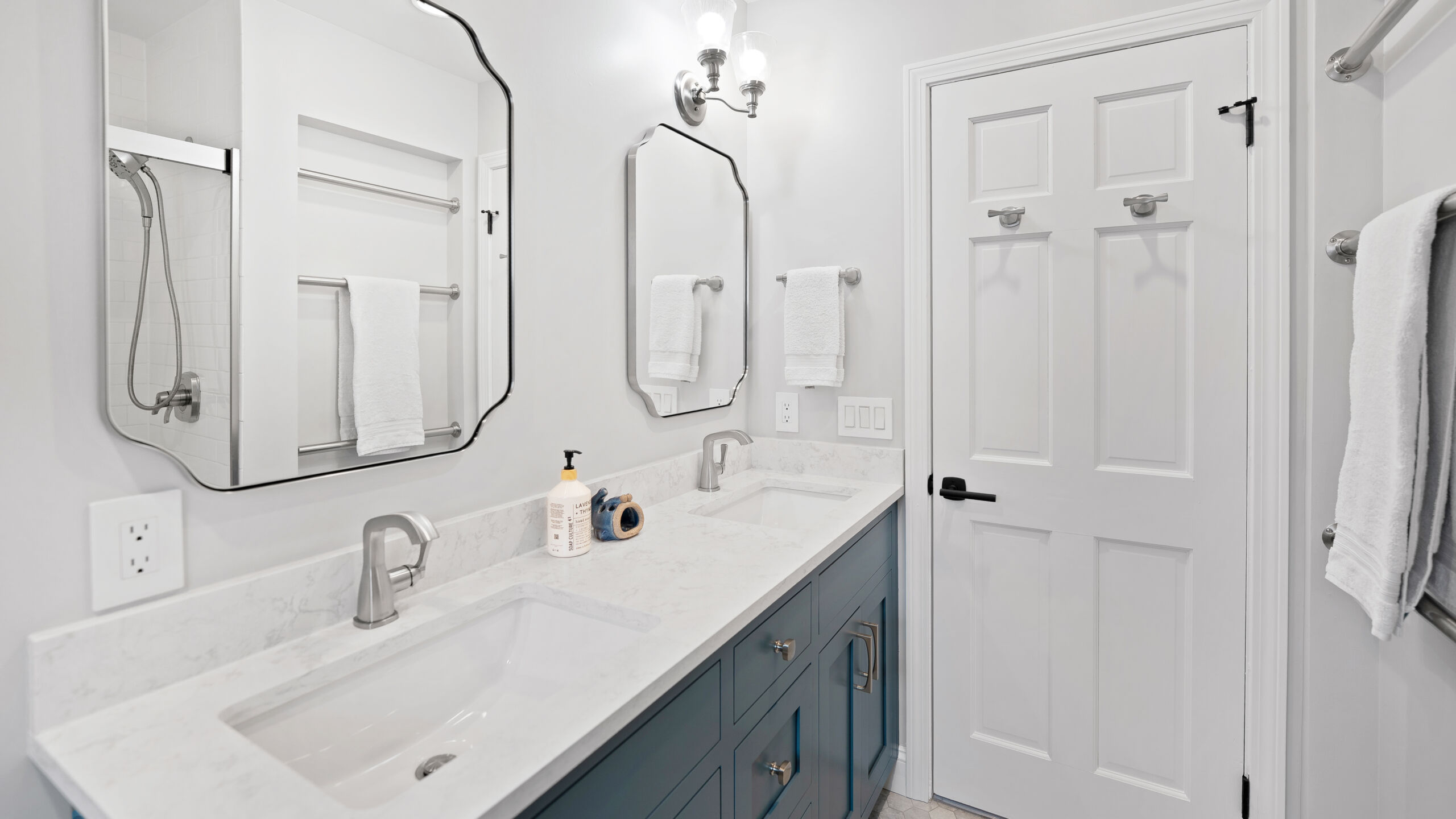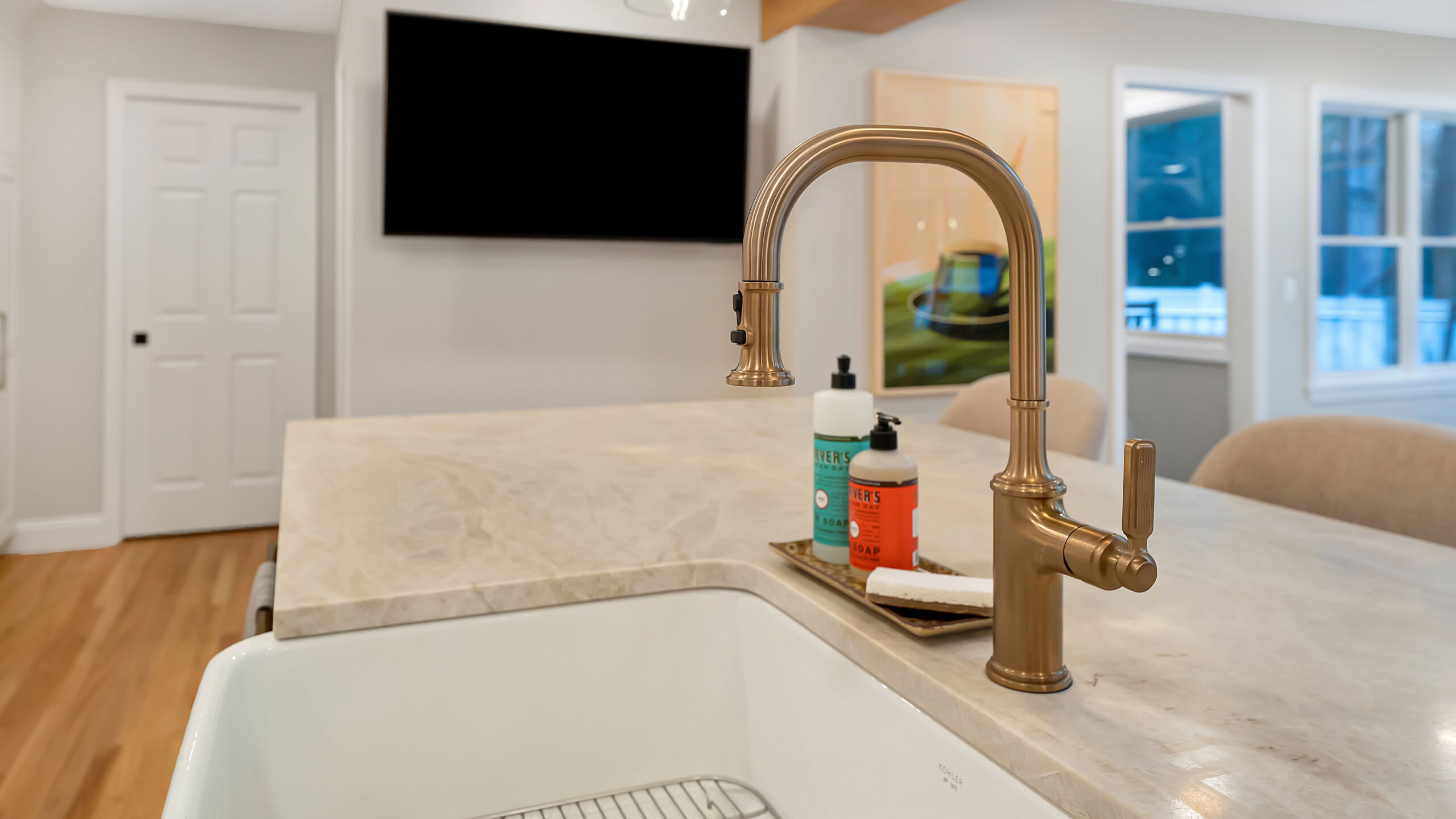 Next to the kitchen, there was previously a space that served as a bathroom/laundry room/mudroom. That’s too many “rooms” for one room so we split it down the middle and separated it to create two distinct, purposeful rooms. A dedicated powder bath and a more efficient laundry space. In the new laundry room, we replaced the old mud room’s exterior door with a window and put a sink where the old privacy door to the bathroom was. In the powder bath, the design is meant to complement the kitchen, so you’ll see coordinated finishes (Taj Mahal Counter, Gold Finishes, and Select Alder Vanity) and a marble hex tile floor that adds subtle texture and visual interest.
