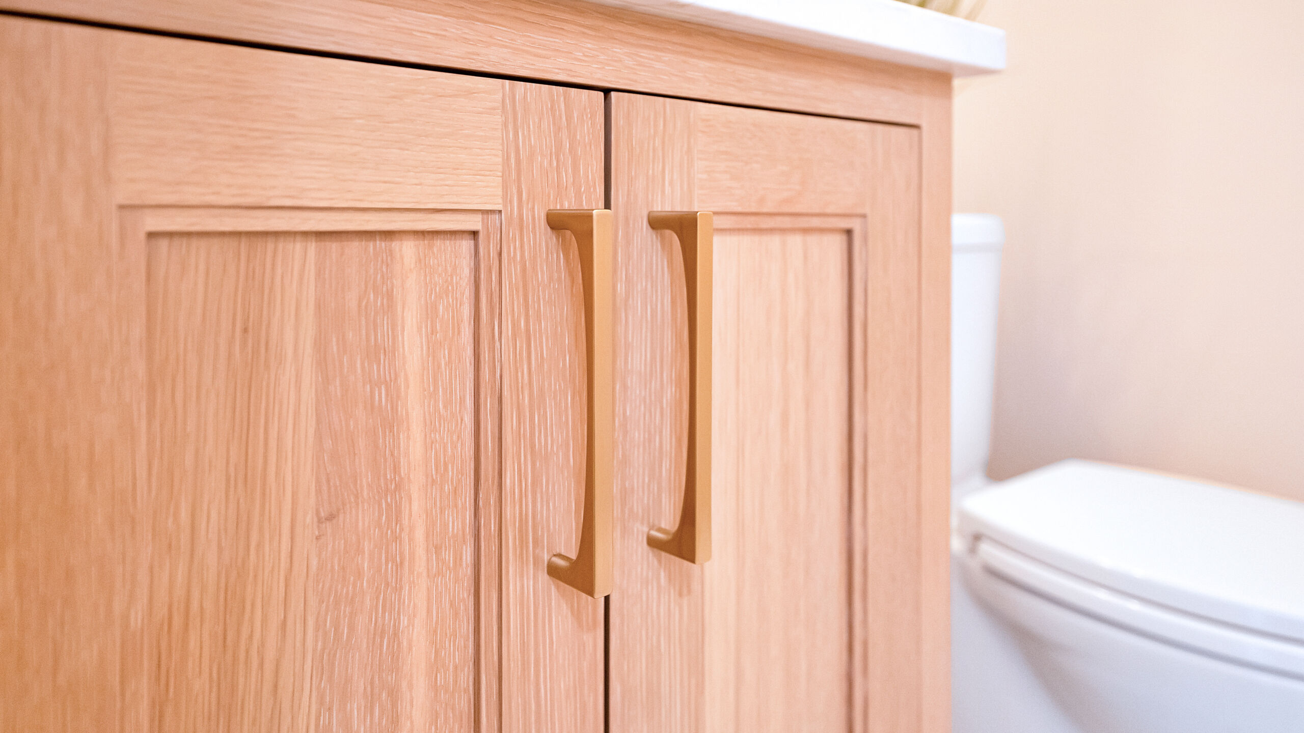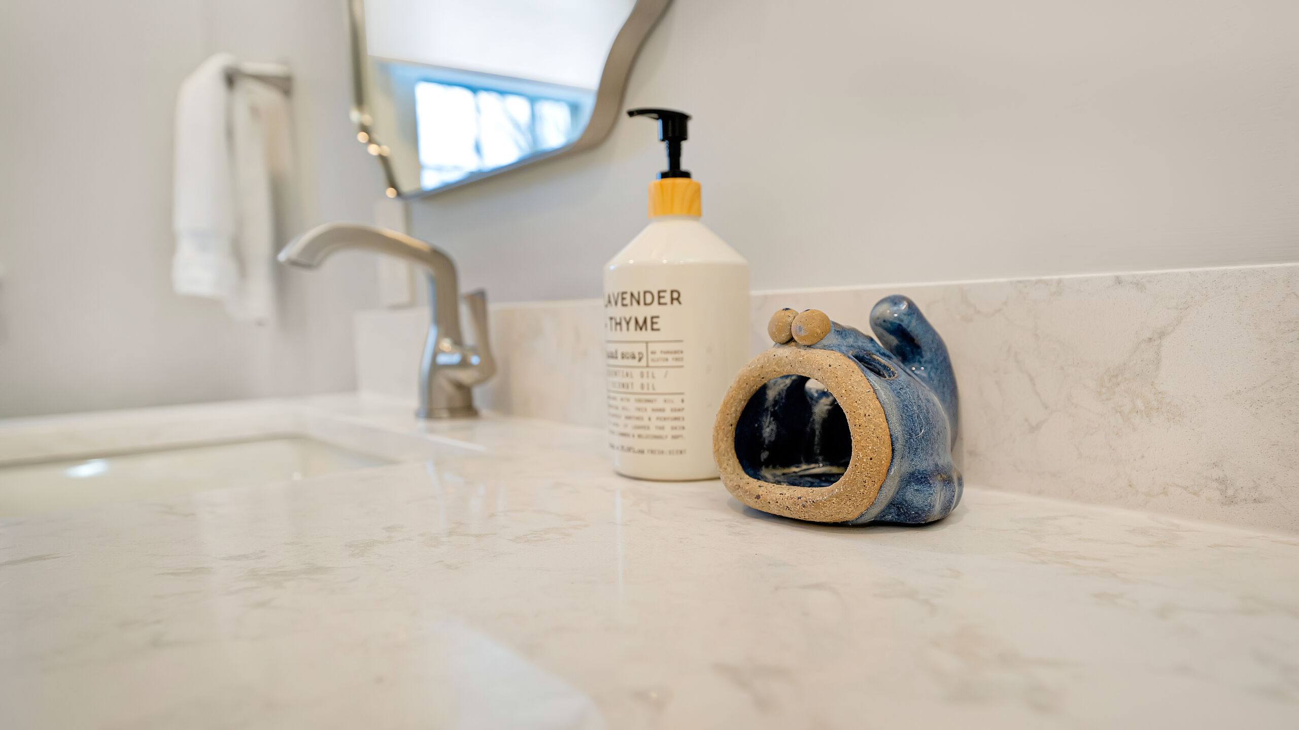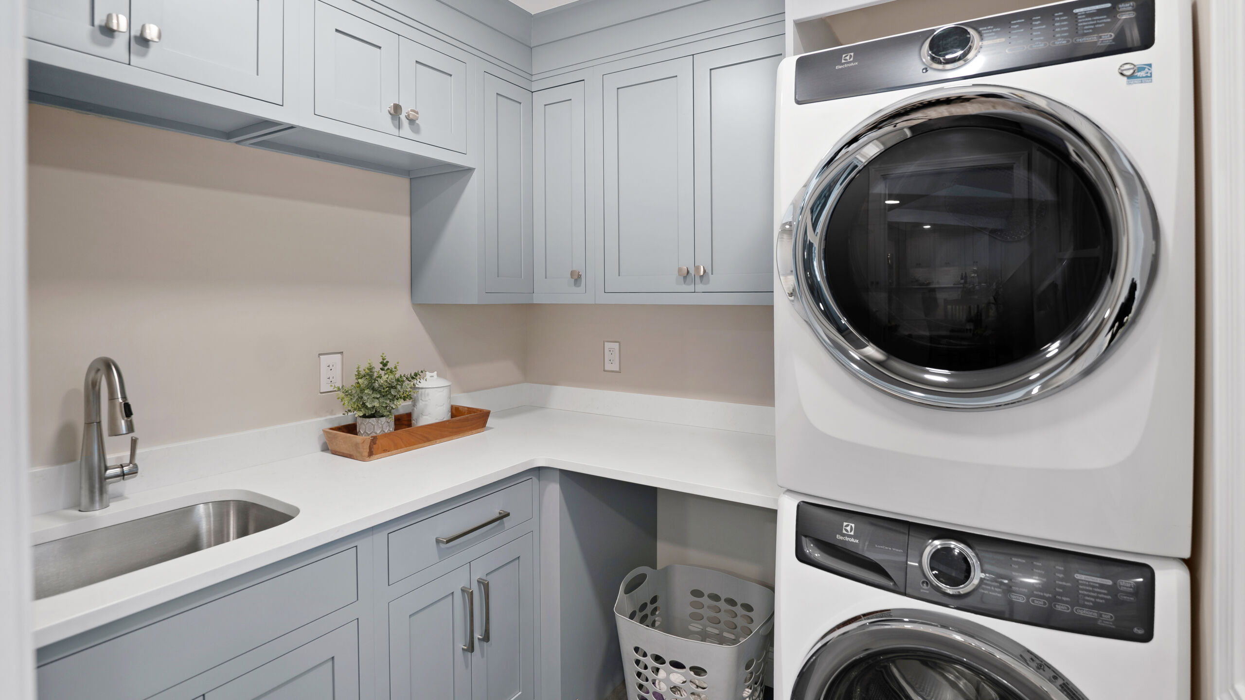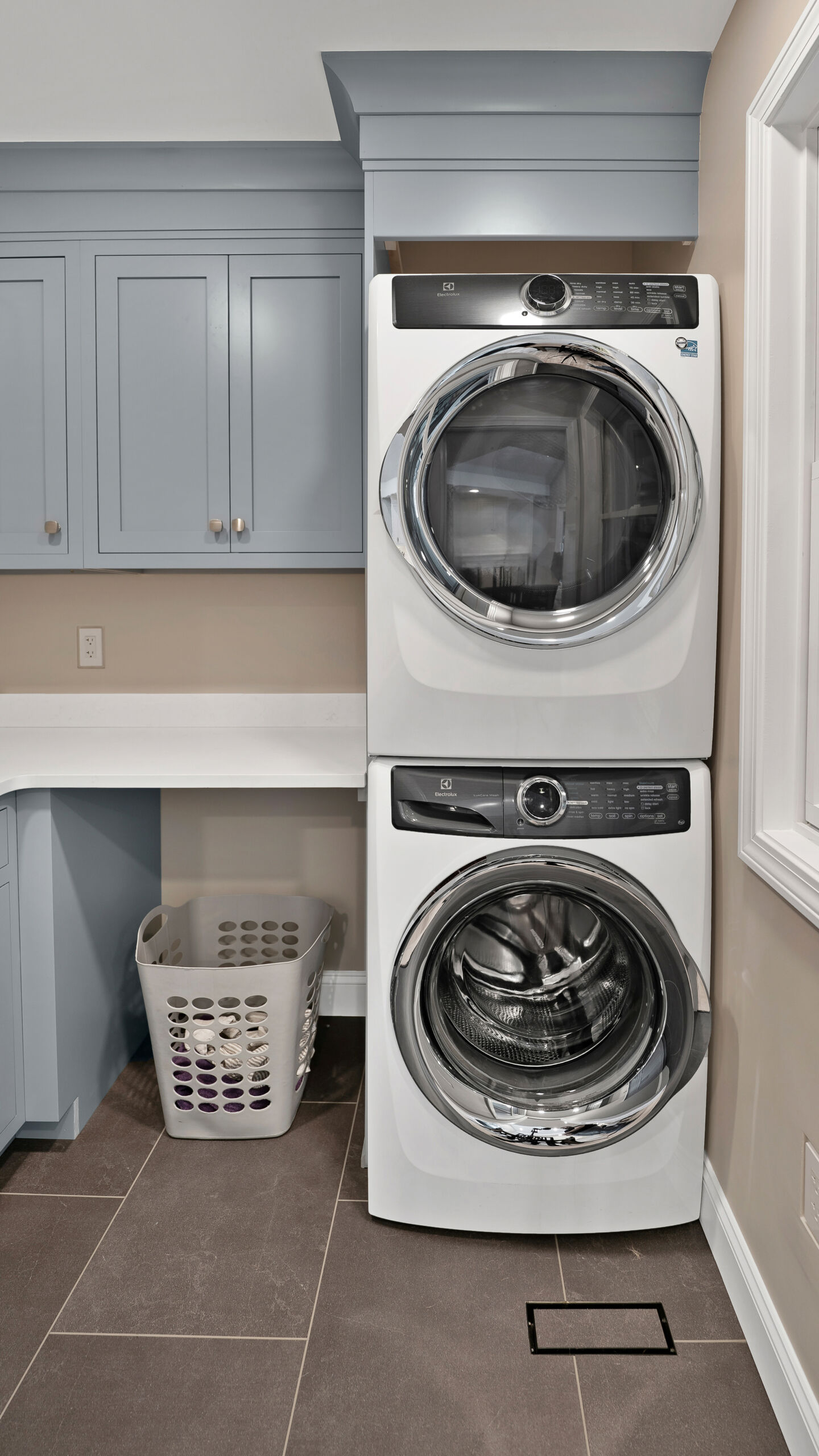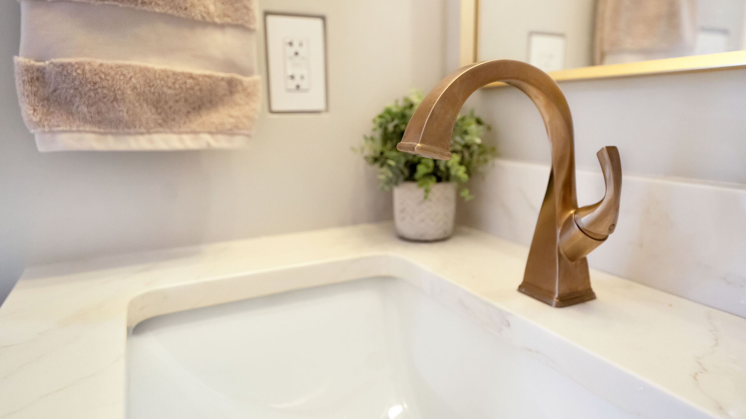 Next to the kitchen, there was previously a space that served as a bathroom/laundry room/mudroom. That’s too many “rooms” for one room so we split it down the middle and separated it to create two distinct, purposeful rooms. A dedicated powder bath and a more efficient laundry space. In the new laundry room, we replaced the old mud room’s exterior door with a window and put a sink where the old privacy door to the bathroom was. In the powder bath, the design is meant to complement the kitchen, so you’ll see coordinated finishes (Taj Mahal Counter, Gold Finishes, and Select Alder Vanity) and a marble hex tile floor that adds subtle texture and visual interest.