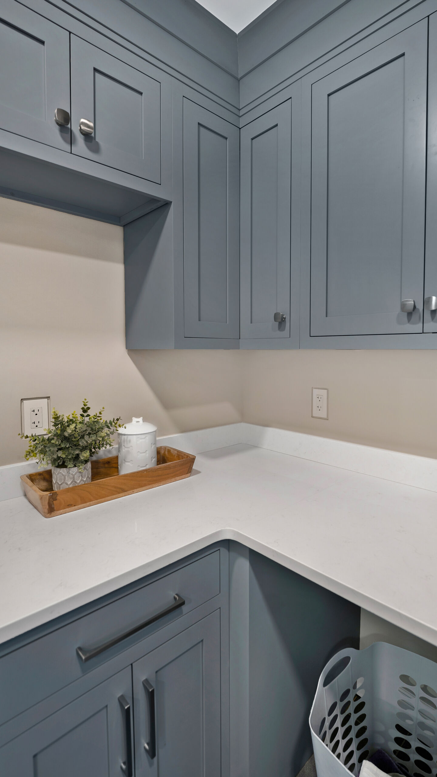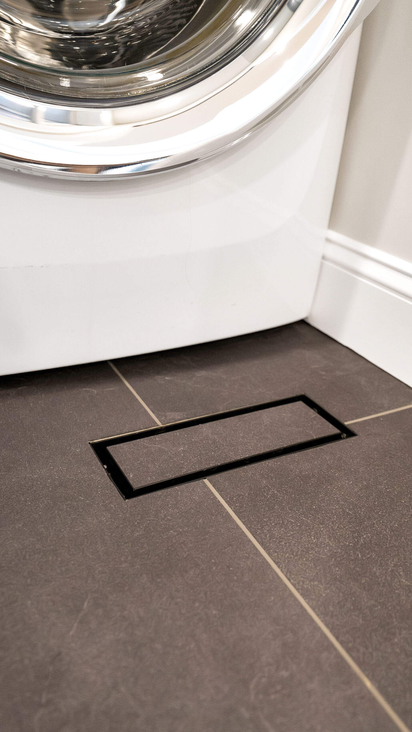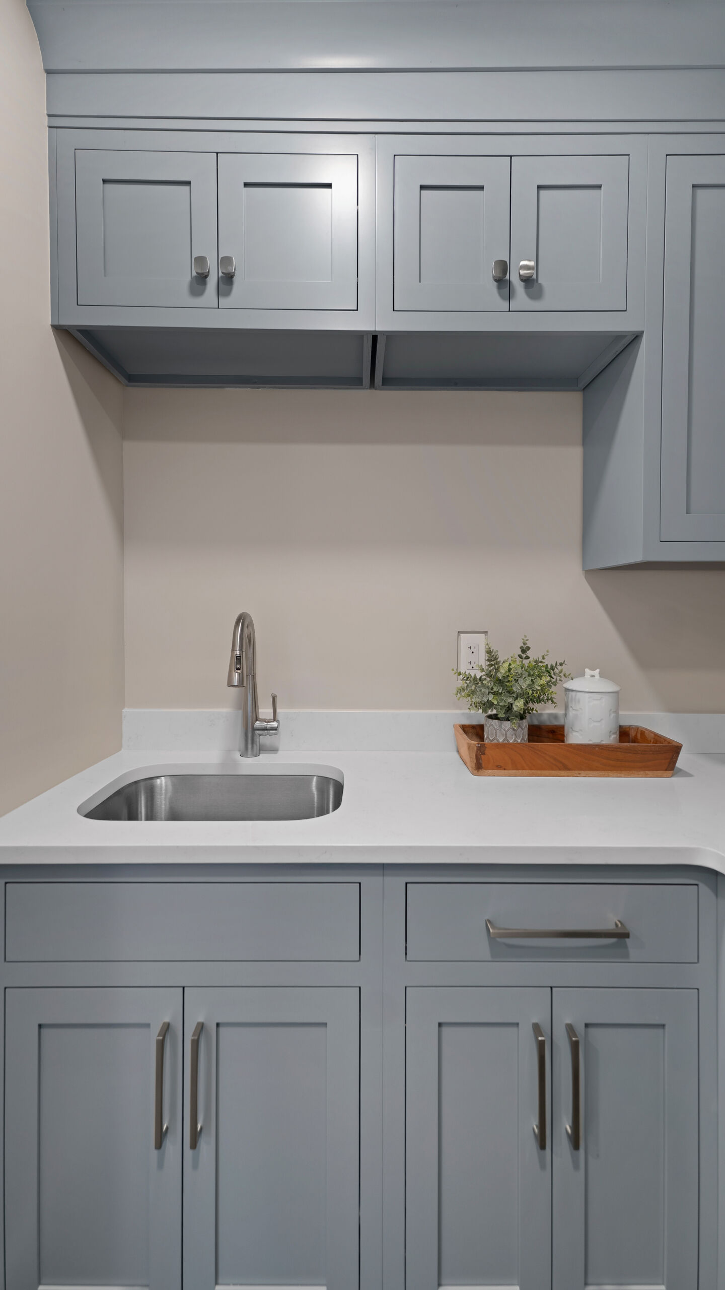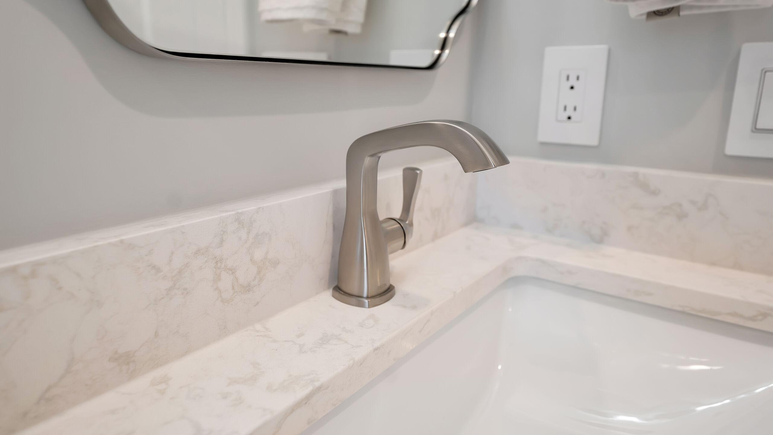 Next to the kitchen, there was previously a space that served as a bathroom/laundry room/mudroom. That’s too many “rooms” for one room so we split it down the middle and separated it to create two distinct, purposeful rooms. A dedicated powder bath and a more efficient laundry space. In the new laundry room, we replaced the old mud room’s exterior door with a window and put a sink where the old privacy door to the bathroom was. In the powder bath, the design is meant to complement the kitchen, so you’ll see coordinated finishes (Taj Mahal Counter, Gold Finishes, and Select Alder Vanity) and a marble hex tile floor that adds subtle texture and visual interest.