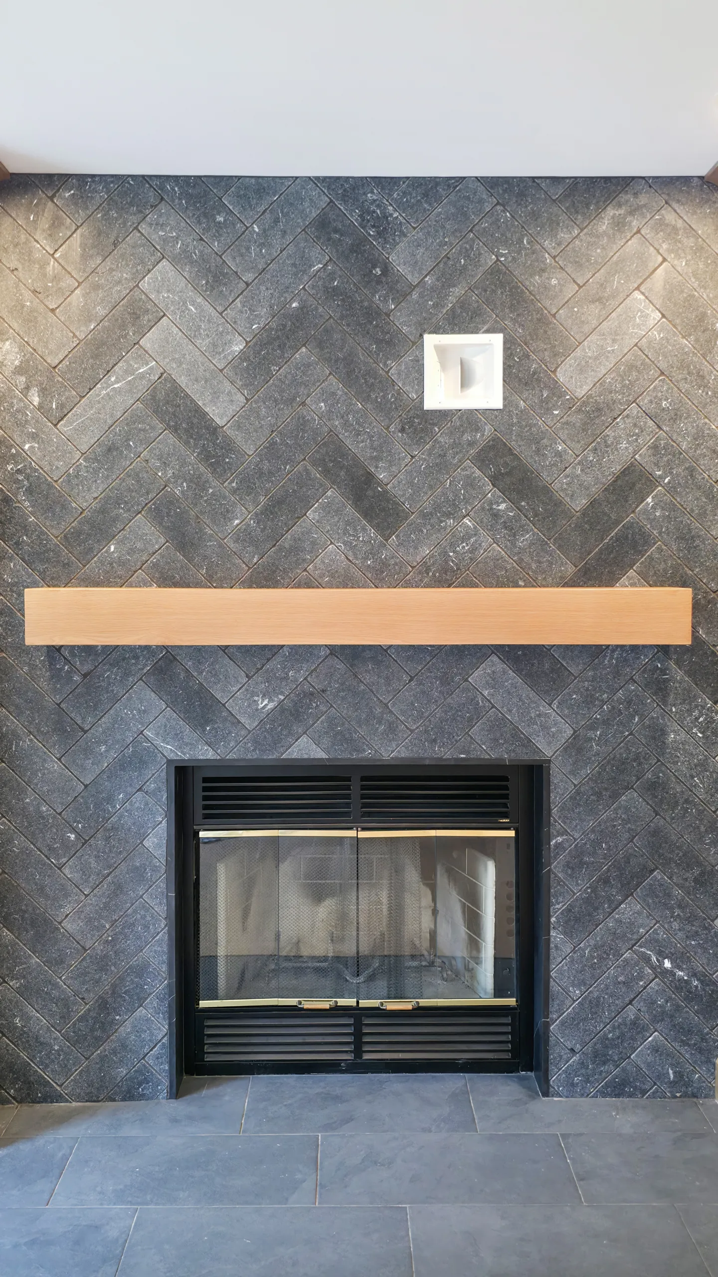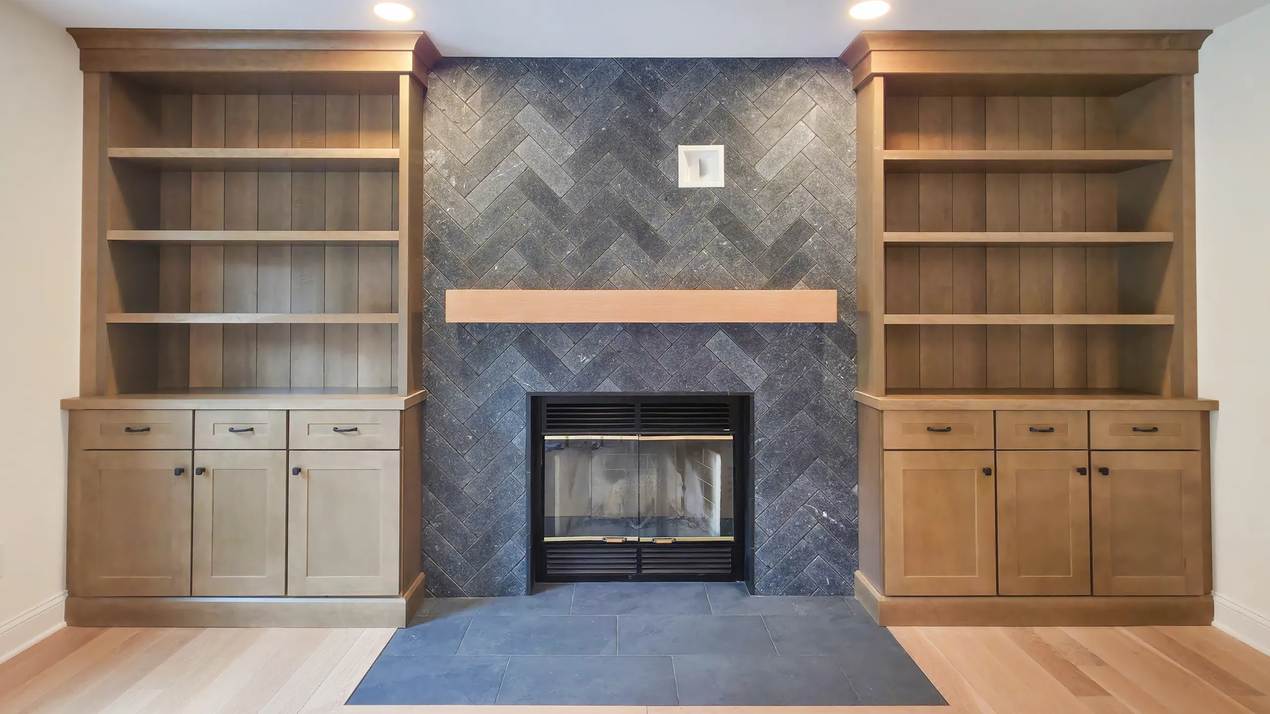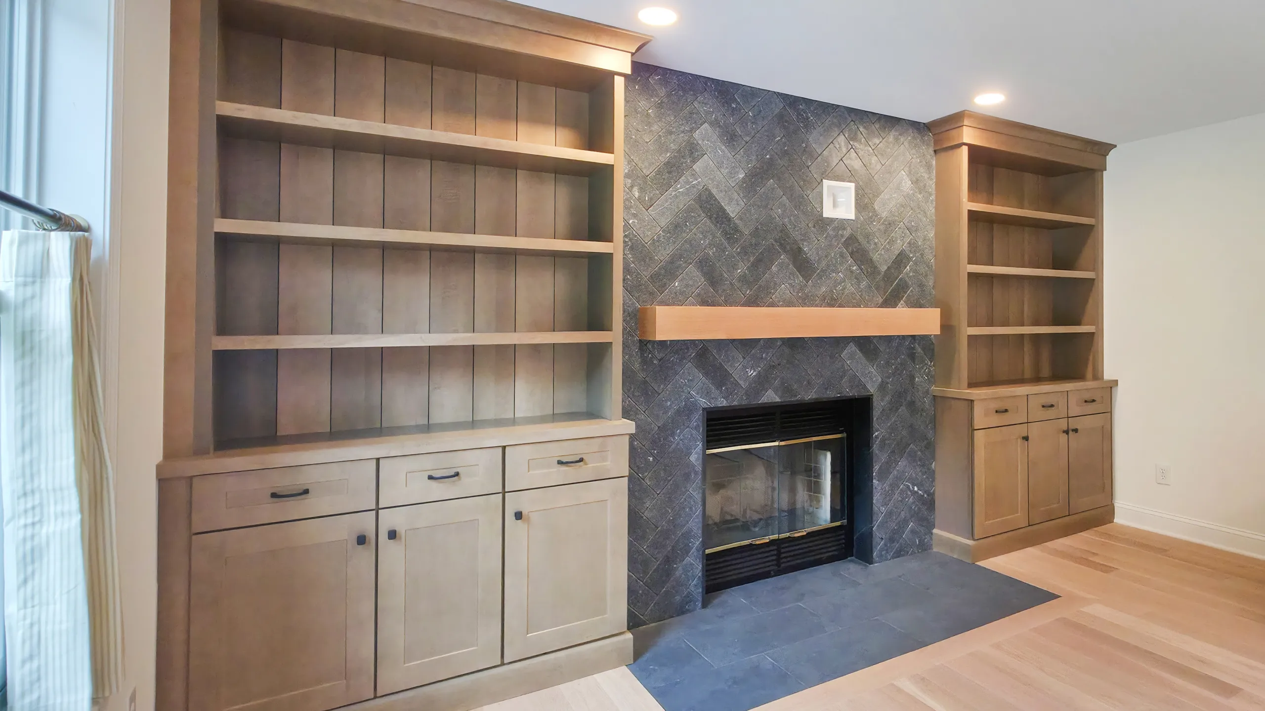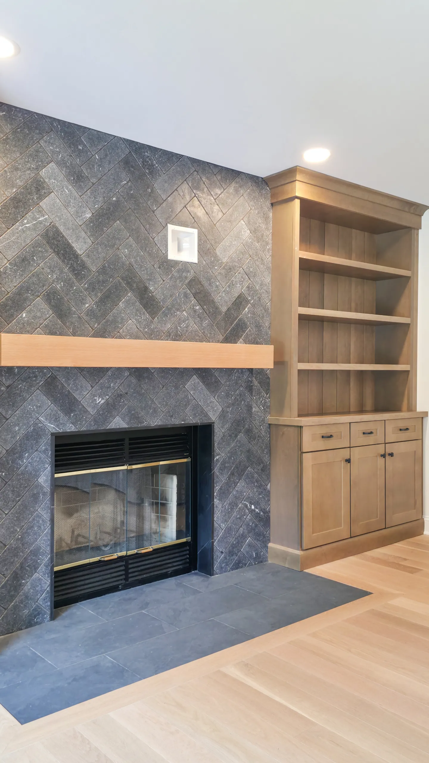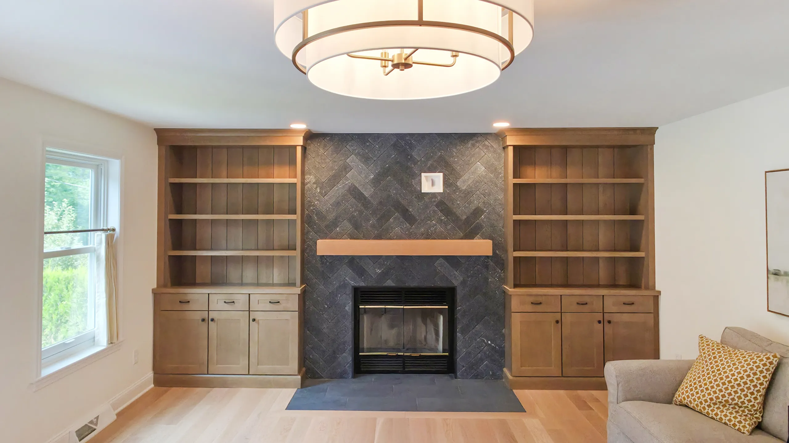 Adjacent to the full remodeled kitchen, the living room was updated with a custom floor-to-ceiling fireplace built-in. Matching cabinetry frames the space, while a white oak mantle and marble herringbone tile fireplace surround create a moody yet cohesive feel that ties back to the remodeled kitchen.