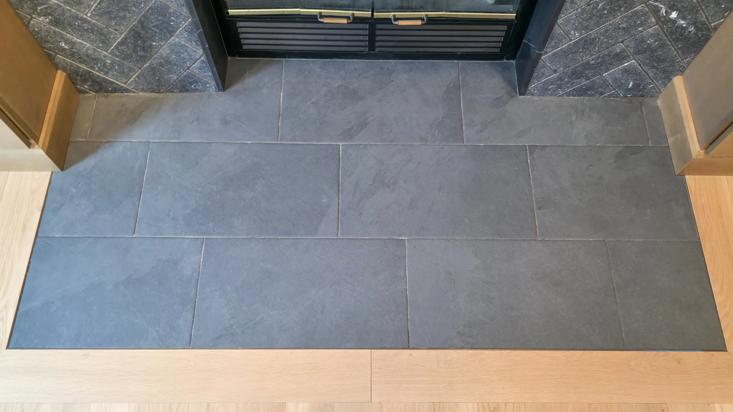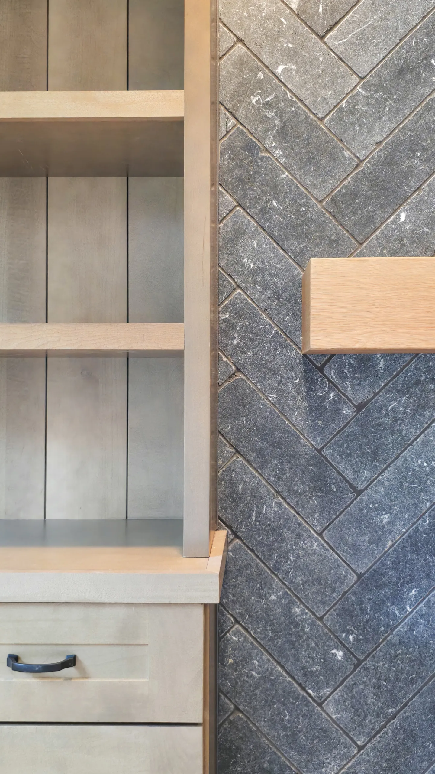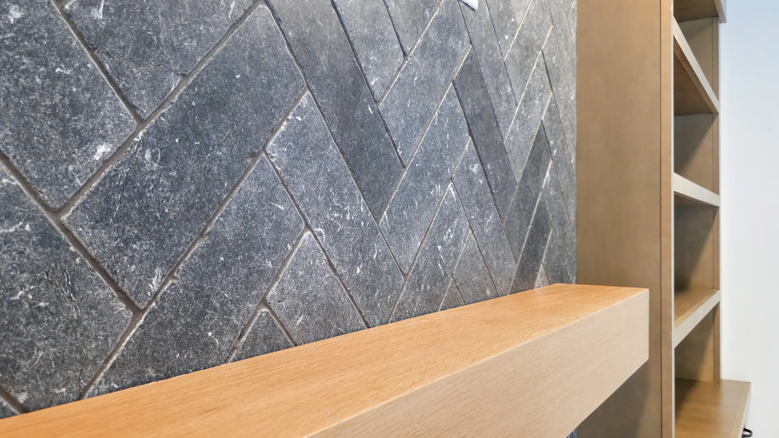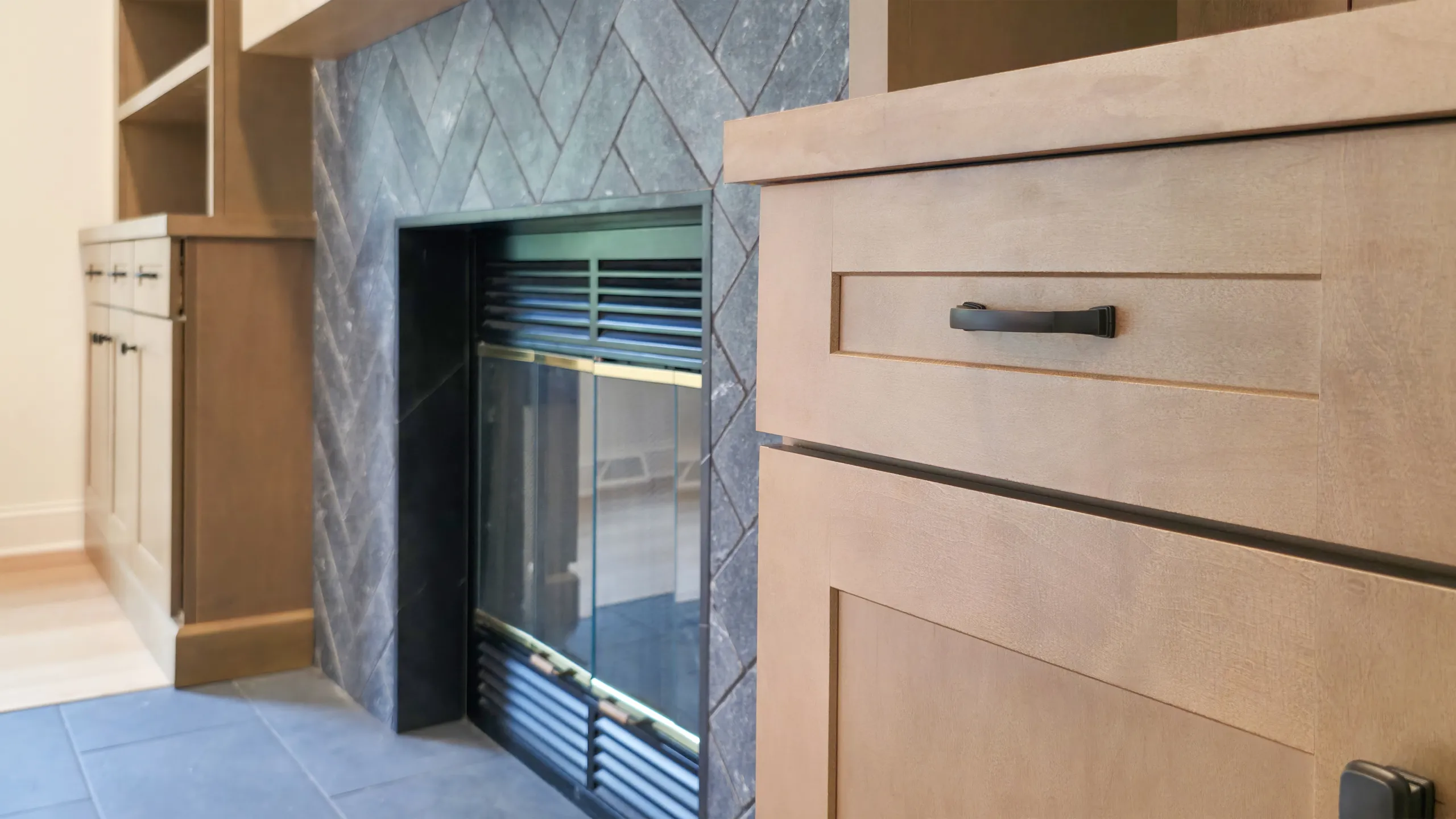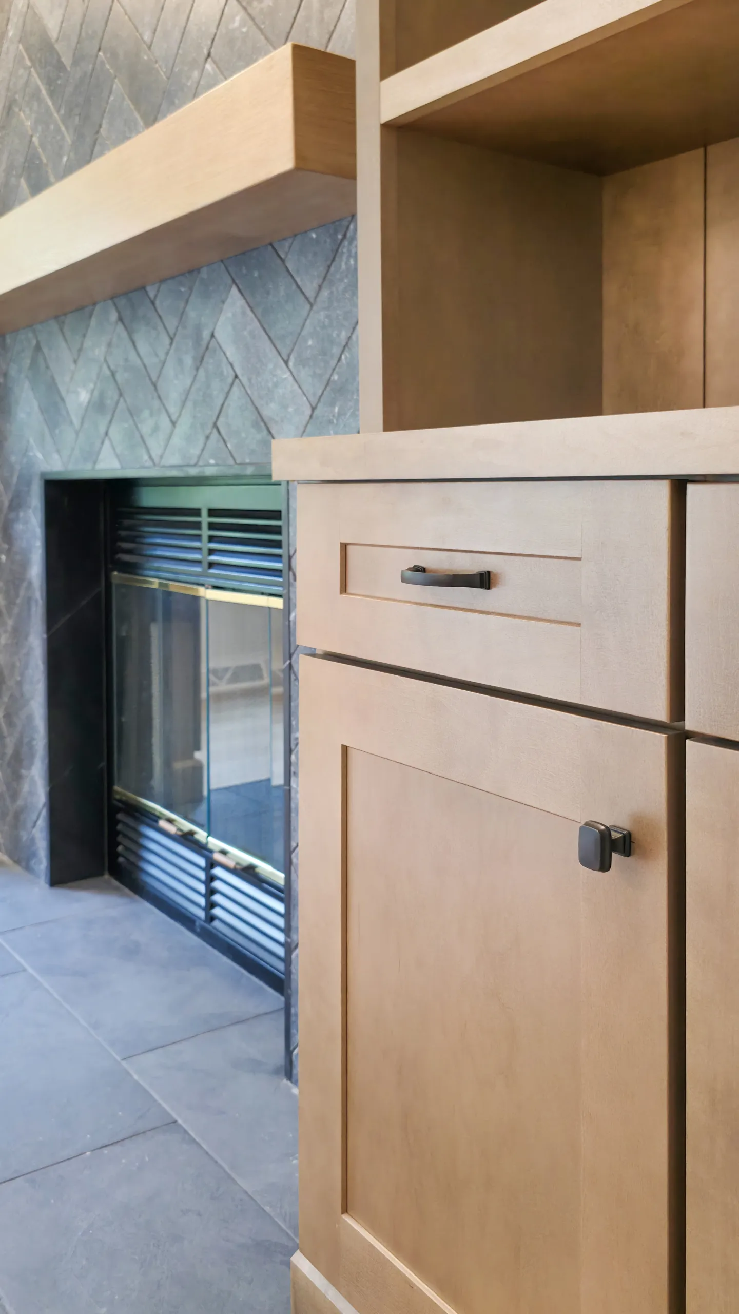 Adjacent to the full remodeled kitchen, the living room was updated with a custom floor-to-ceiling fireplace built-in. Matching cabinetry frames the space, while a white oak mantle and marble herringbone tile fireplace surround create a moody yet cohesive feel that ties back to the remodeled kitchen.
