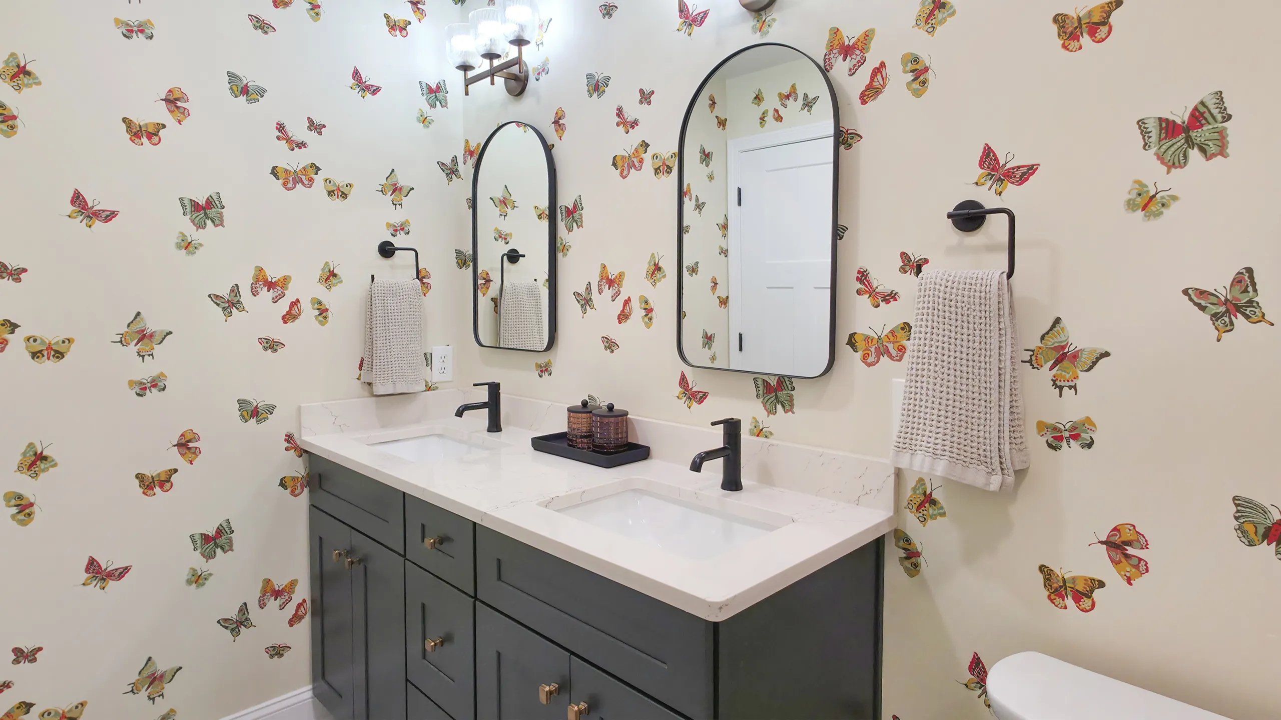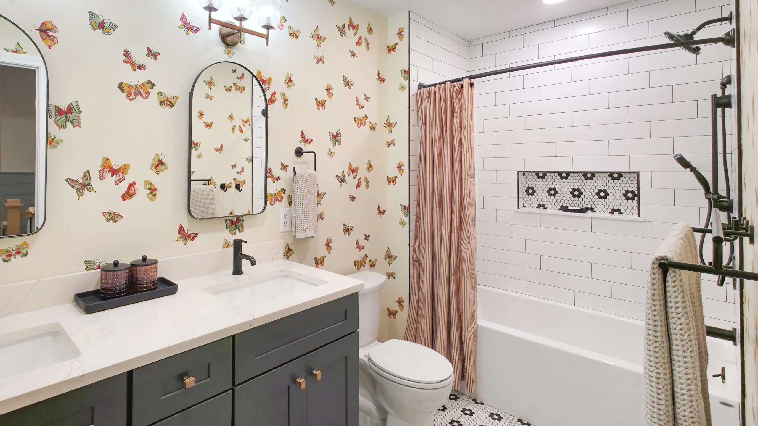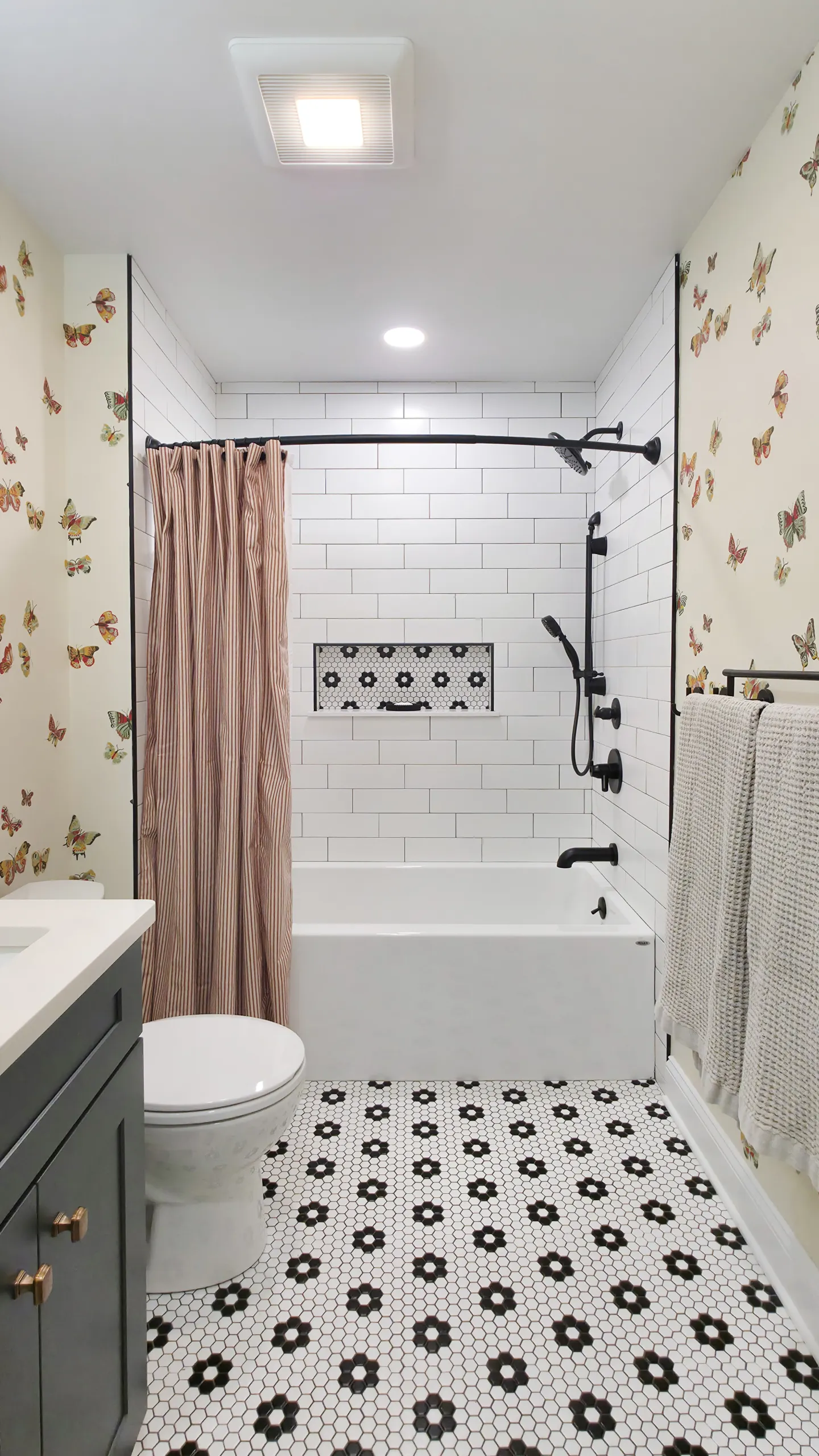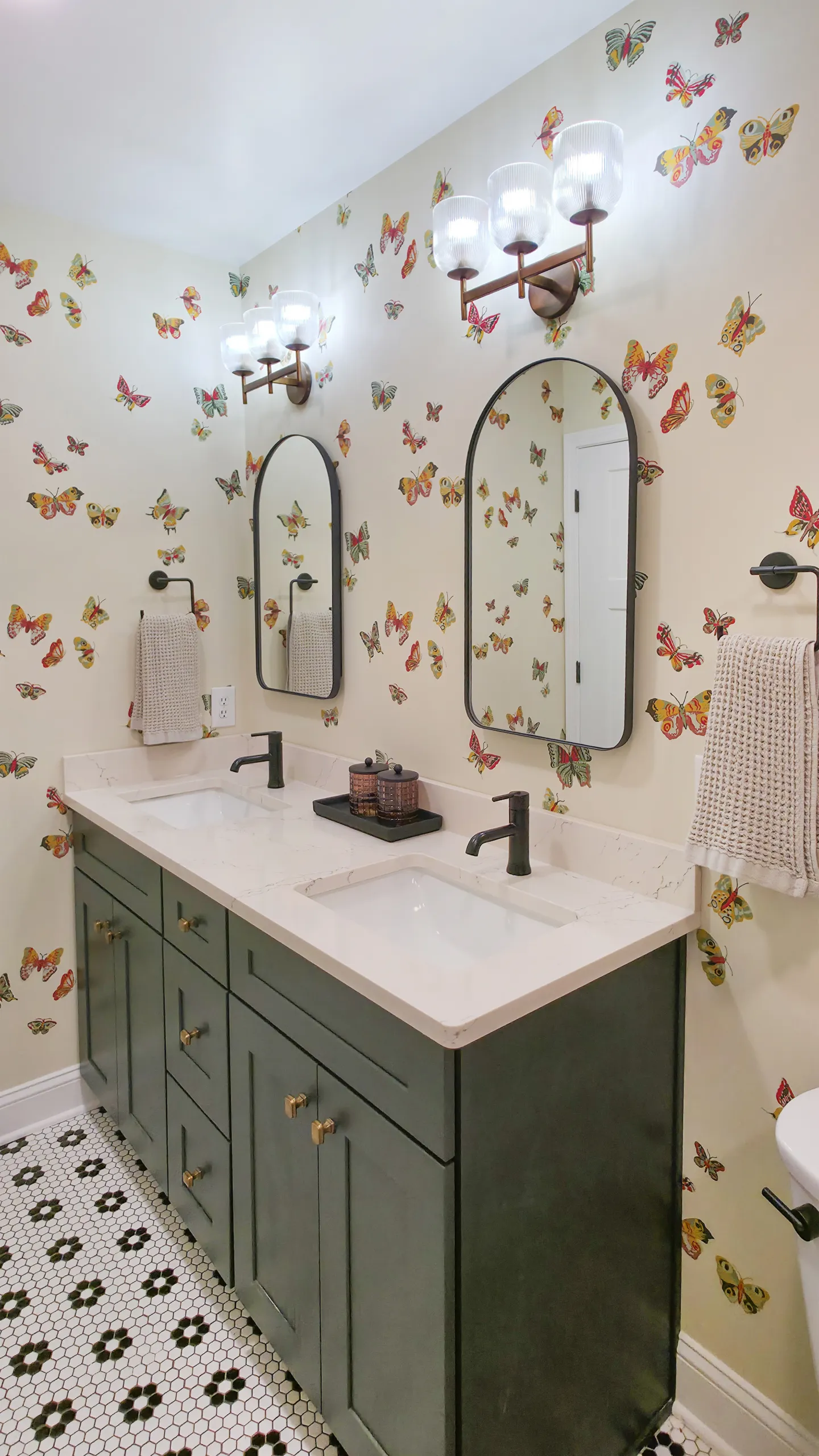 For the last bathroom of the home, the family envisioned a space that was playful, eclectic, and able to grow with their children. The standout design includes a black-and-white floral mosaic floor that carries into the shower niche, paired with a classic white subway-tiled tub trimmed in matte black. A butterfly wallpaper (supplied by our client) continues the trend of stylish wallpaper found throughout the home. A double vanity in Foxhall Green, featuring burnished brass hardware, is adorned with black Delta Trinsic faucets and oval mirrors, striking a balance between timeless and fun.