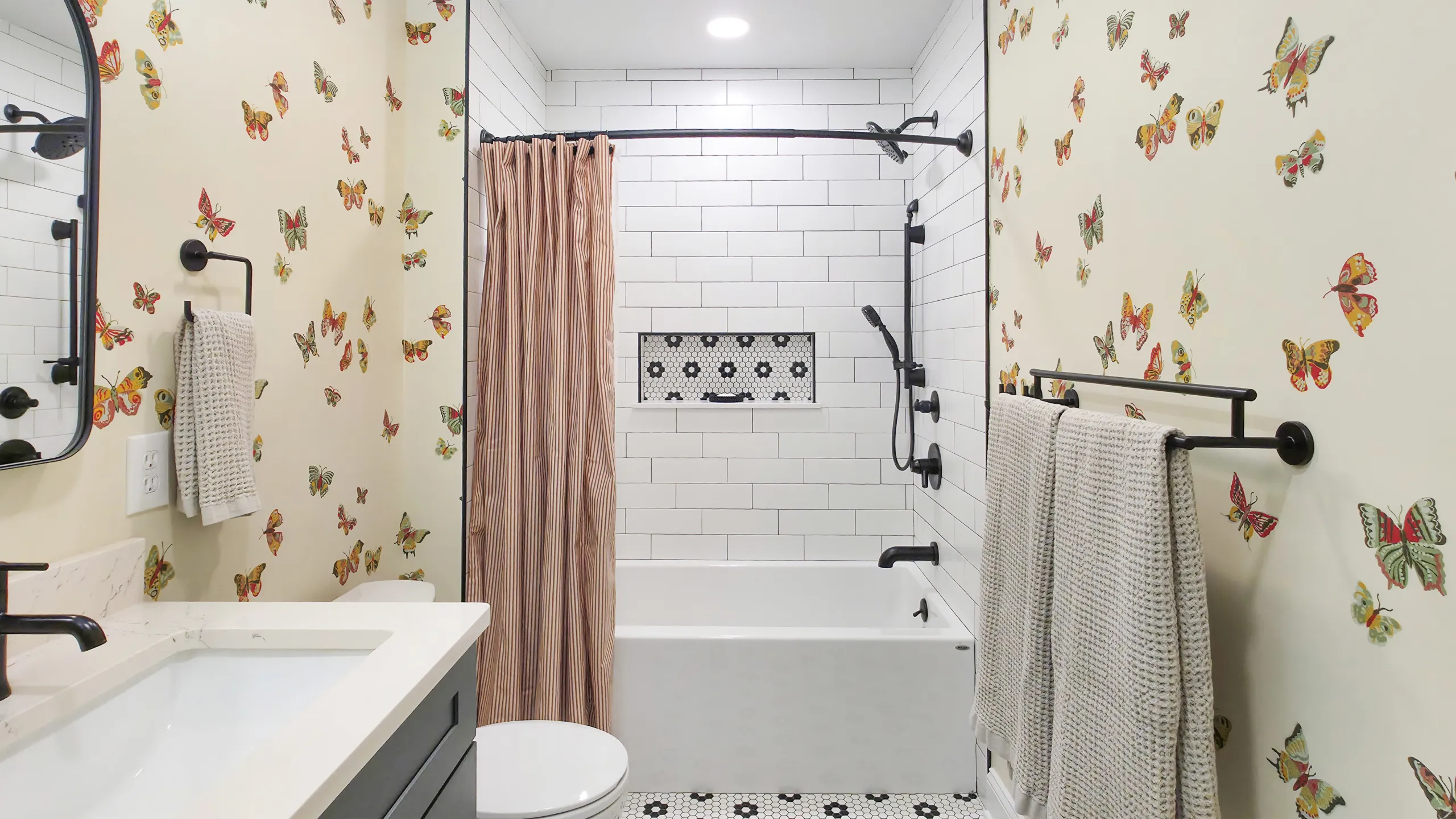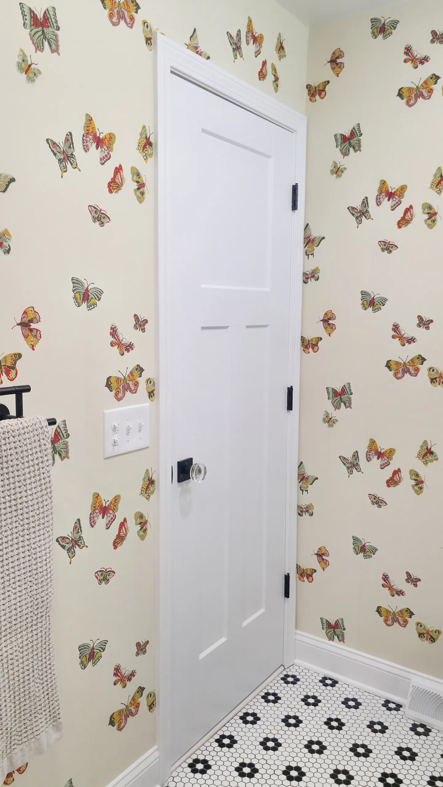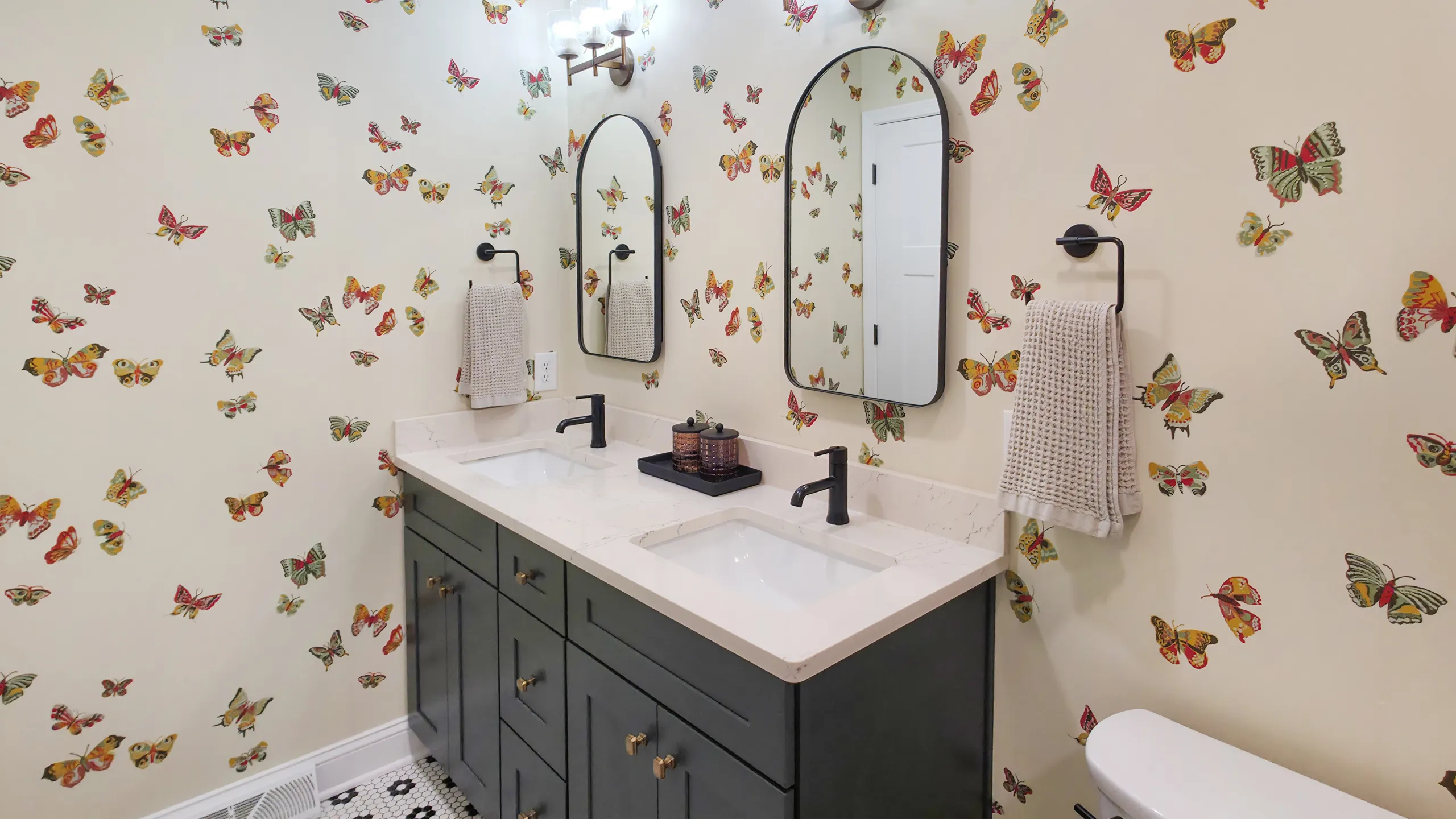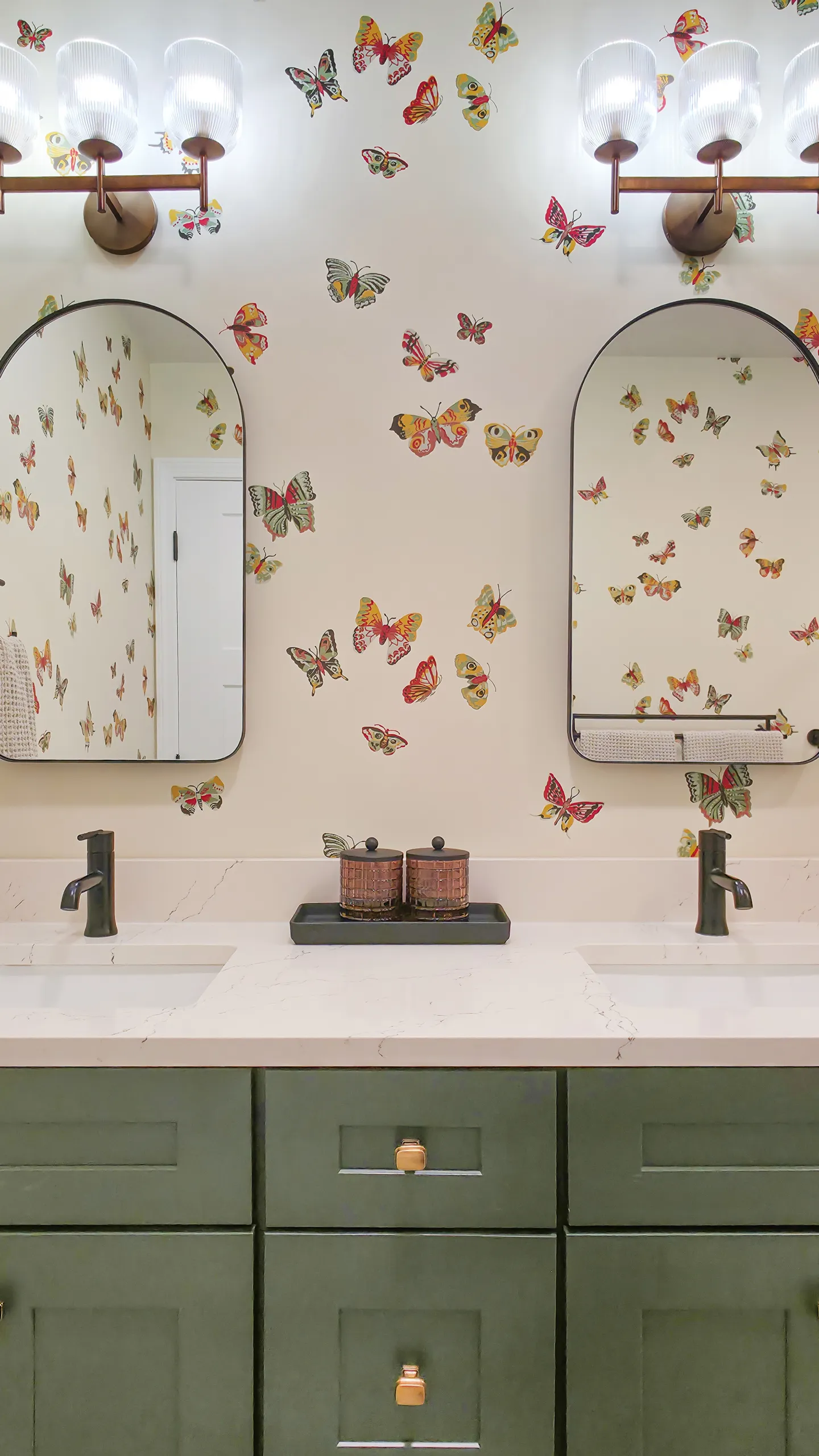 For the last bathroom of the home, the family envisioned a space that was playful, eclectic, and able to grow with their children. The standout design includes a black-and-white floral mosaic floor that carries into the shower niche, paired with a classic white subway-tiled tub trimmed in matte black. A butterfly wallpaper (supplied by our client) continues the trend of stylish wallpaper found throughout the home. A double vanity in Foxhall Green, featuring burnished brass hardware, is adorned with black Delta Trinsic faucets and oval mirrors, striking a balance between timeless and fun.