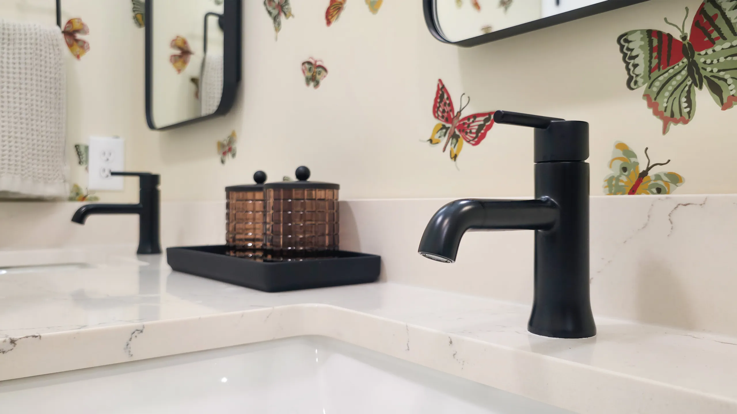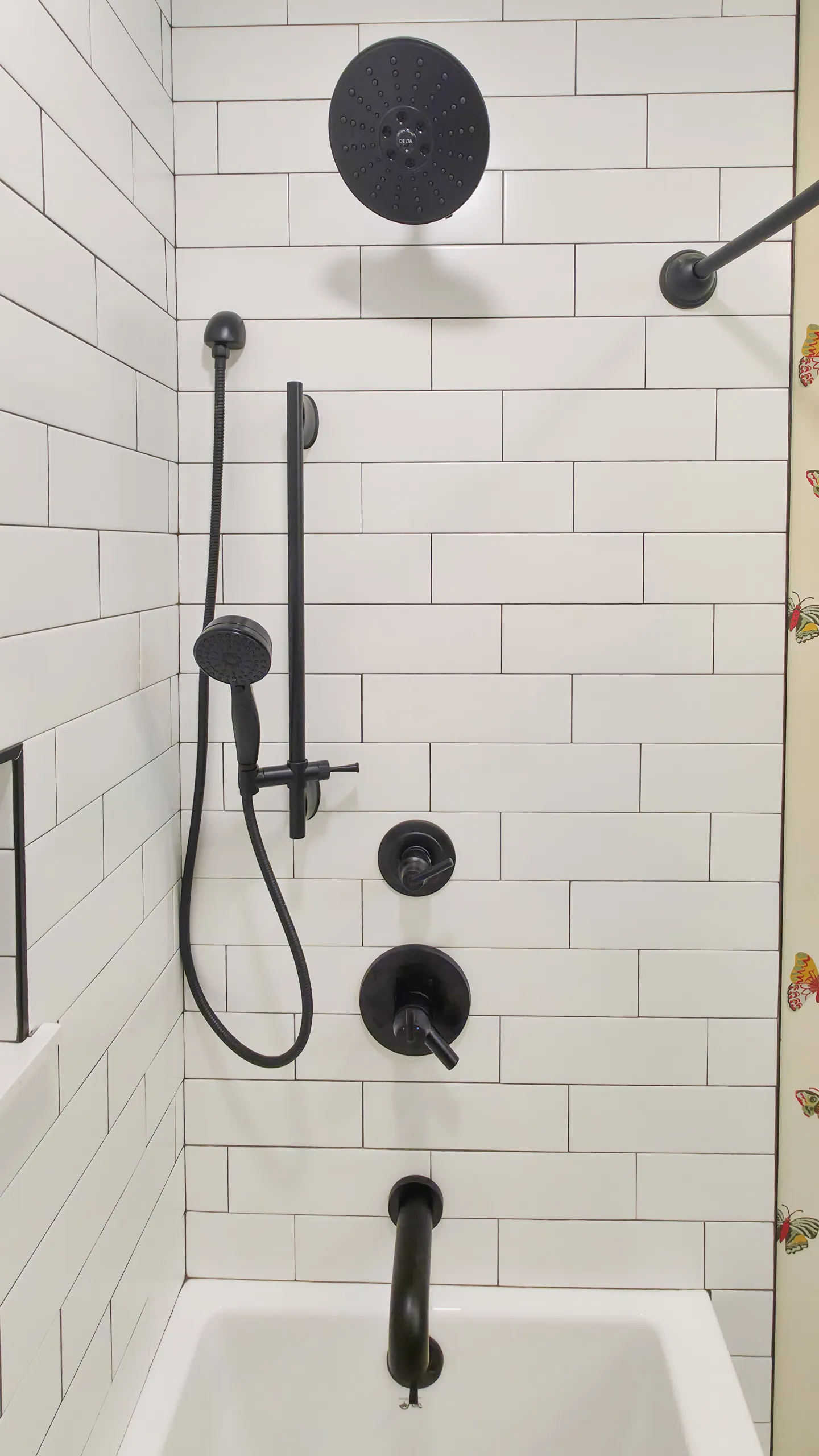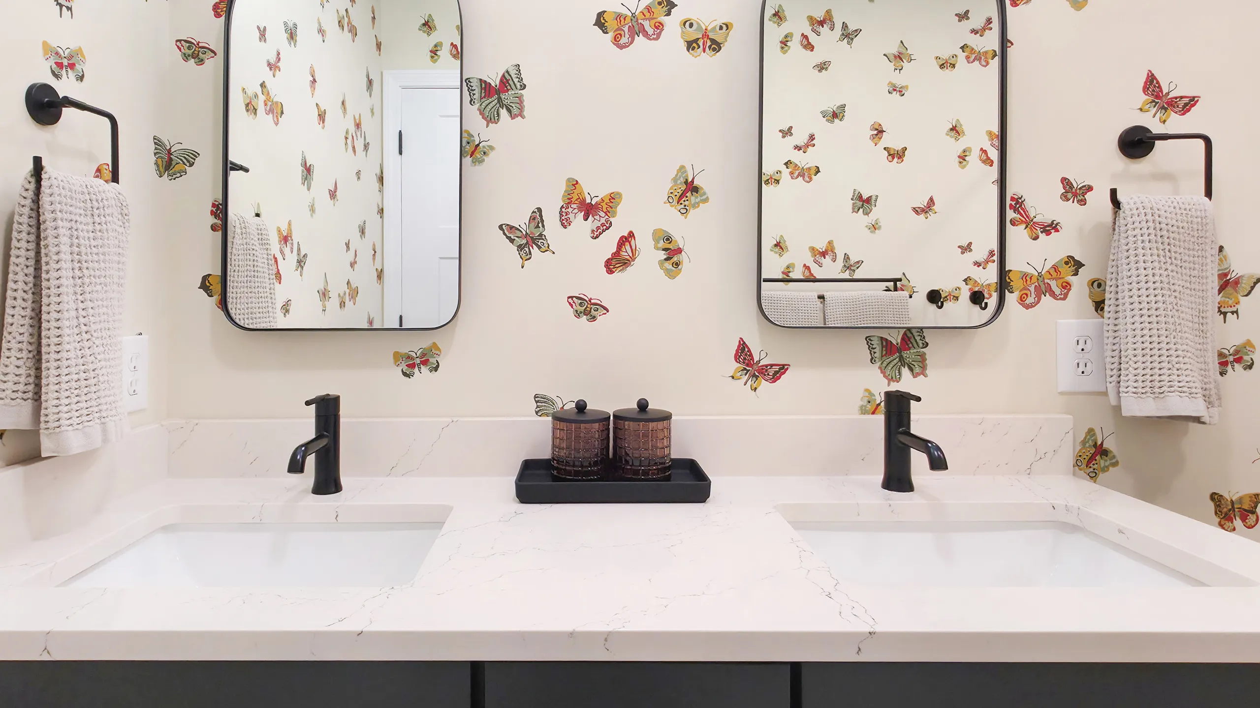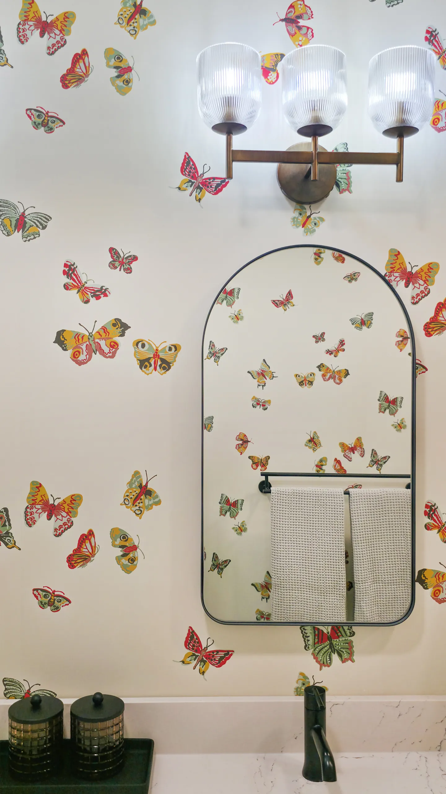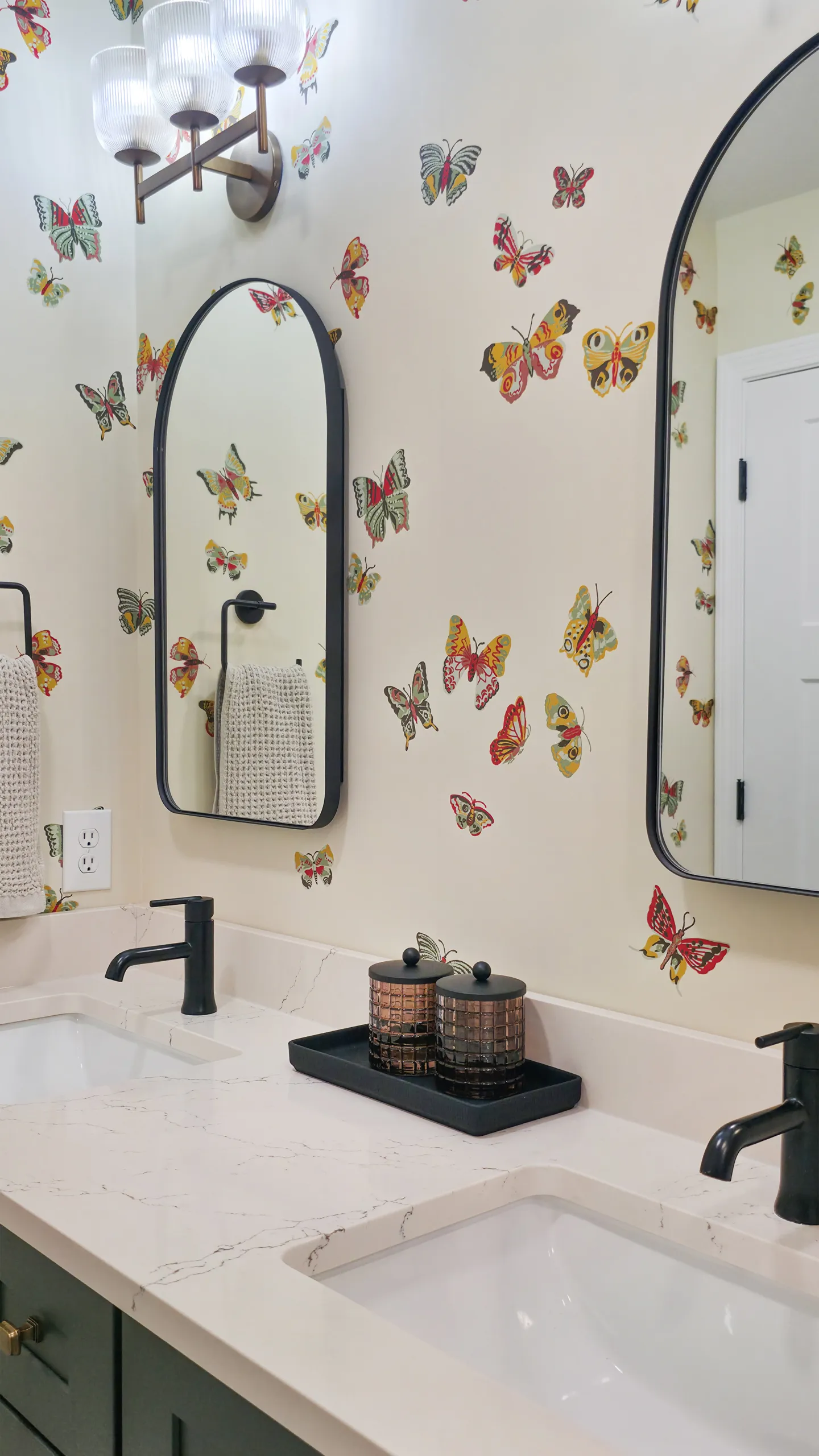 For the last bathroom of the home, the family envisioned a space that was playful, eclectic, and able to grow with their children. The standout design includes a black-and-white floral mosaic floor that carries into the shower niche, paired with a classic white subway-tiled tub trimmed in matte black. A butterfly wallpaper (supplied by our client) continues the trend of stylish wallpaper found throughout the home. A double vanity in Foxhall Green, featuring burnished brass hardware, is adorned with black Delta Trinsic faucets and oval mirrors, striking a balance between timeless and fun.