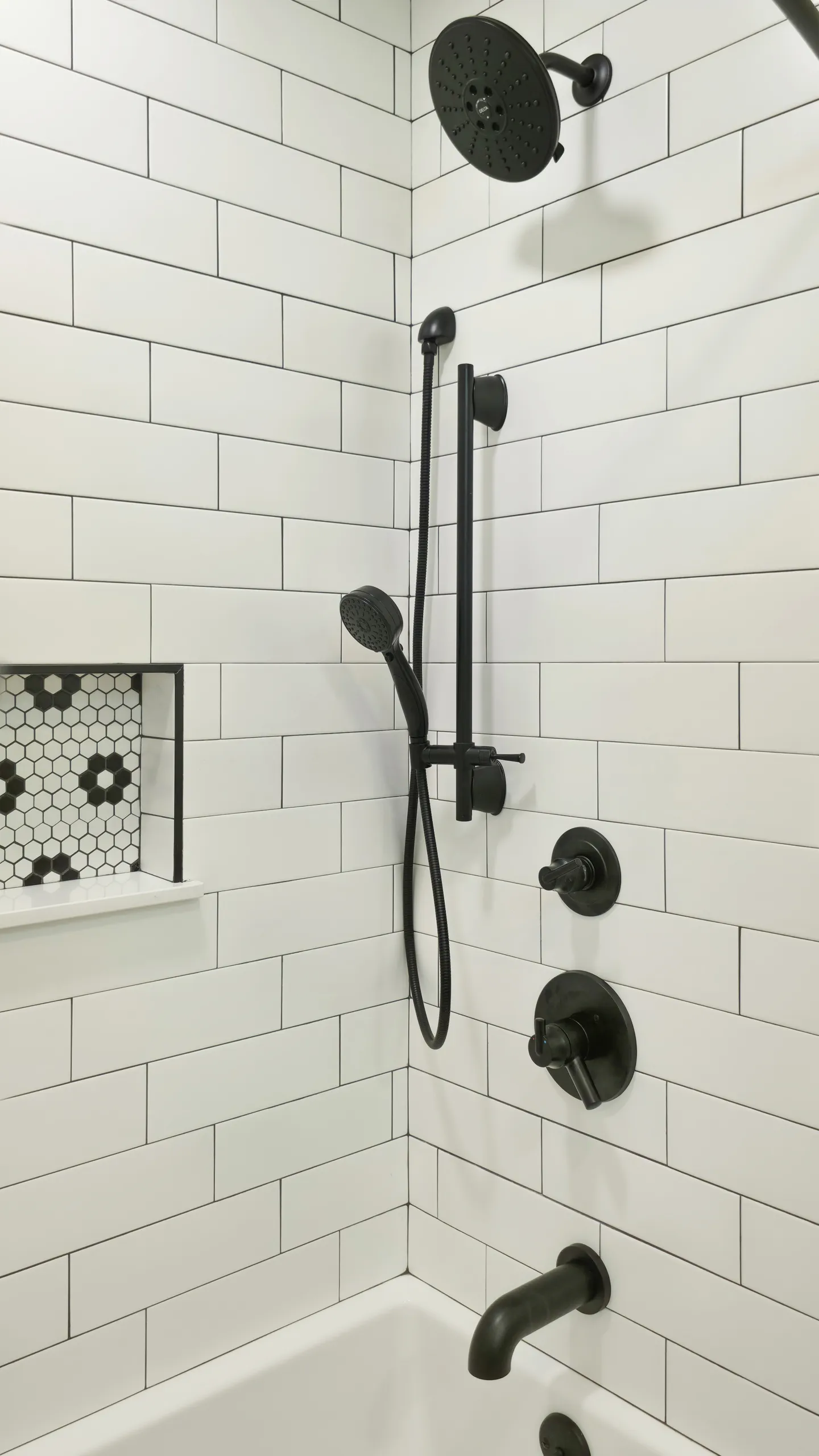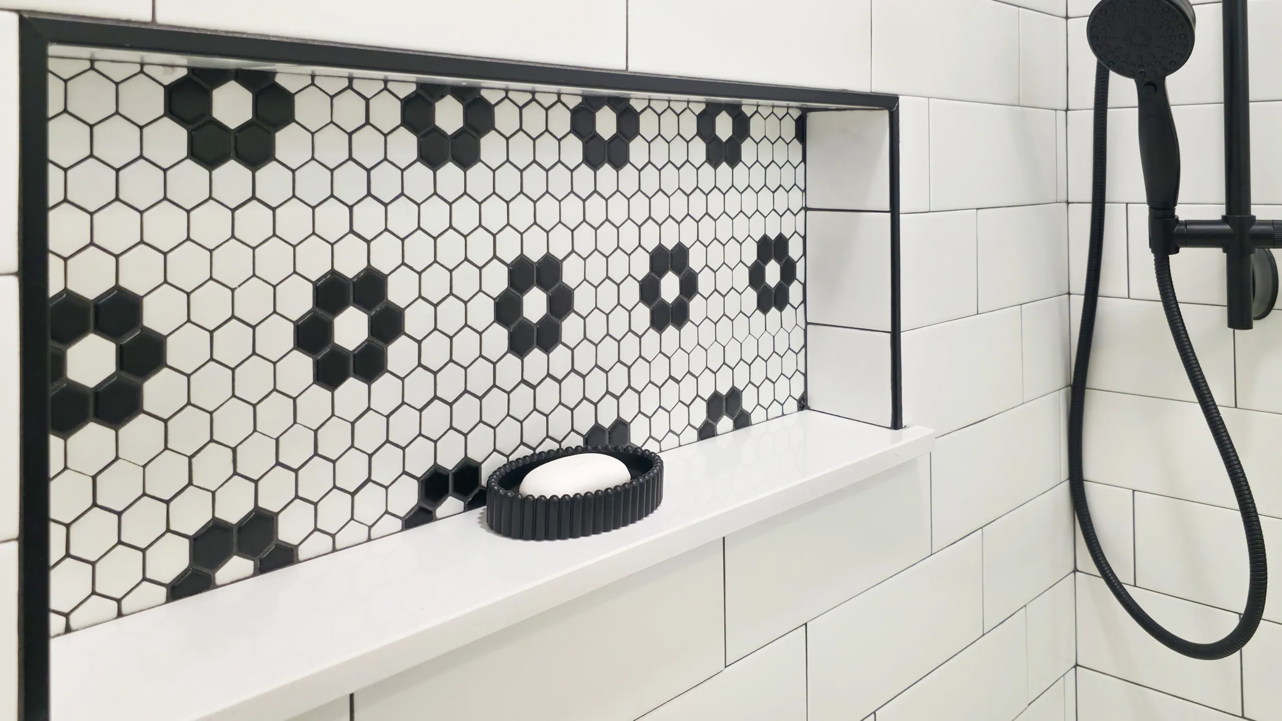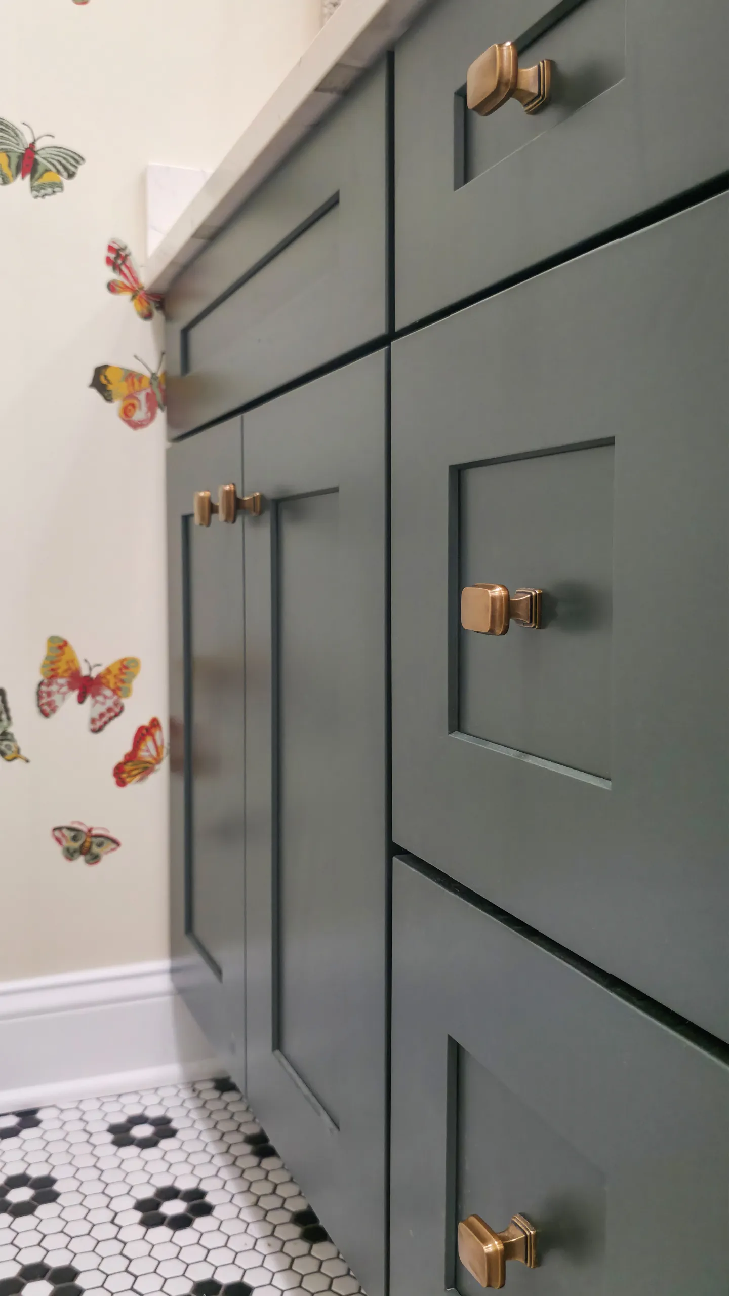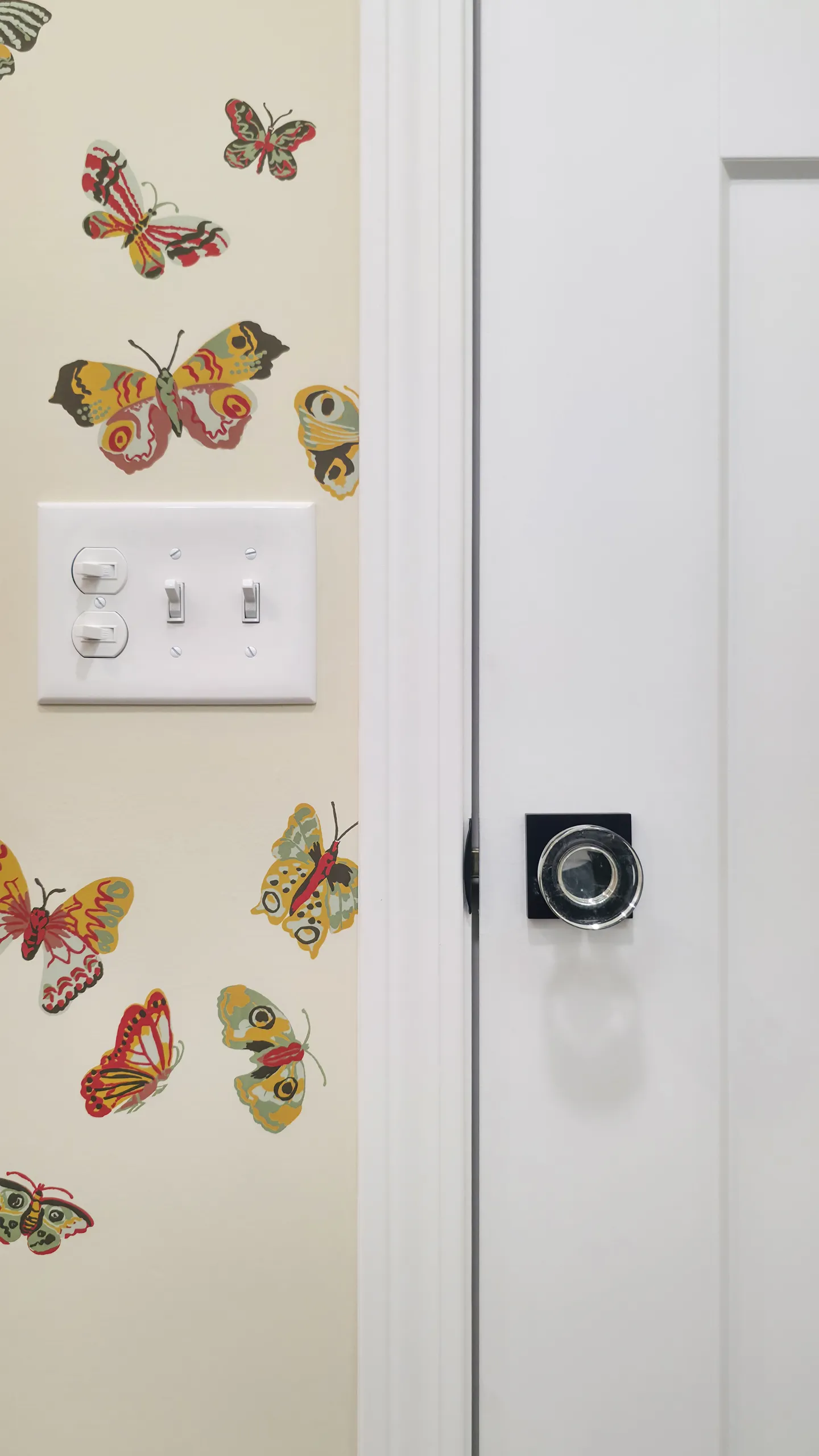 For the last bathroom of the home, the family envisioned a space that was playful, eclectic, and able to grow with their children. The standout design includes a black-and-white floral mosaic floor that carries into the shower niche, paired with a classic white subway-tiled tub trimmed in matte black. A butterfly wallpaper (supplied by our client) continues the trend of stylish wallpaper found throughout the home. A double vanity in Foxhall Green, featuring burnished brass hardware, is adorned with black Delta Trinsic faucets and oval mirrors, striking a balance between timeless and fun.