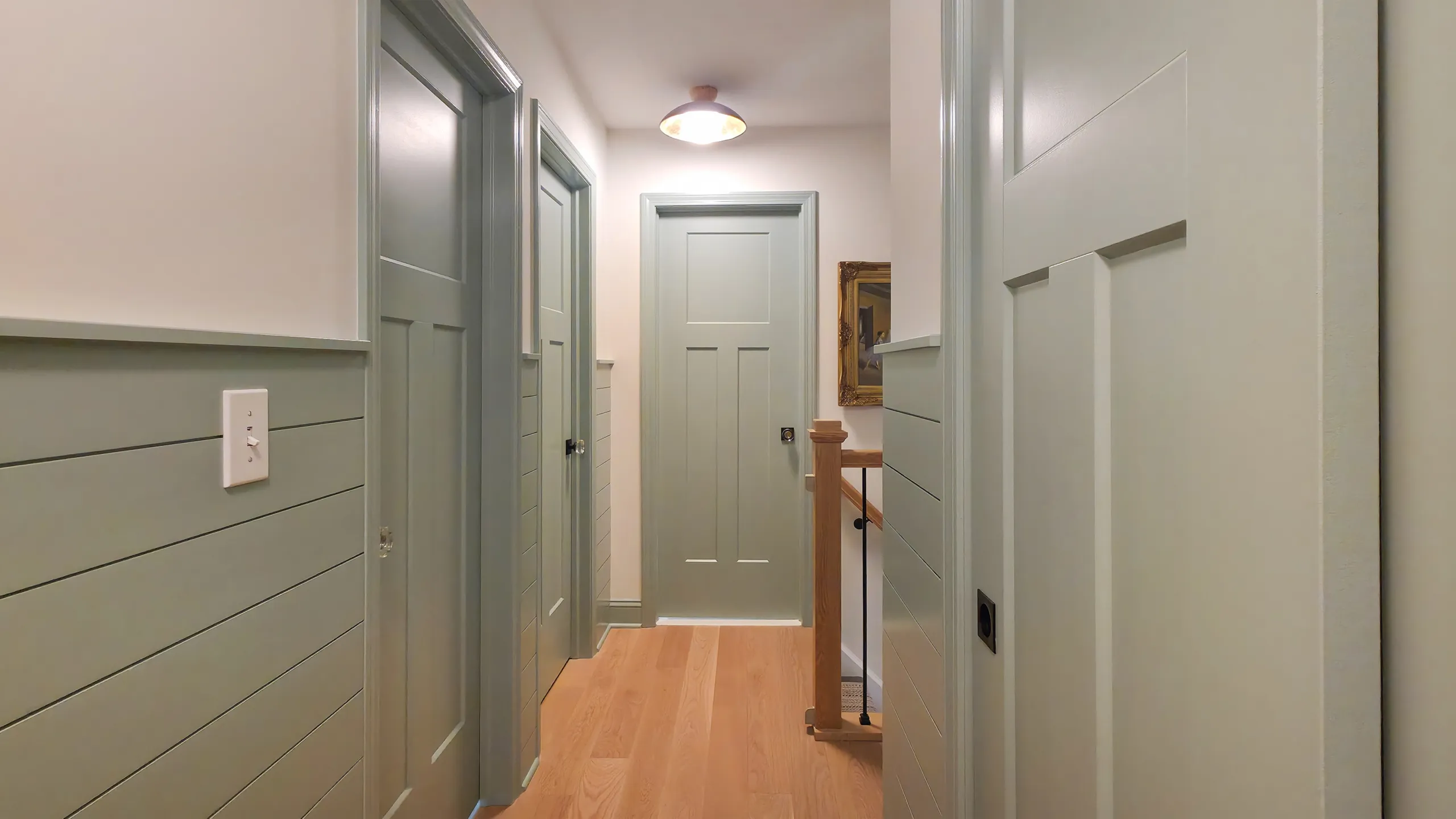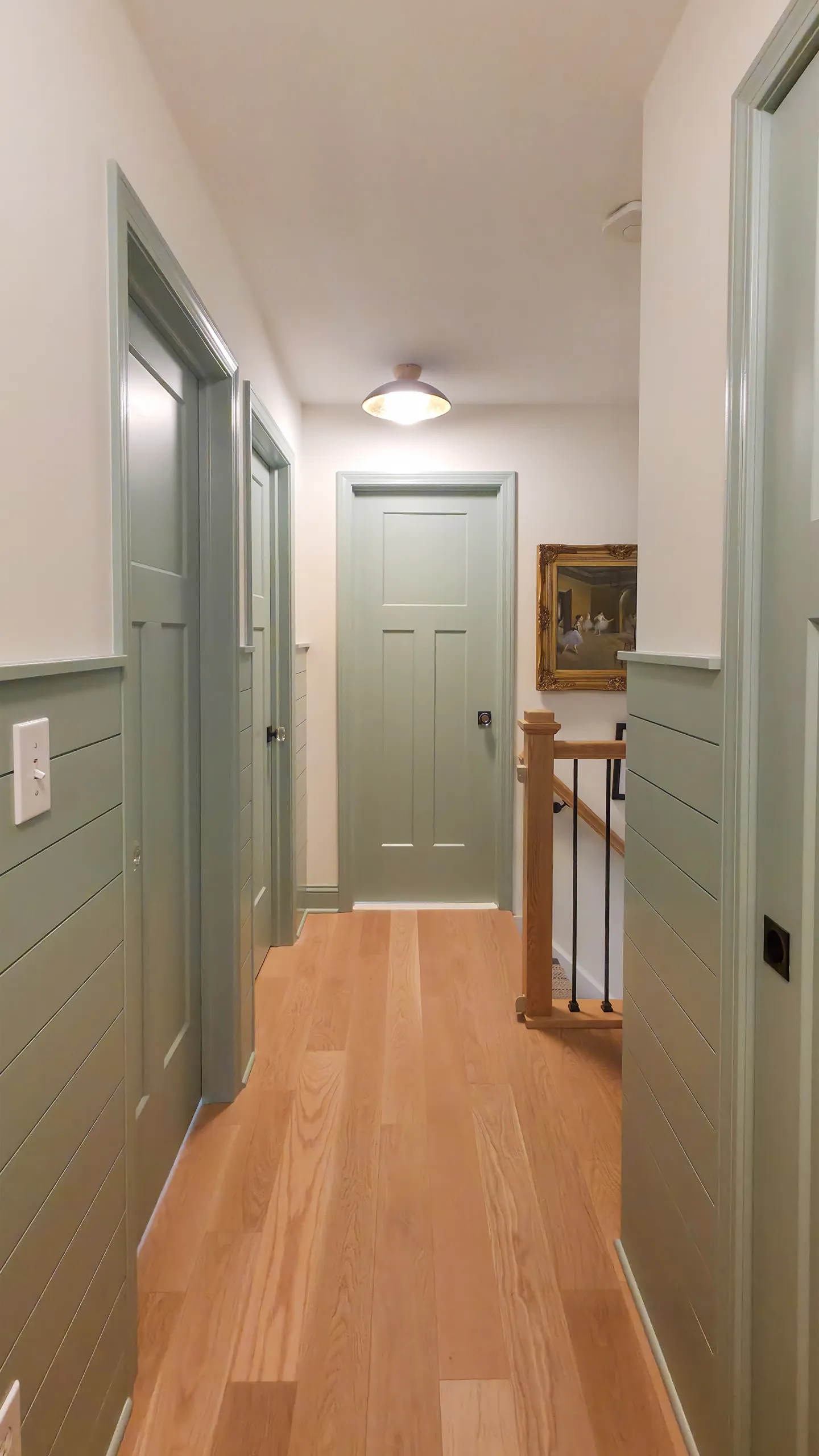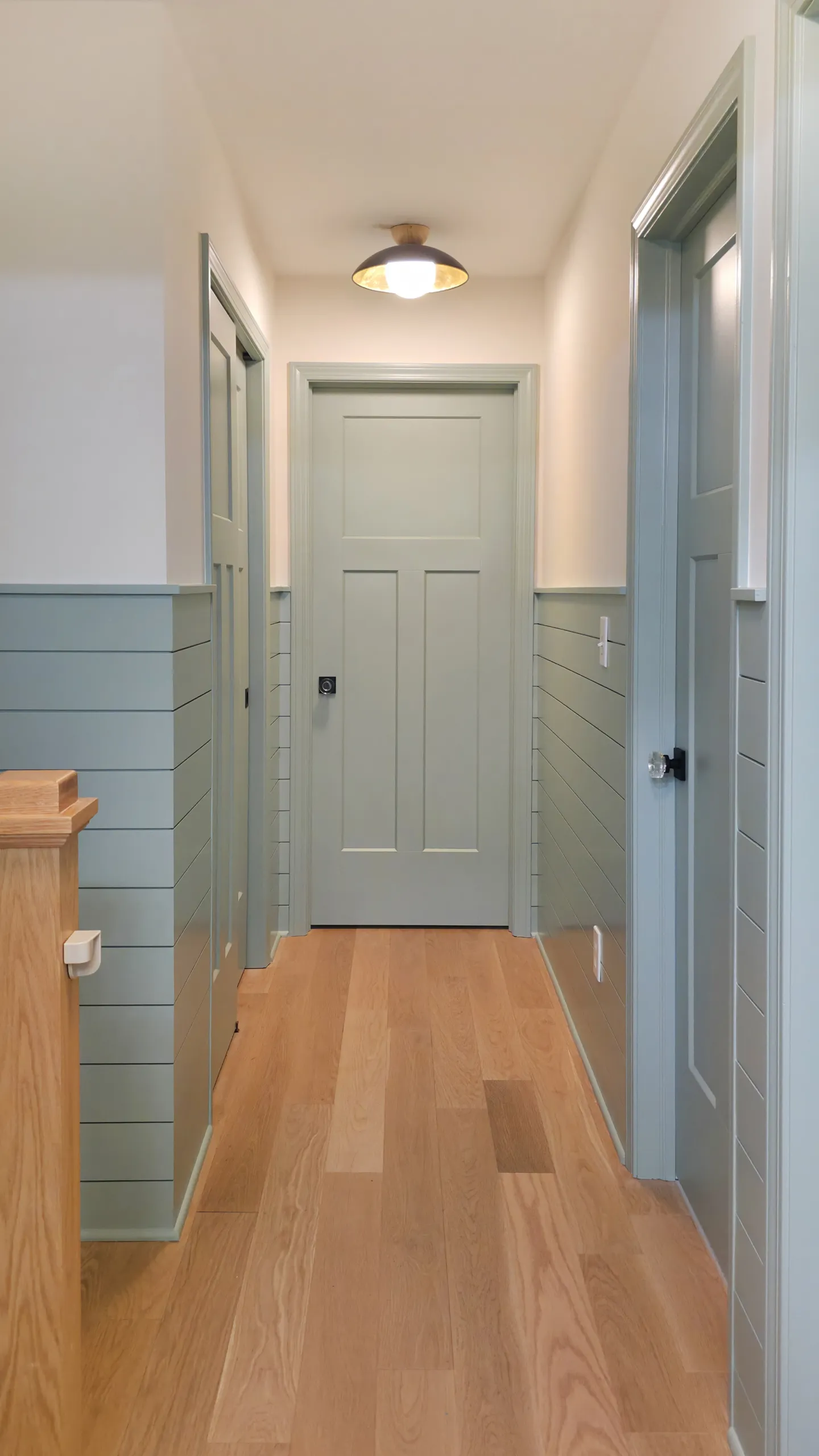 Upstairs, we put in new flooring the first time around, but now it was time to give the hallway a facelift. We installed halcyon blue wainscoted walls and doors accented by matte black glass knobs.