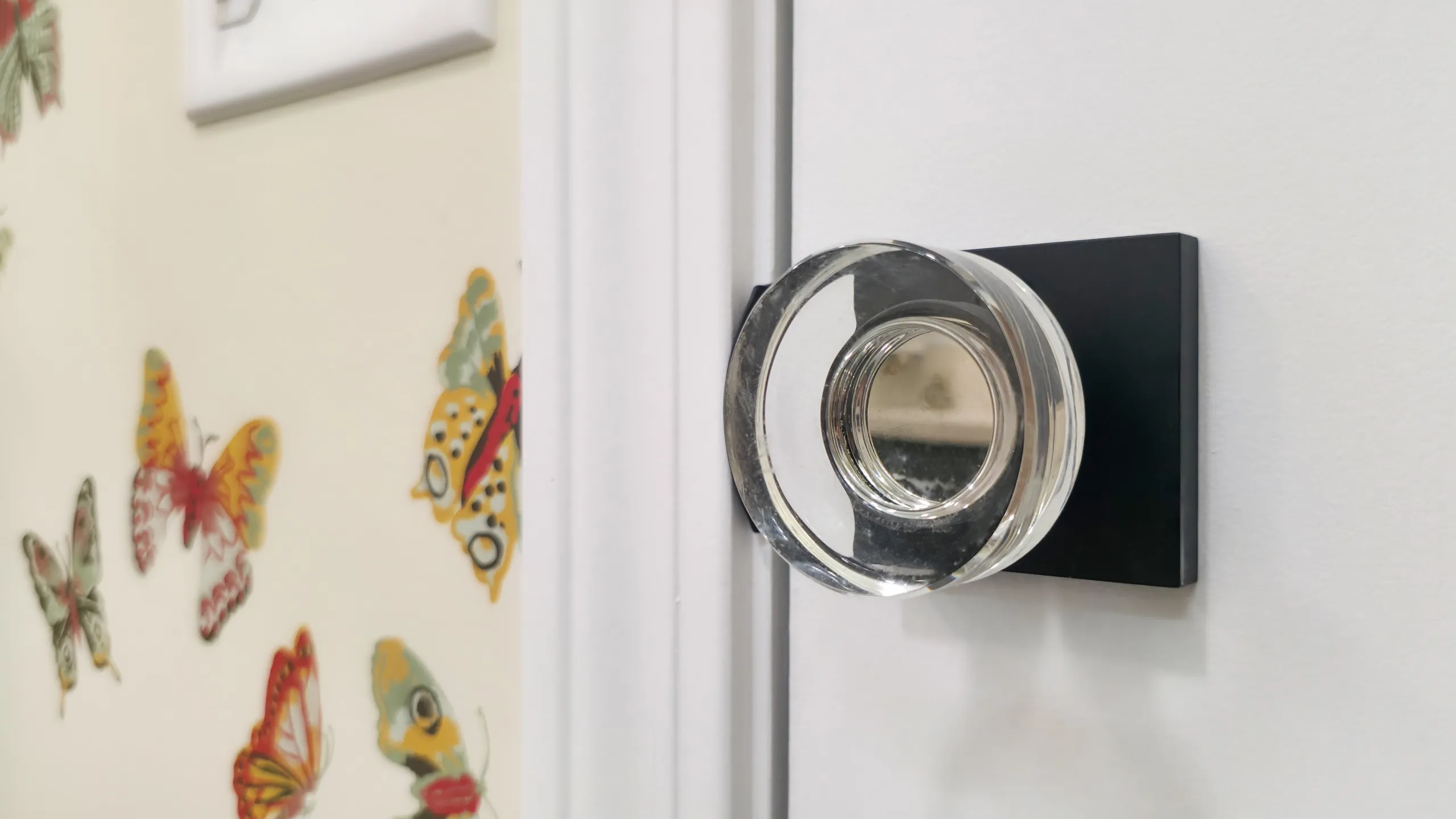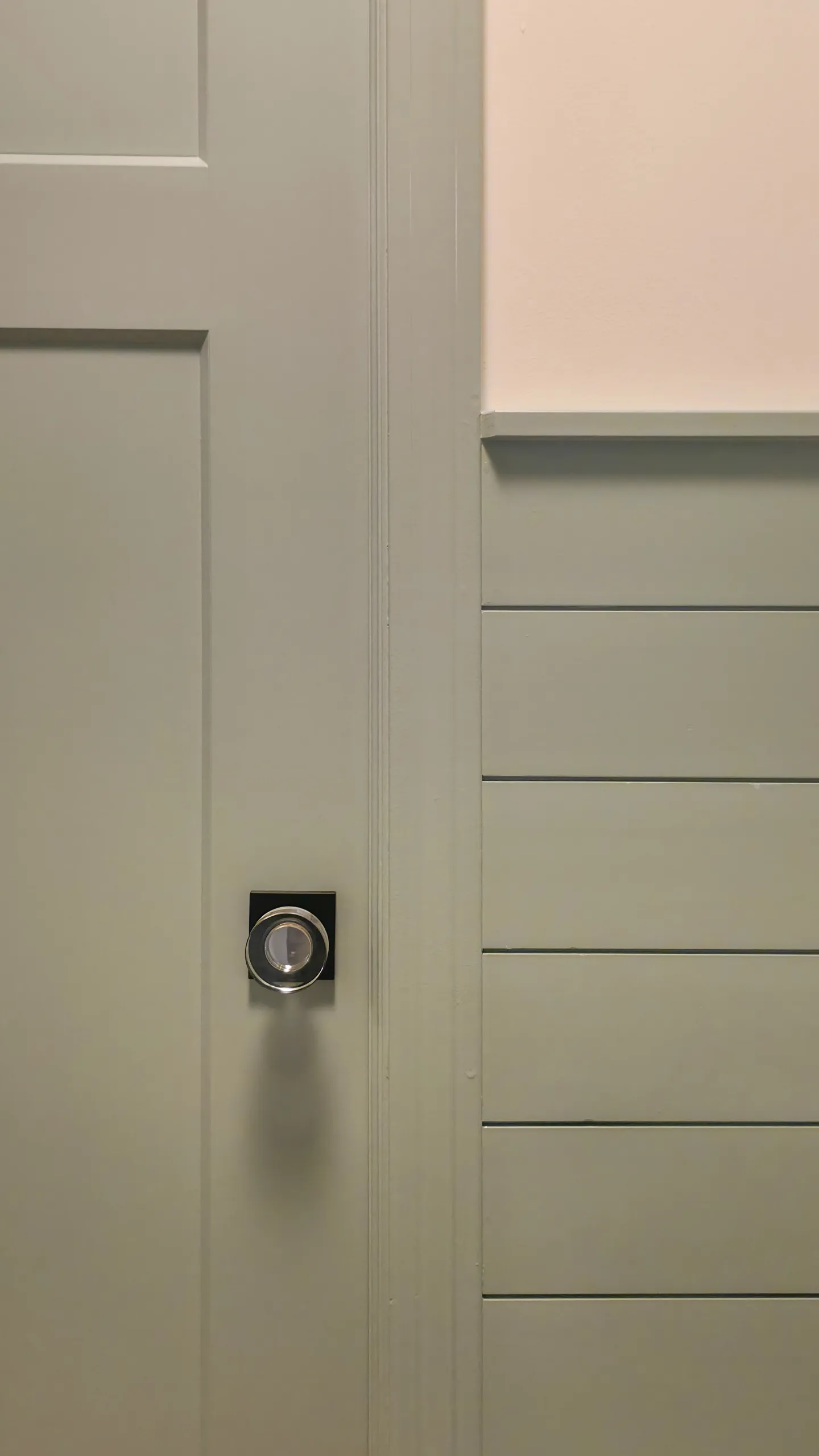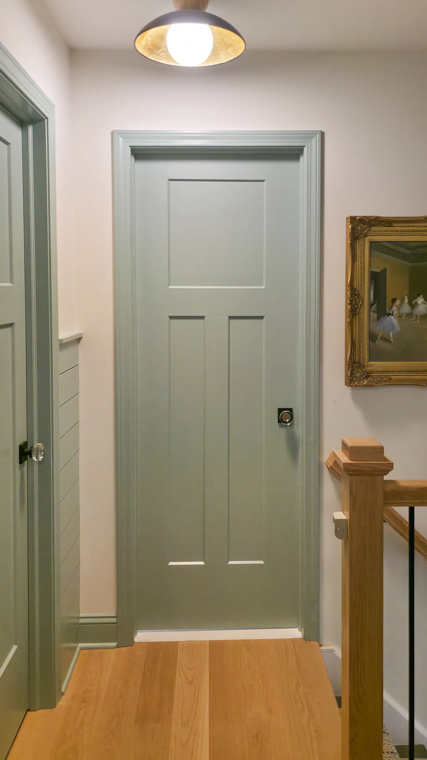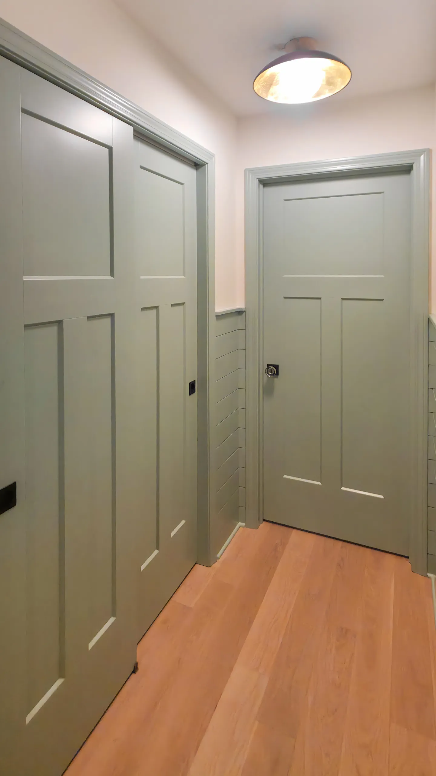 Upstairs, we put in new flooring the first time around, but now it was time to give the hallway a facelift. We installed halcyon blue wainscoted walls and doors accented by matte black glass knobs.