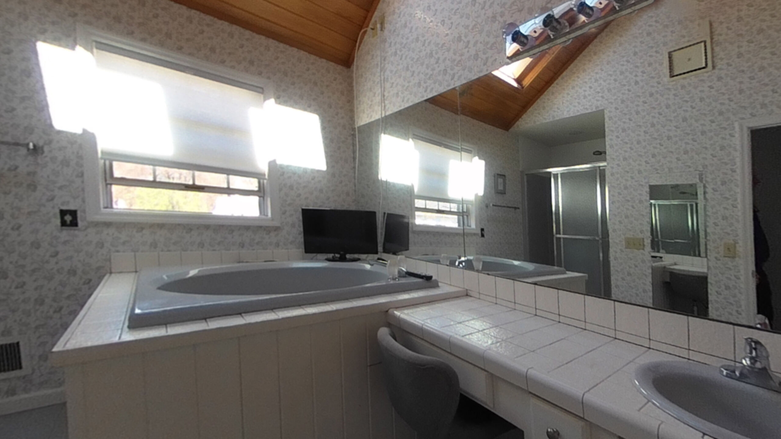 This used to be a bathroom that looked right at home in the early 90’s. Wood-paneled ceiling, wallpaper, and a tub you had to climb stairs to get into were a little too much for these homeowners to handle anymore.