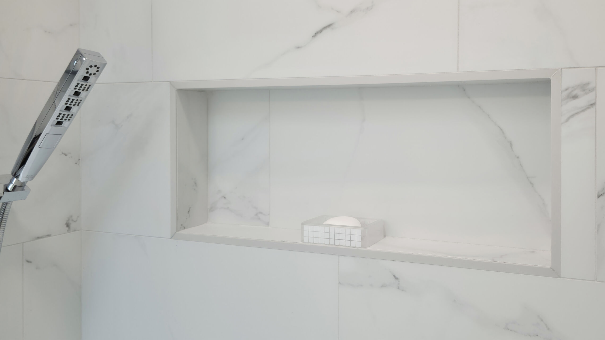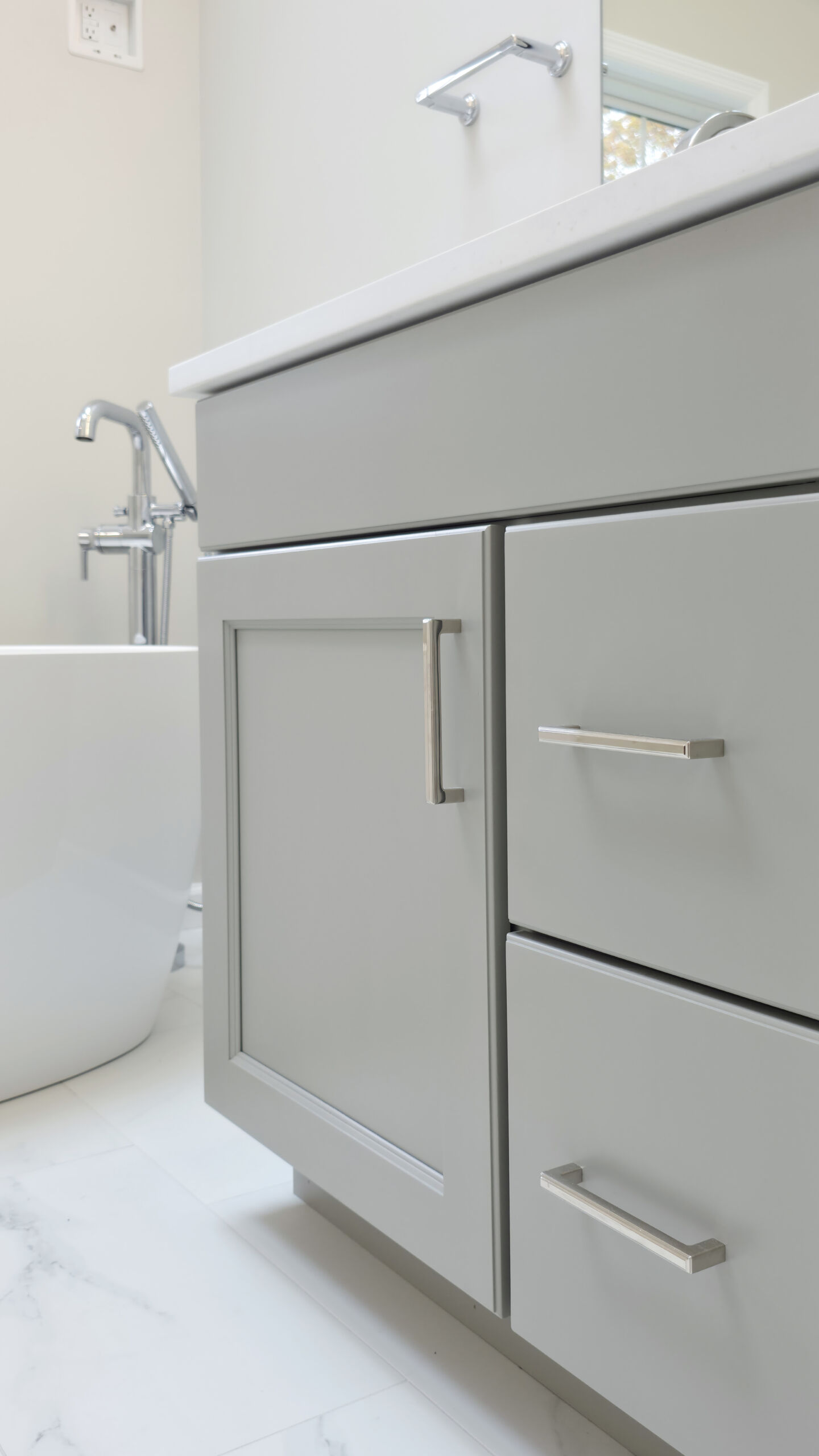 The sleek freestanding tub replaced the old stepped-in tub, making baths a less hazardous option for the homeowners. Carrara-look tile wraps the walk-in shower walls and extends down to the entire floor. As one of the first projects to go through our new Design Center, it benefited greatly in both time and costs. We haven’t officially clocked it yet, but this remodel may have broken our record for the fastest completed project.