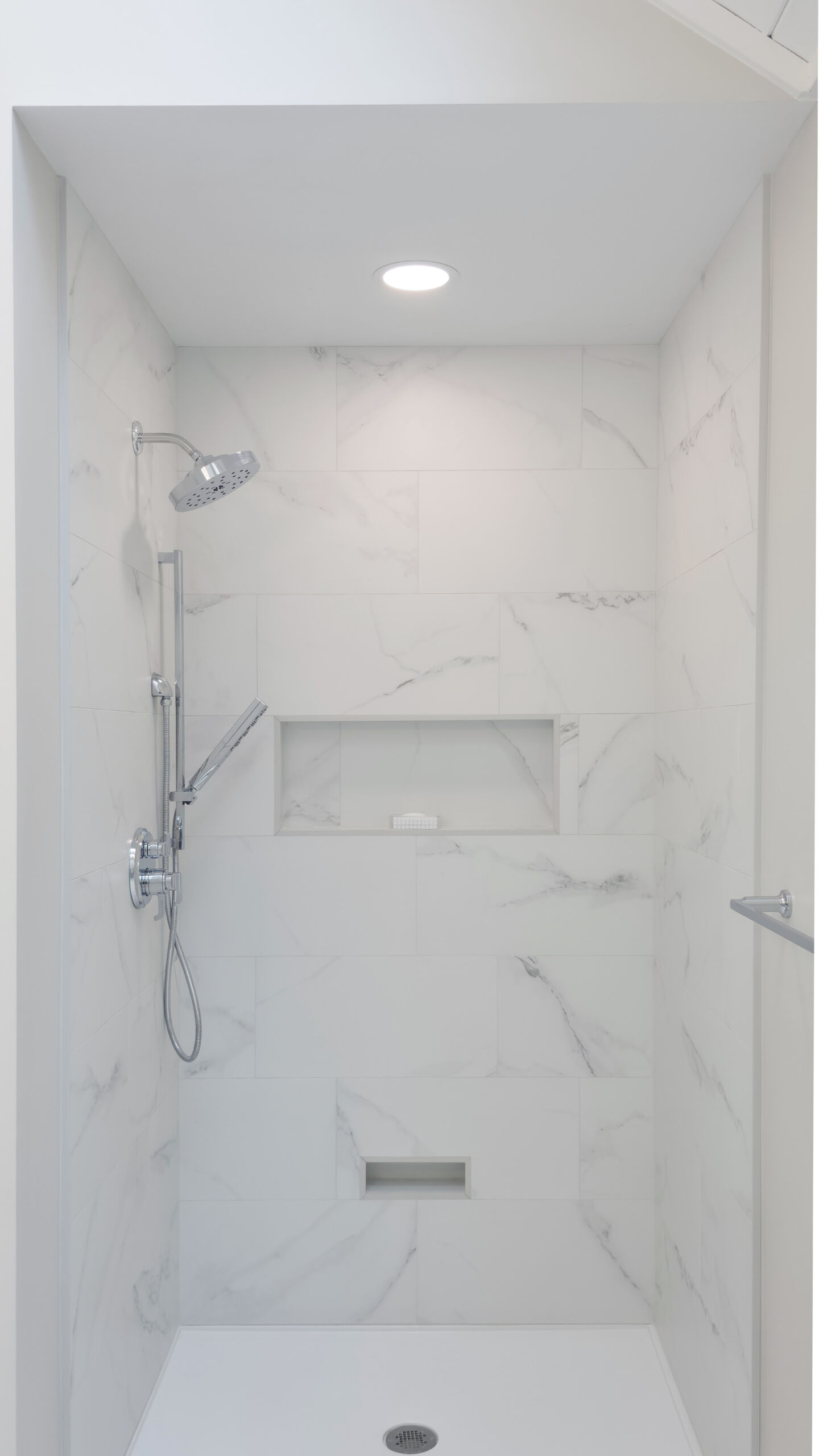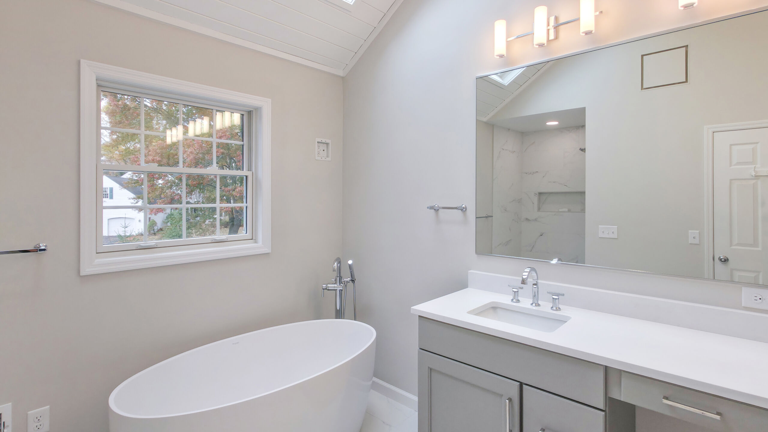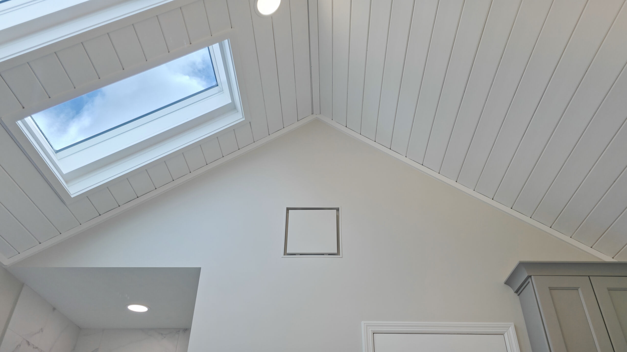 Starting from the top, the old wood-paneled vaulted ceilings were highlighted with fresh paint and enhanced recessed lighting. A new integrated ventilation solution replaced the previous exposed unit for a more seamless look. A custom 10ft vanity anchors the room, offering generous countertop space and added drawer storage for everyday essentials. His-and-hers sinks flank a extra large mirror. Light quartz countertops with subtle gray accents keep the palette bright and refined, paired with polished chrome plumbing fixtures and hardware.