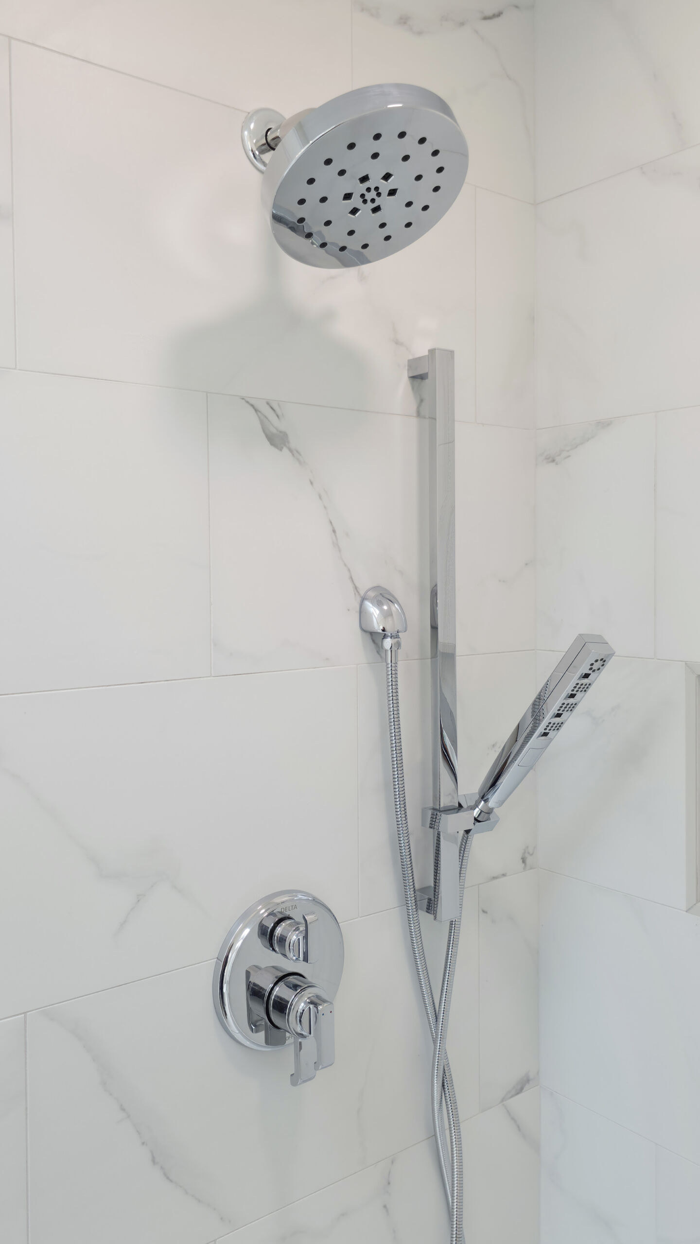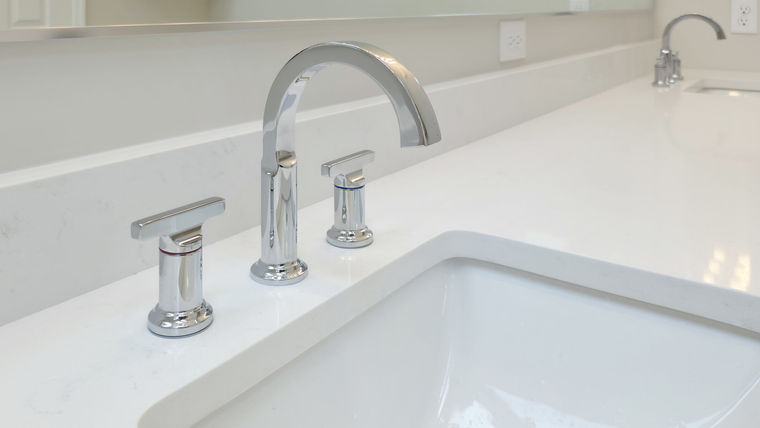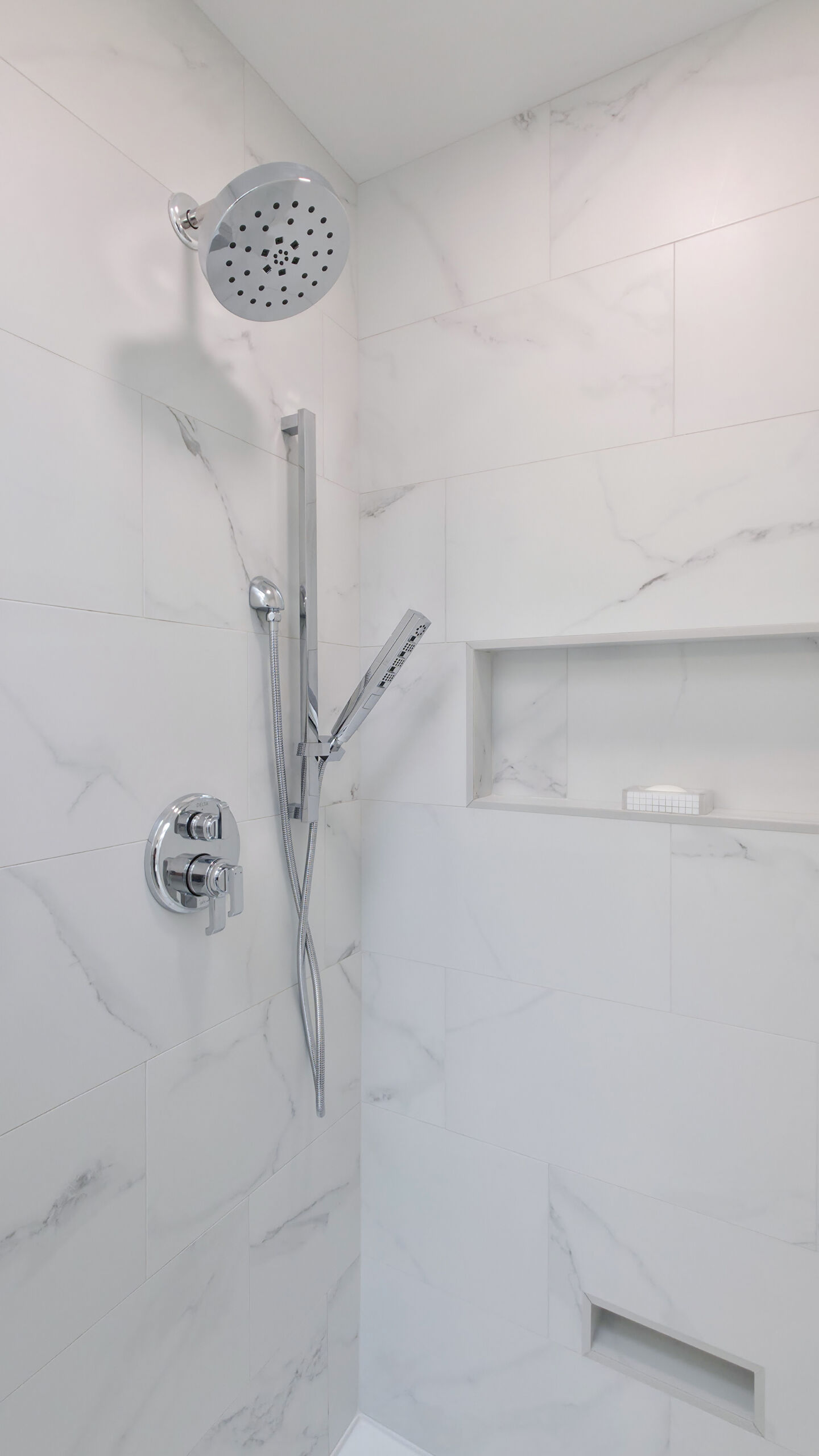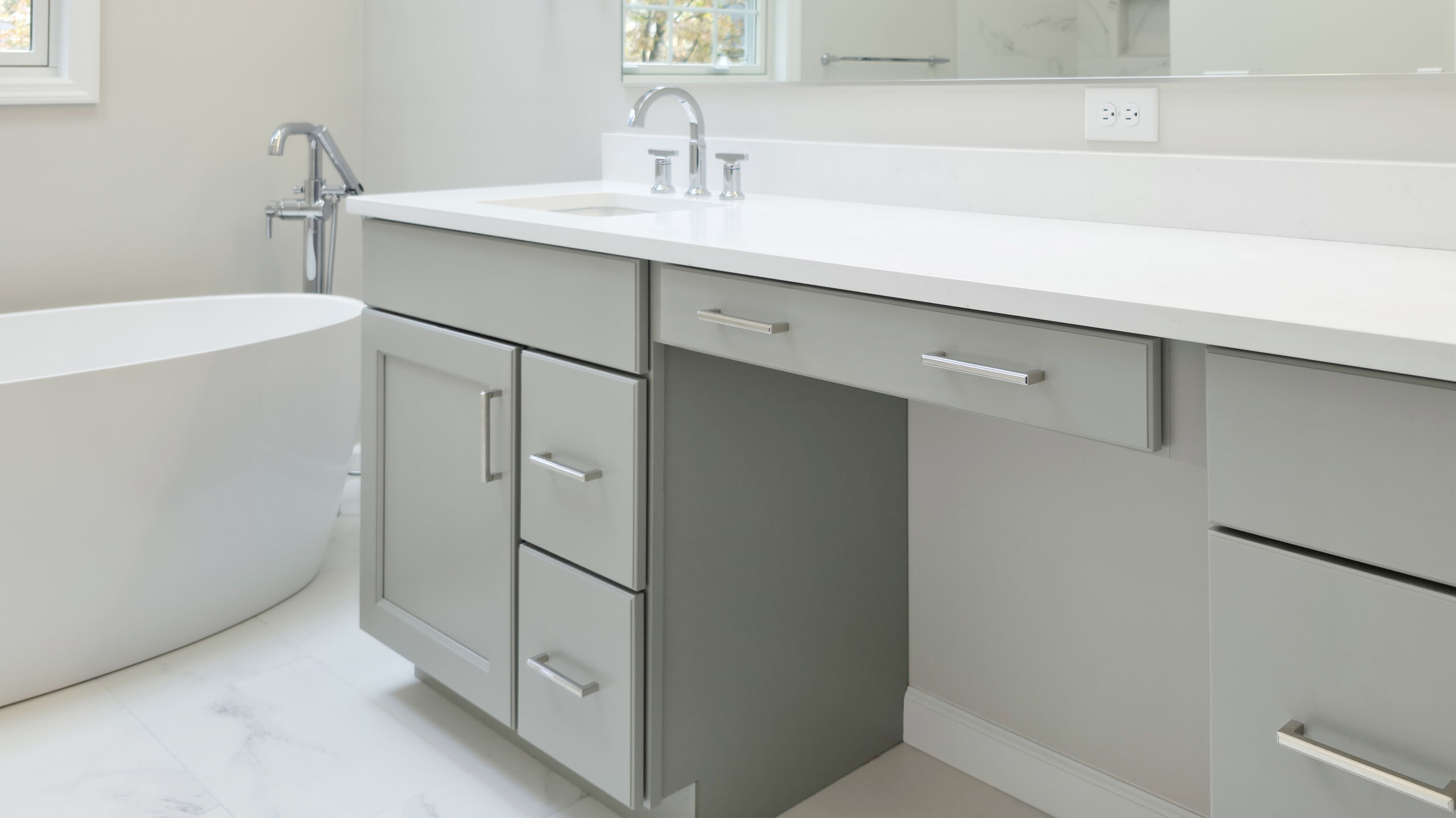 Starting from the top, the old wood-paneled vaulted ceilings were highlighted with fresh paint and enhanced recessed lighting. A new integrated ventilation solution replaced the previous exposed unit for a more seamless look. A custom 10ft vanity anchors the room, offering generous countertop space and added drawer storage for everyday essentials. His-and-hers sinks flank a extra large mirror. Light quartz countertops with subtle gray accents keep the palette bright and refined, paired with polished chrome plumbing fixtures and hardware.