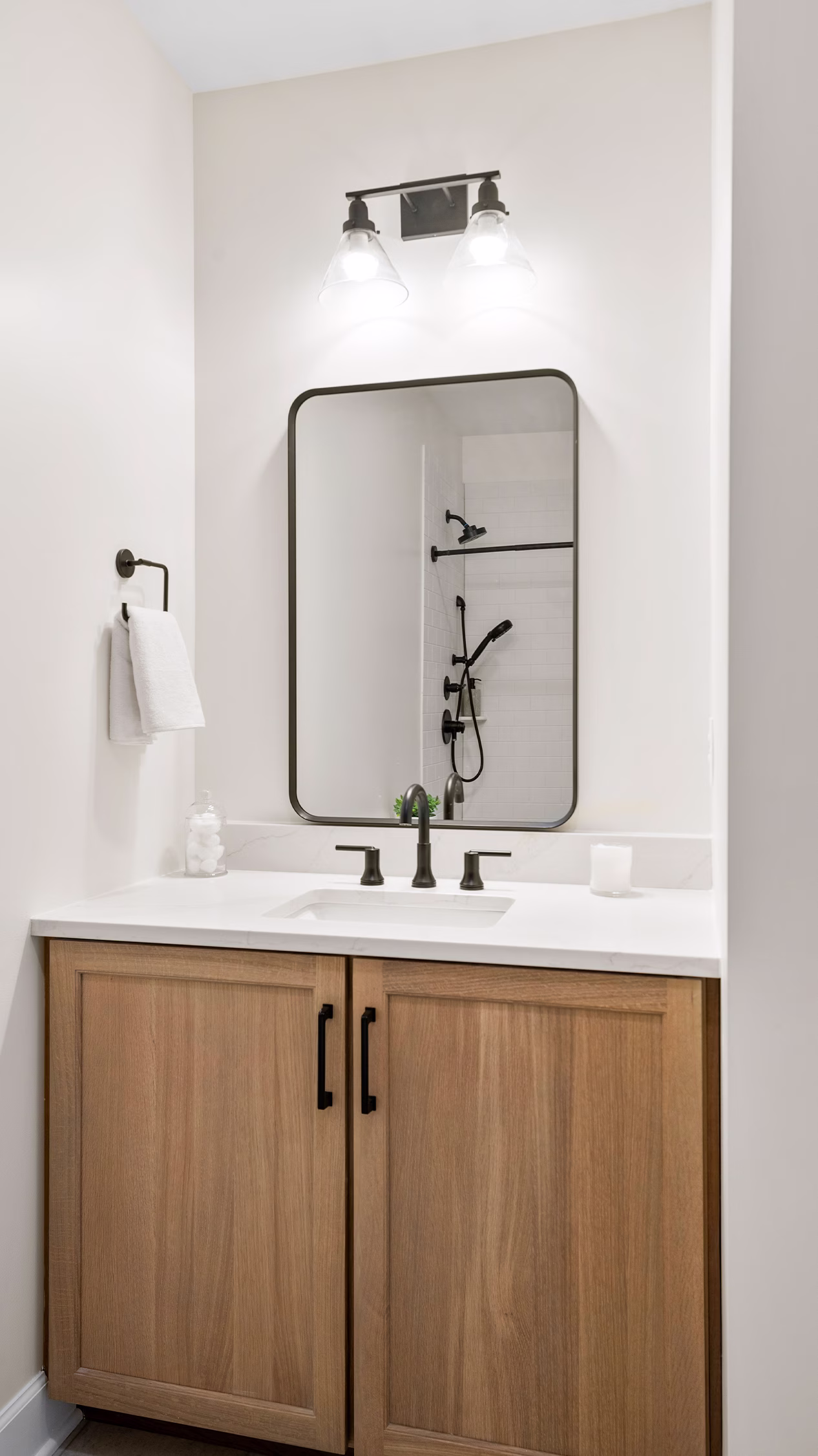 To complete the transformation, we added a full three-piece bathroom, featuring a low-profile preform shower base for easy access, a toilet, and a beautiful white oak vanity with a quartz countertop. Inside the linen closet, custom-built wood shelves match the TV built-in, adding continuity and thoughtful design elements throughout the space.