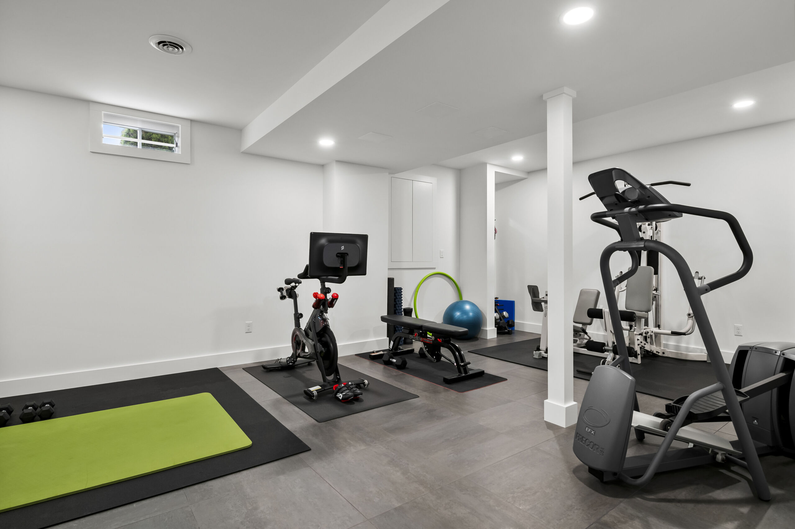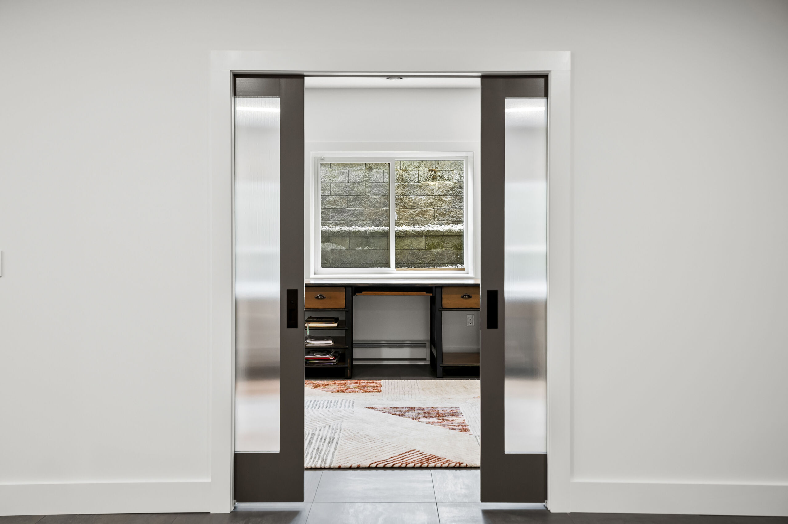 This basement remodel was over 1000 sqft and included space for a well-appointed home gym, a functional home office/cozy guest room, ample storage solutions, and a bathroom designed with simplicity and efficiency, highlighted wonderfully by the European-style floating vanity and accessible walk-in shower.