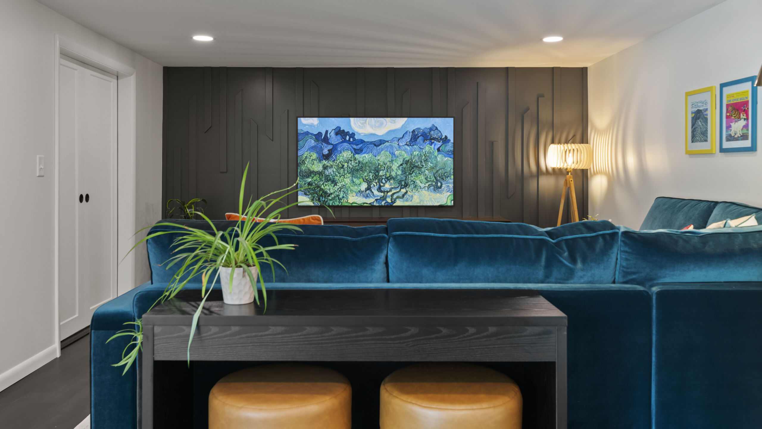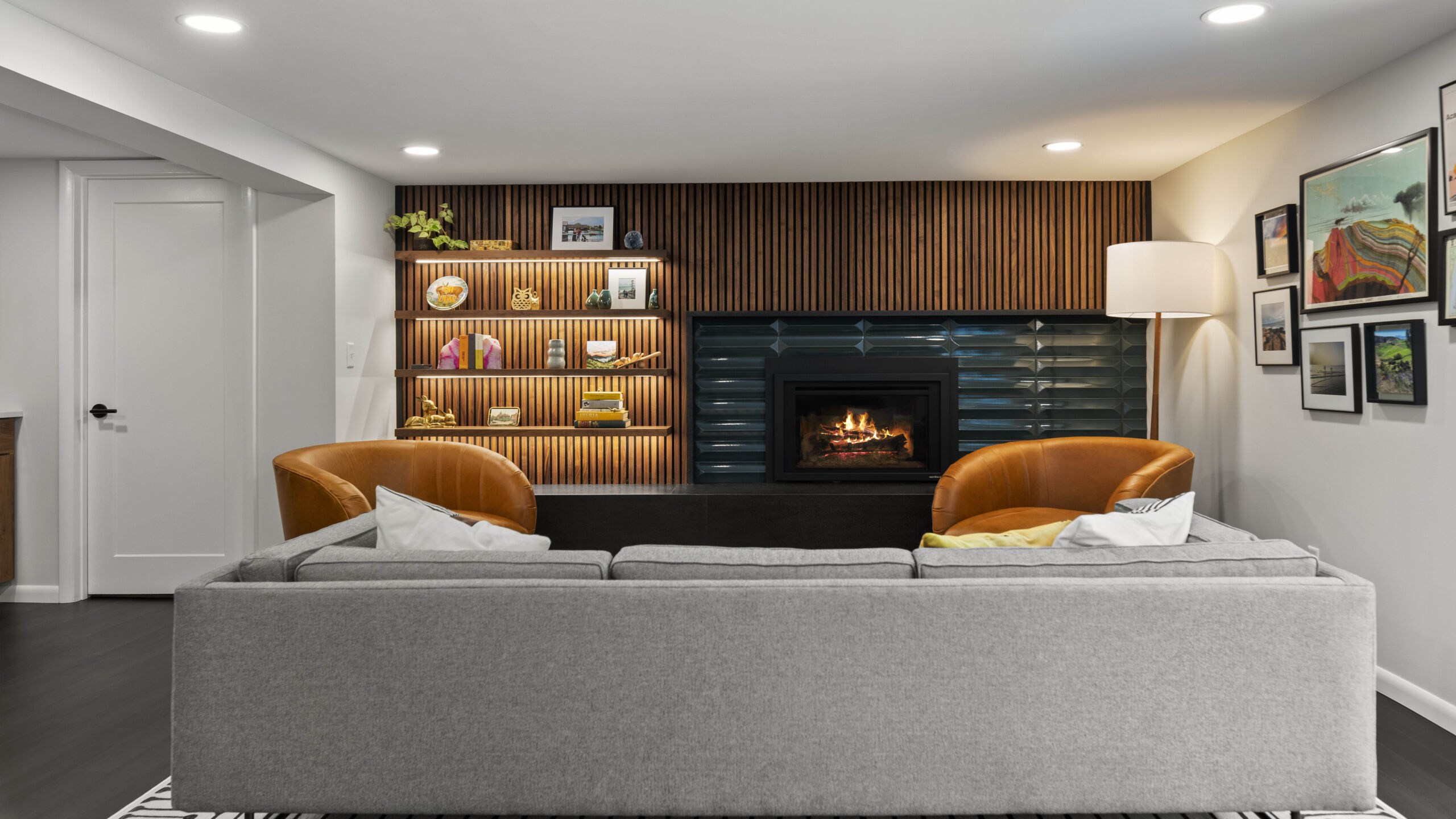 The basement is cleverly divided into two distinct lounge areas, one for the parents (and their friends) and the other for their children. The adult lounge area closest to the kitchenette offers a sophisticated retreat with a slat panel veneer wall, complemented by matching floating shelves with LED lighting. The furniture and design choices here provide an intimate atmosphere perfect for entertaining guests. And no feature represents this better than the centerpiece of this basement transformation, the fireplace. The homeowners took great care to reinvent this feature. The new fireplace, with its striking design, not only enhances the visual appeal of the basement but also adds a sense of warmth and comfort. If you see the “before” pictures, the fireplace used to feel like it originated from a castle’s dungeon.