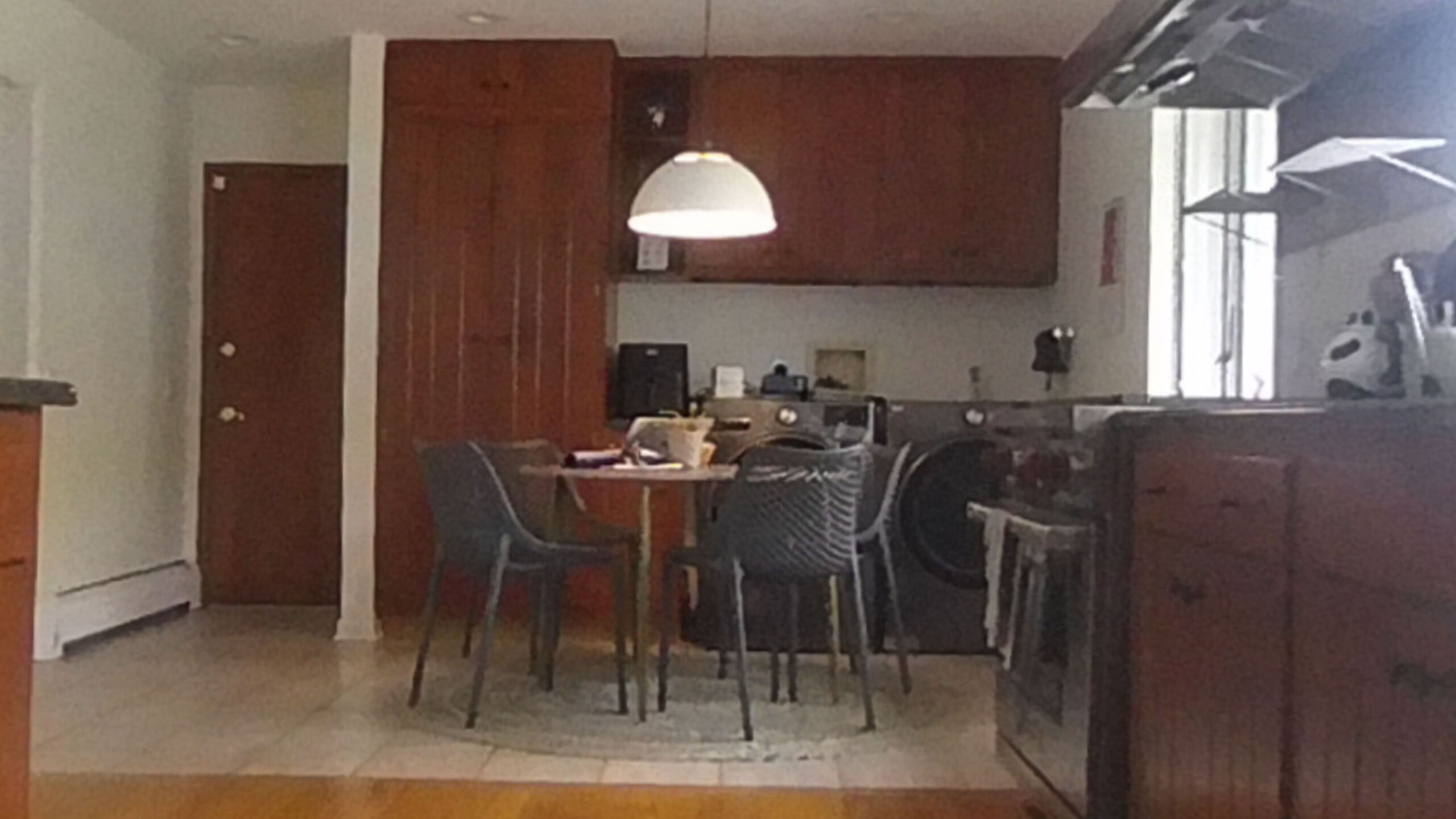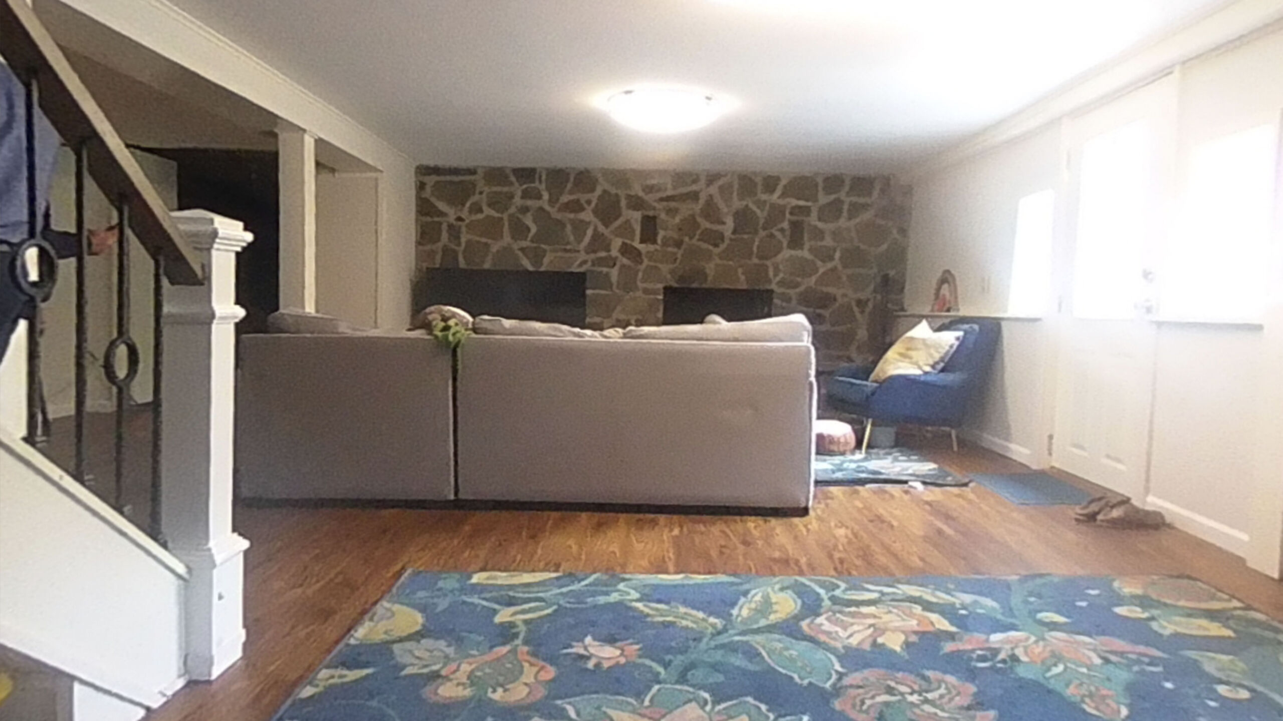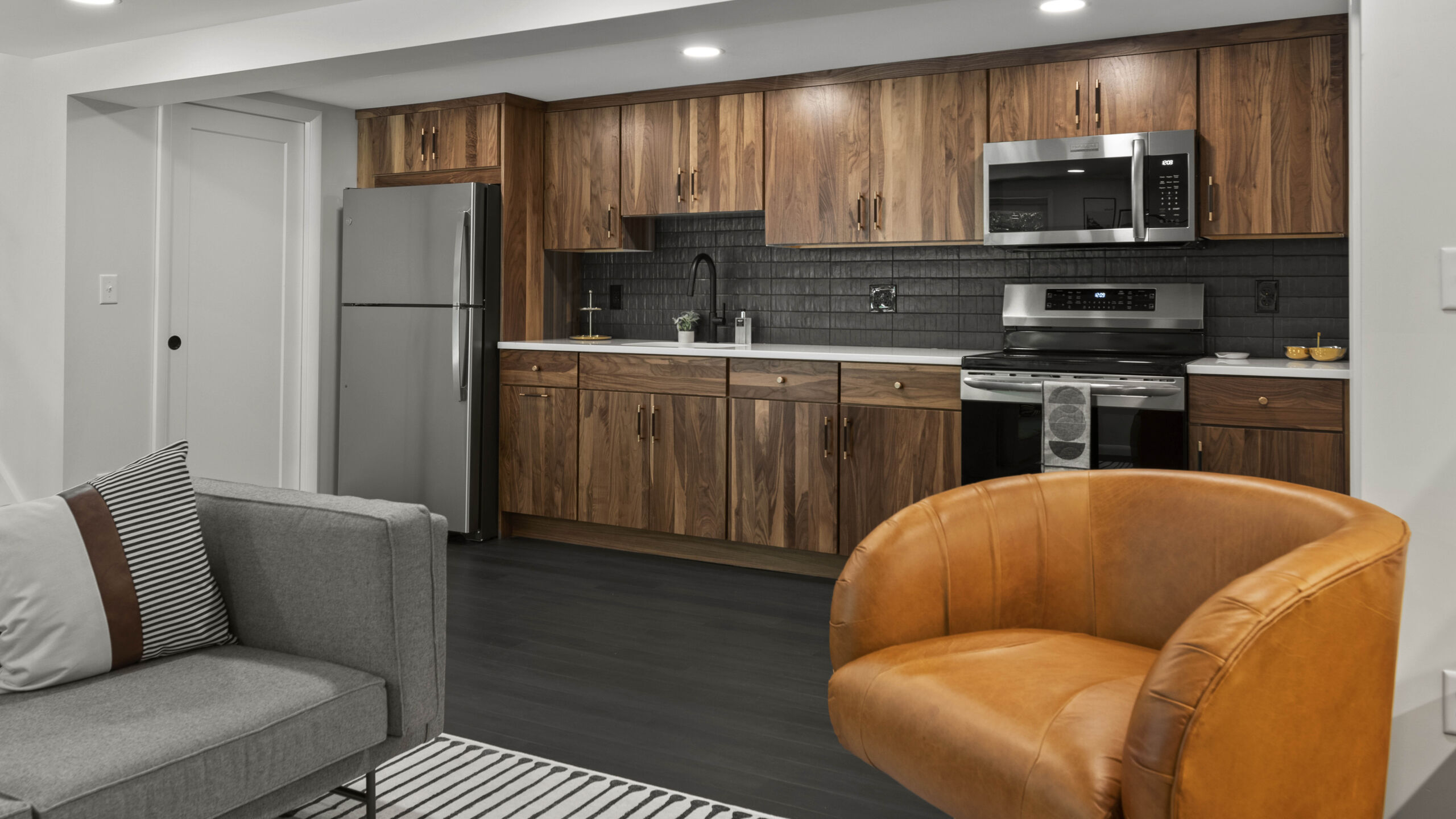 Taking the stairs down from the main level, you’ll brace yourself using the custom iron railings that connect both floors. Reaching the bottom step, immediately to your left, is the chic kitchenette, which stands out with its walnut doors, sleek black tile backsplash, and modern quartz countertops. This kitchenette was explicitly designed for functionality with an ultra-tight layout that keeps everything this family needs for cooking and entertaining in one spot.
