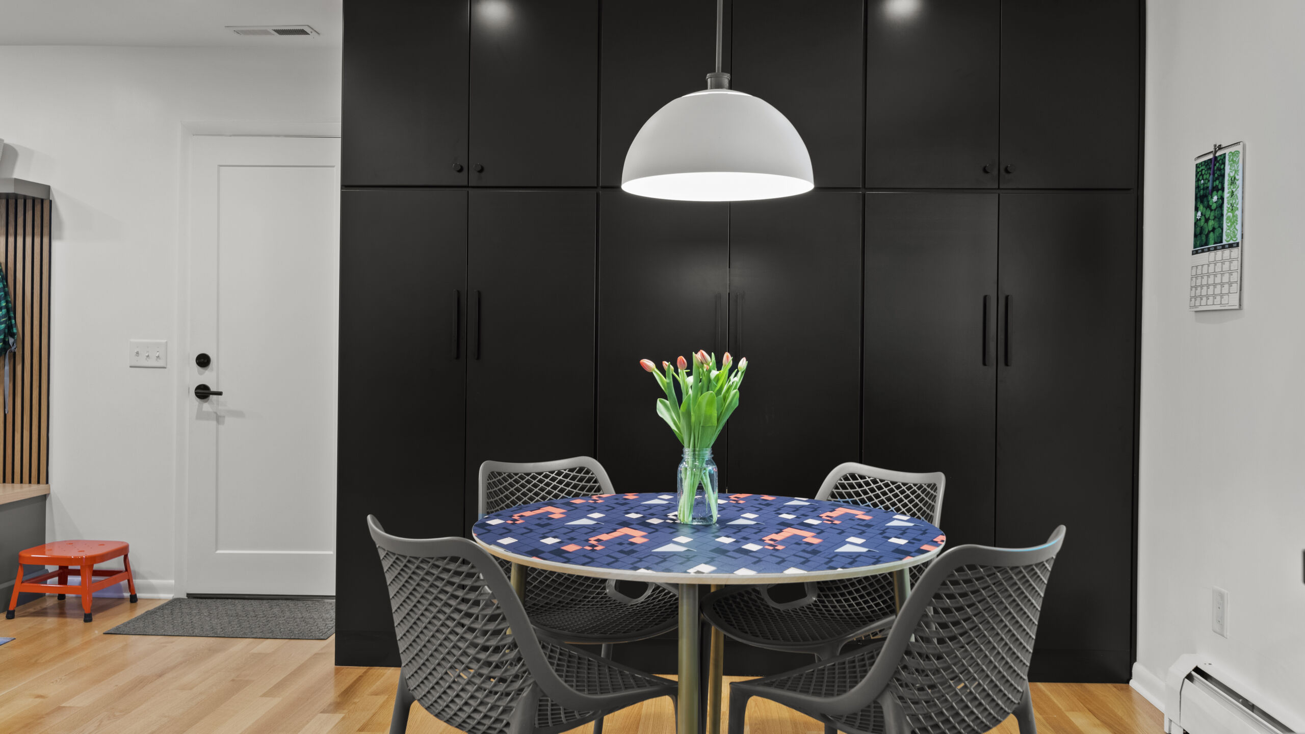 Upstairs, we updated the dining area adjacent to their kitchen with floor-to-ceiling cabinets and abundant lighting. Hidden in these cabinets are the kitchen’s small appliances (connected to in-wall outlets, keeping the space tidy and efficient. And next to the dining area is the renovated mudroom/laundry. We designed this space to keep the family organized, with ample room for coats, shoes, and everyday essentials. The custom cabinetry and storage bench make this mudroom/laundry the most functional space in the home.