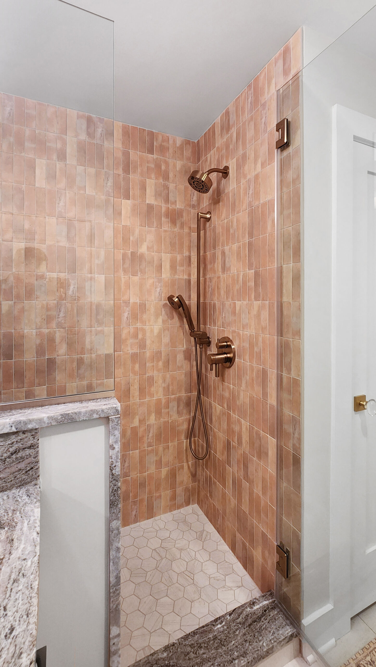 The client was deeply involved in the design process, ensuring every detail aligned with her vision of a warm, cozy, and unique bathroom space. Beginning from the bottom, the heated floor has a design that incorporates a terrazzo-inspired 12×24 stacked tile in the central area and a Brazilian quartzite in a hexagonal pattern in the shower.
