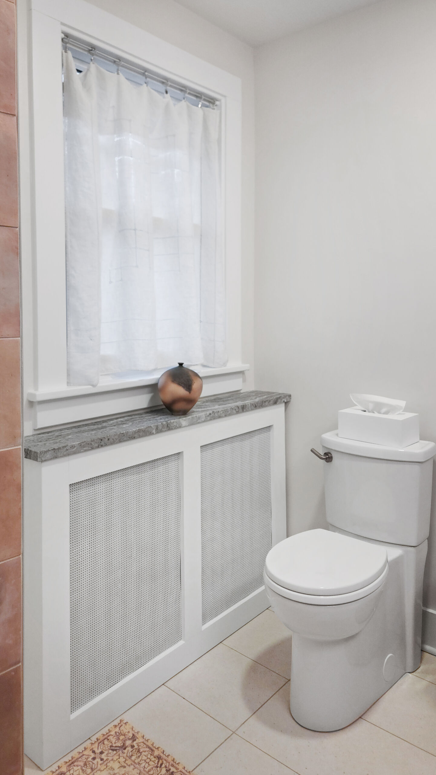 The centerpiece of the bathroom is the fully custom vanity, designed in a furniture style. Crafted from quarter-sawn white oak with a beaded inset face frame and slab drawer fronts, the vanity offers a seamless blend of beauty and function. It is topped with a stunning fantasy brown quartzite countertop, a natural stone that adds depth and character to the space. This quartzite extends into the shower and even sits atop the radiator on the other side of the bathroom beneath the window, tying the design together.