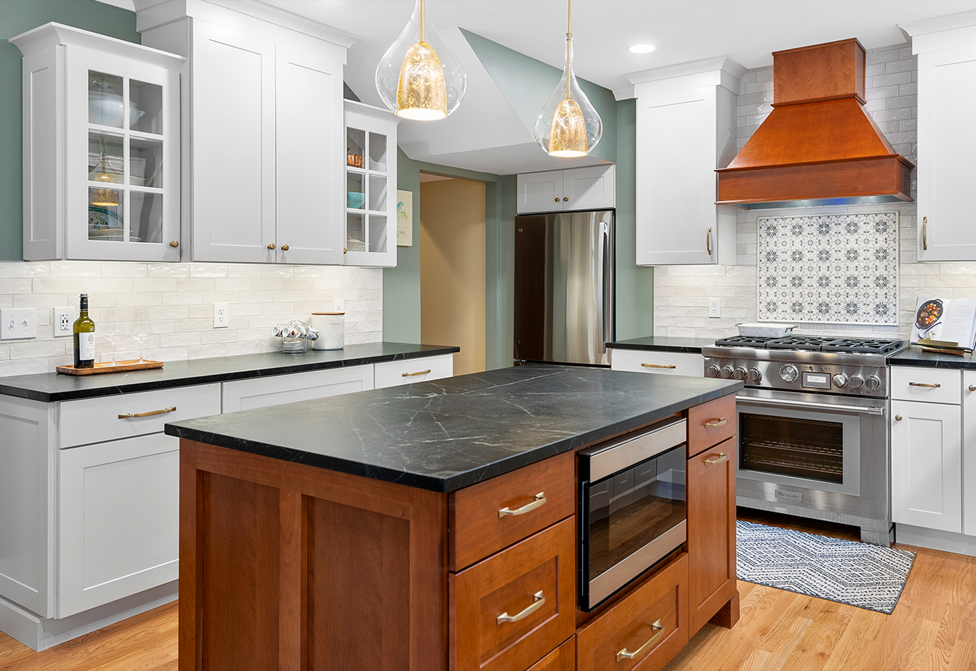 This remodel featured many earthy tones and soft finishes made to invite guests in and welcome them. Unique black soapstone countertops add a touch of elegance and perfectly complement the two-tone cabinetry (Maple Coconut and Cherry Cattail), providing a striking yet harmonious contrast.