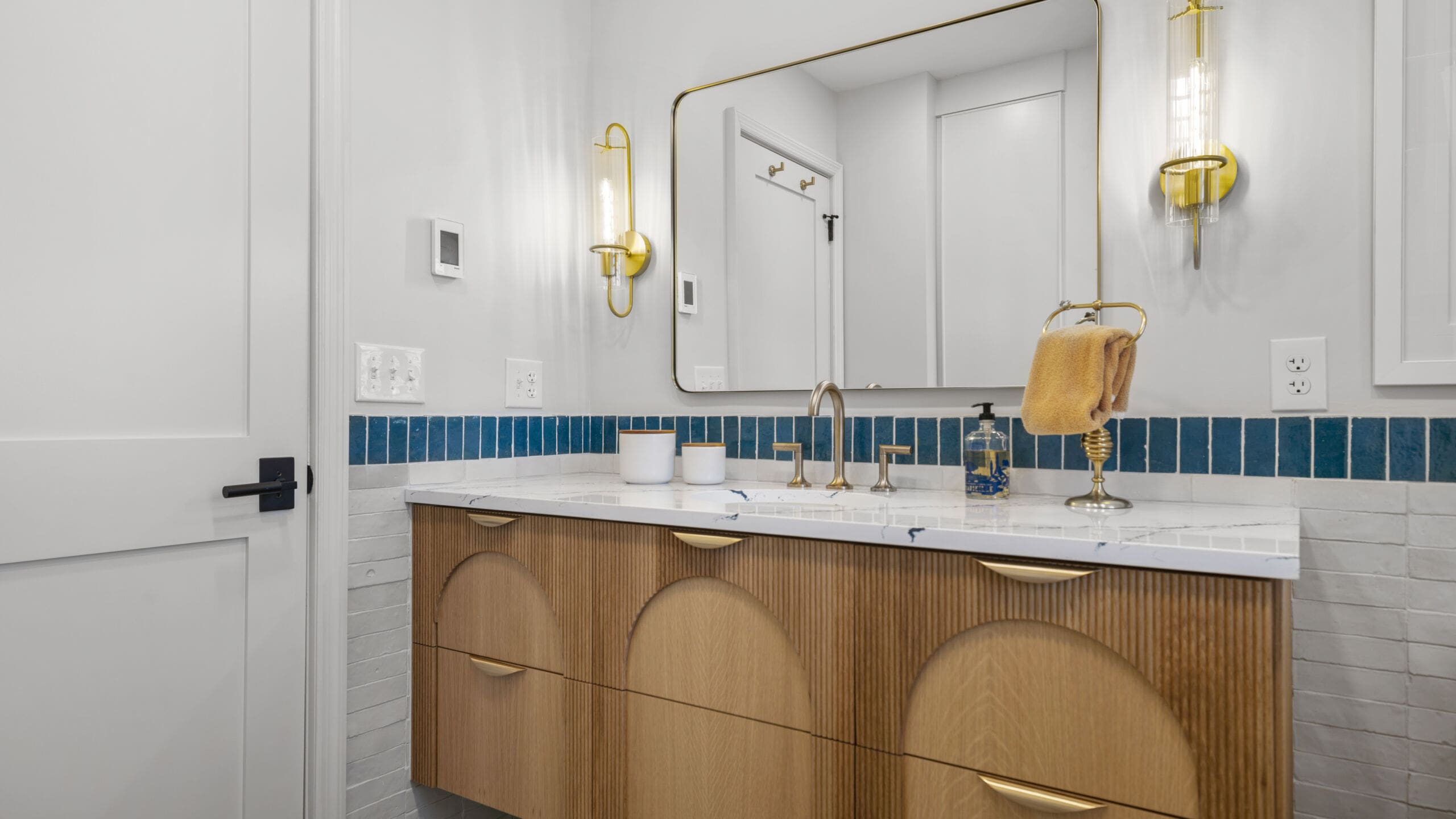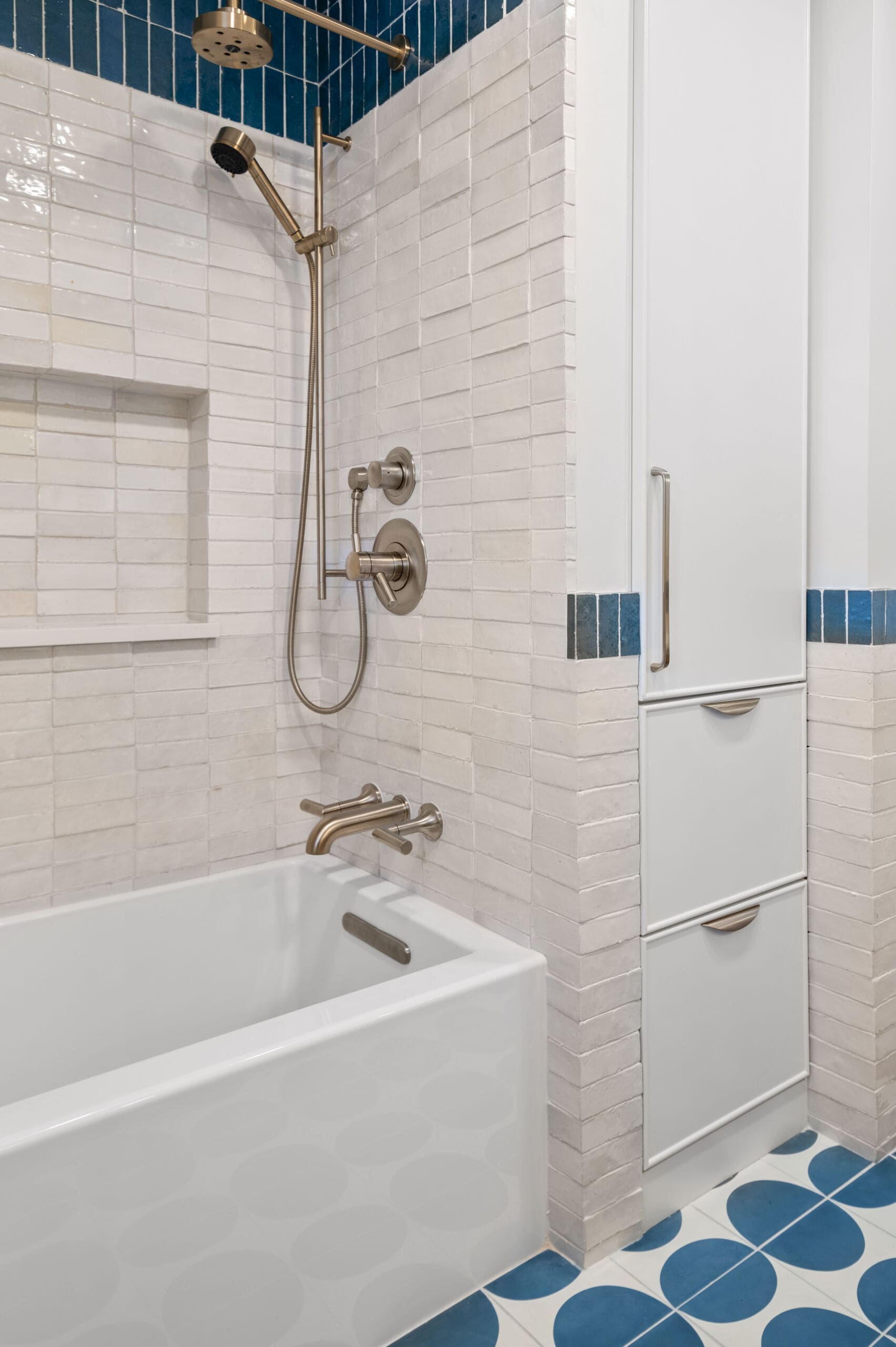 Other notable features in this bathroom remodel are the vanity countertop and matching shower niche shelf that were created by Cambria. The Brizo plumbing fixtures in brushed gold add flare. Our partners at Visual Comfort outfitted the bathroom with stunning light fixtures that illuminate the elevated the bold, patterned floor tiles that elevate the playful aesthetic of this room.