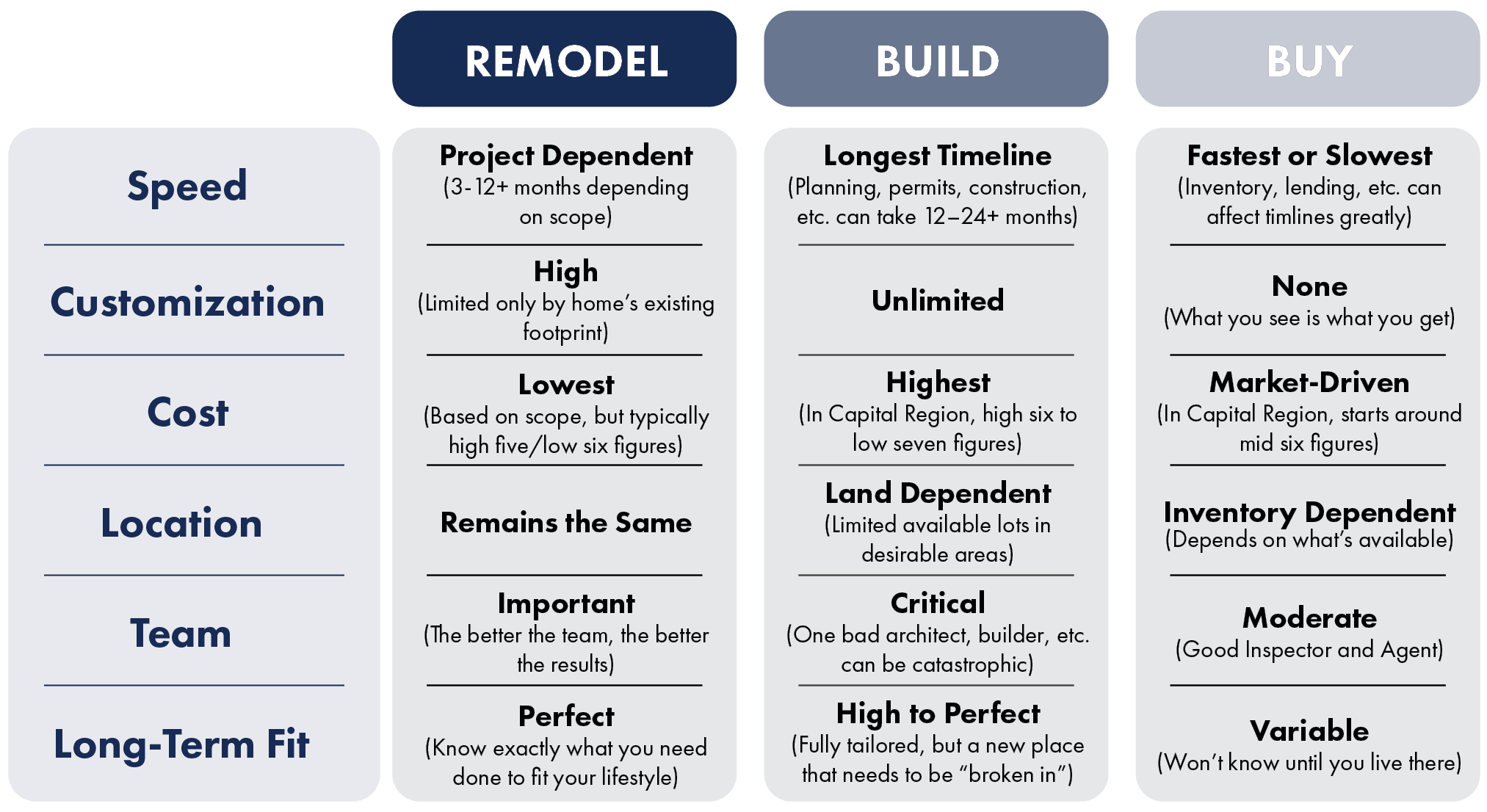 The first part of the remodeling journey for all our clients is to figure out whether we are a good fit for each other. And for us, we want to figure out if remodeling your home is right for you. But you should consider all your options: remodeling, building, or buying a home. Because each option comes with its own benefits, challenges, and long-term implications. And even though we’d prefer you to remodel with us, we really want to help you find what fits your lifestyle best.