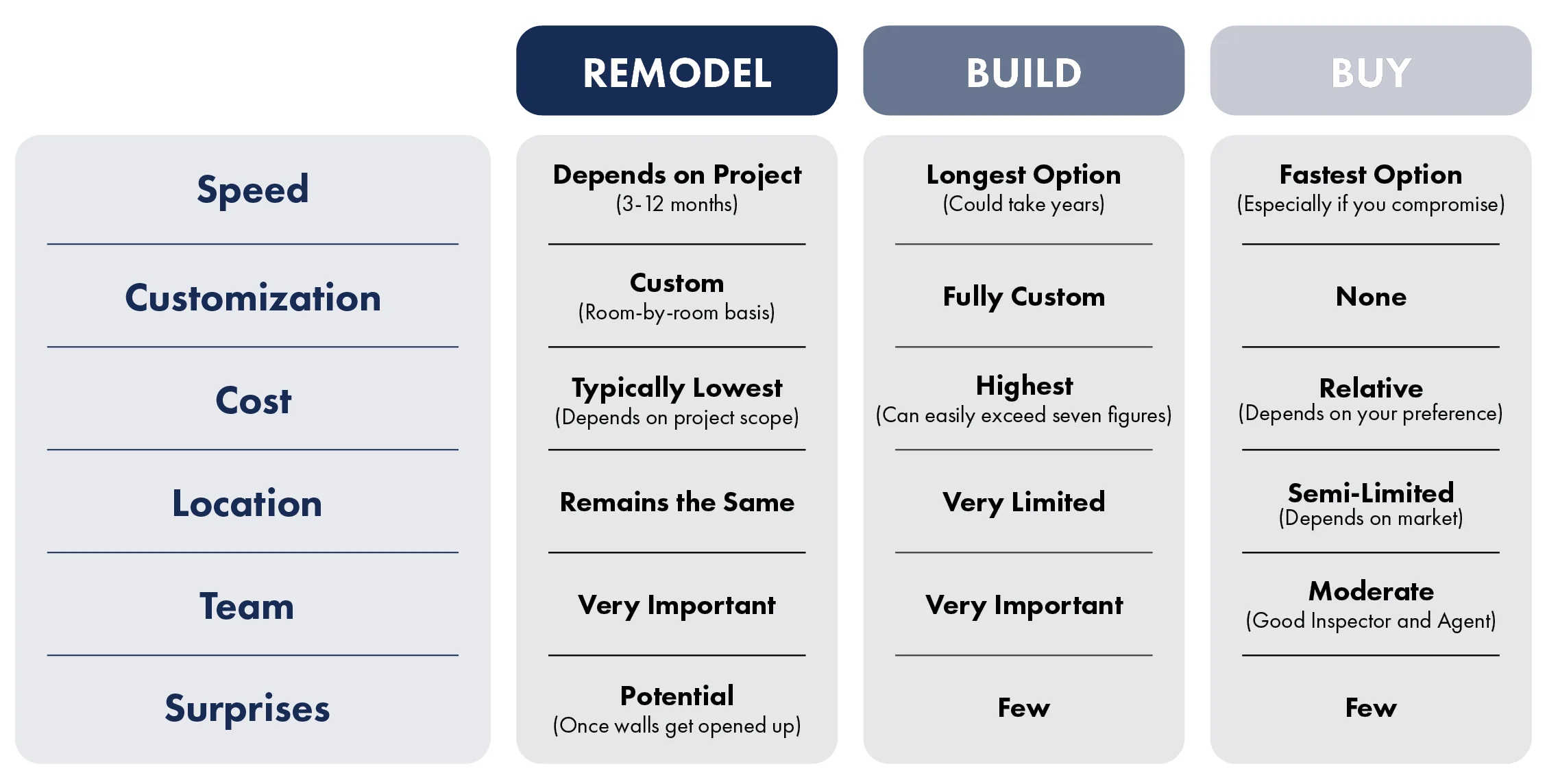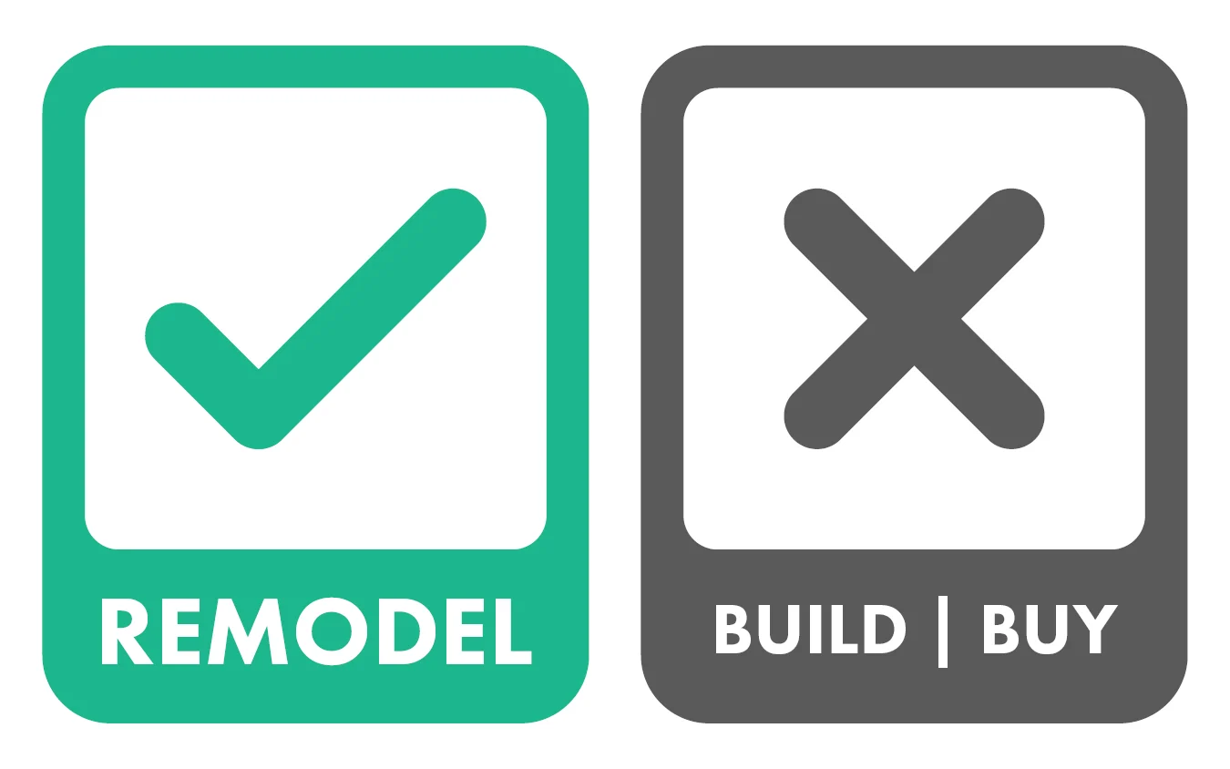The first part of the remodeling journey for all our clients is to figure out whether we are a good fit for each other. And for us, we want to figure out if remodeling your home is right for you. But you should consider all your options: remodeling, building, or buying a home. Because each option comes with its own benefits, challenges, and long-term implications. And even though we’d prefer you to remodel with us, we really want to help you find what fits your lifestyle best.